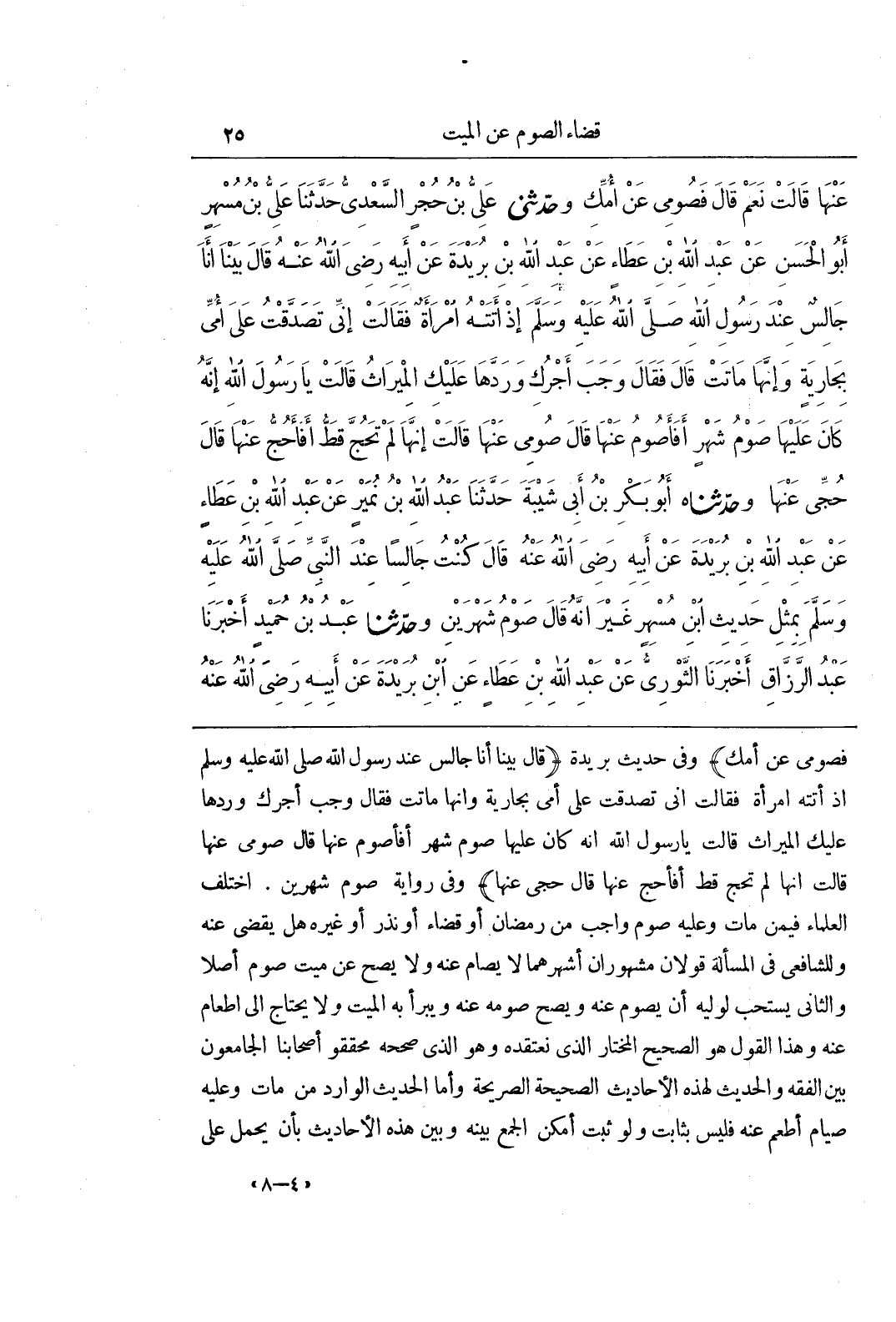 [1149] وَفِي حَدِيثِ بُرَيْدَةَ (قَالَ بَيْنَا أَنَا جَالِسٌ عِنْدَ رَسُولِ اللَّهِ صَلَّى اللَّهُ عَلَيْهِ وَسَلَّمَ إِذْ أَتَتْهُ امْرَأَةٌ فَقَالَتْ إِنِّي تَصَدَّقْتُ عَلَى أُمِّي بِجَارِيَةٍ وَإِنَّهَا مَاتَتْ فَقَالَ وَجَبَ أَجْرُكِ وَرَدَّهَا عَلَيْكِ الْمِيرَاثُ قَالَتْ يَا رَسُولَ اللَّهِ إِنَّهُ كَانَ عَلَيْهَا صَوْمُ شَهْرٍ أَفَأَصُومُ عَنْهَا قَالَ صُومِي عَنْهَا قَالَتْ إِنَّهَا لَمْ تَحُجَّ قَطُّ أَفَأَحُجُّ عَنْهَا قَالَ حُجِّي عَنْهَا) وَفِي رِوَايَةٍ صَوْمُ شَهْرَيْنِ اخْتَلَفَ الْعُلَمَاءُ فِيمَنْ مَاتَ وَعَلَيْهِ صَوْمٌ وَاجِبٌ مِنْ رَمَضَانَ أَوْ قَضَاءٌ أَوْ نَذْرٌ أَوْ غَيْرُهُ هَلْ يُقْضَى عَنْهُ وَلِلشَّافِعِيِّ فِي الْمَسْأَلَةِ قَوْلَانِ مَشْهُورَانِ أَشْهَرُهُمَا لَا يُصَامُ عَنْهُ وَلَا يَصِحُّ عَنْ مَيِّتٍ صَوْمٌ أَصْلًا وَالثَّانِي يُسْتَحَبُّ لِوَلِيِّهِ أَنْ يَصُومَ عَنْهُ وَيَصِحُّ صَوْمُهُ عَنْهُ وَيَبْرَأُ بِهِ الْمَيِّتُ وَلَا يَحْتَاجُ إِلَى إِطْعَامٍ عَنْهُ وَهَذَا الْقَوْلُ هُوَ الصَّحِيحُ الْمُخْتَارُ الَّذِي نَعْتَقِدُهُ وَهُوَ الَّذِي صَحَّحَهُ مُحَقِّقُو أَصْحَابِنَا الْجَامِعُونَ بَيْنَ الْفِقْهِ وَالْحَدِيثِ لِهَذِهِ الْأَحَادِيثِ الصَّحِيحَةِ الصَّرِيحَةِ وَأَمَّا الْحَدِيثُ الْوَارِدُ مَنْ مَاتَ وَعَلَيْهِ صِيَامٌ أُطْعِمَ عَنْهُ فَلَيْسَ بِثَابِتٍ وَلَوْ ثَبَتَ أَمْكَنَ الْجَمْعُ بَيْنَهُ وَبَيْنَ هَذِهِ الْأَحَادِيثِ بِأَنْ يُحْمَلَ عَلَى