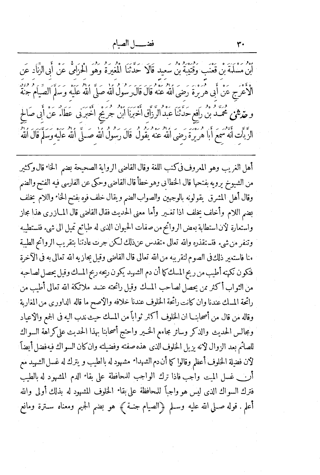 أَهْلِ الْغَرِيبِ وَهُوَ الْمَعْرُوفُ فِي كُتُبِ اللُّغَةِ وَقَالَ الْقَاضِي الرِّوَايَةُ الصَّحِيحَةُ بِضَمِّ الْخَاءِ قَالَ وَكَثِيرٌ مِنَ الشُّيُوخِ يَرْوِيهِ بِفَتْحِهَا قَالَ الْخَطَّابِيُّ وَهُوَ خَطَأٌ قَالَ الْقَاضِي وَحُكِيَ عَنِ الْفَارِسِيِّ فِيهِ الْفَتْحُ وَالضَّمُّ وَقَالَ أَهْلُ الْمَشْرِقِ يَقُولُونَهُ بِالْوَجْهَيْنِ وَالصَّوَابُ الضَّمُّ وَيُقَالُ خَلَفَ فُوهُ بِفَتْحِ الخاء واللام يخلف بضم اللام وأخلف يَخْلُفُ إِذَا تَغَيَّرَ وَأَمَّا مَعْنَى الْحَدِيثِ فَقَالَ الْقَاضِي قَالَ الْمَازِرِيُّ هَذَا مَجَازٌ وَاسْتِعَارَةٌ لِأَنَّ اسْتِطَابَةَ بَعْضِ الرَّوَائِحِ مِنْ صِفَاتِ الْحَيَوَانِ الَّذِي له طبائع تميل إلى شئ فَتَسْتَطِيبُهُ وَتَنْفِرُ مِنْ شَيْءٍ فَتَسْتَقْذِرُهُ وَاللَّهُ تَعَالَى مُتَقَدِّسٌ عَنْ ذَلِكَ لَكِنْ جَرَتْ عَادَتُنَا بِتَقْرِيبِ الرَّوَائِحِ الطَّيِّبَةِ مِنَّا فَاسْتُعِيرَ ذَلِكَ فِي الصَّوْمِ لِتَقْرِيبِهِ مِنَ اللَّهِ تَعَالَى قَالَ الْقَاضِي وَقِيلَ يُجَازِيهِ اللَّهُ تَعَالَى بِهِ فِي الْآخِرَةِ فَتَكُونُ نَكْهَتُهُ أَطْيَبَ مِنْ رِيحِ الْمِسْكِ كَمَا أَنَّ دَمَ الشَّهِيدِ يَكُونُ رِيحُهُ رِيحَ الْمِسْكِ وَقِيلَ يحصل لصاحبه من الثواب أكثر ممن يَحْصُلُ لِصَاحِبِ الْمِسْكِ وَقِيلَ رَائِحَتُهُ عِنْدَ مَلَائِكَةِ اللَّهِ تَعَالَى أَطْيَبُ مِنْ رَائِحَةِ الْمِسْكِ عِنْدَنَا وَإِنْ كَانَتْ رَائِحَةُ الْخُلُوفِ عِنْدَنَا خِلَافَهُ وَالْأَصَحُّ ما قاله الداورى مِنَ الْمَغَارِبَةِ وَقَالَهُ مَنْ قَالَ مِنْ أَصْحَابِنَا إِنَّ الْخُلُوفَ أَكْثَرُ ثَوَابًا مِنَ الْمِسْكِ حَيْثُ نُدِبَ إِلَيْهِ فِي الْجُمَعِ وَالْأَعْيَادِ وَمَجَالِسِ الْحَدِيثِ وَالذِّكْرِ وَسَائِرِ مَجَامِعِ الْخَيْرِ وَاحْتَجَّ أَصْحَابُنَا بِهَذَا الْحَدِيثِ عَلَى كَرَاهَةِ السِّوَاكِ لِلصَّائِمِ بَعْدَ الزَّوَالِ لِأَنَّهُ يُزِيلُ الْخُلُوفَ الَّذِي هَذِهِ صِفَتُهُ وَفَضِيلَتُهُ وَإِنْ كَانَ السِّوَاكُ فِيهِ فَضْلٌ أَيْضًا لِأَنَّ فَضِيلَةَ الْخُلُوفِ أَعْظَمُ وَقَالُوا كَمَا أَنَّ دَمَ الشُّهَدَاءِ مَشْهُودٌ لَهُ بِالطِّيبِ وَيُتْرَكُ لَهُ غُسْلُ الشَّهِيدِ مَعَ أَنَّ غُسْلَ الْمَيِّتِ وَاجِبٌ فَإِذَا تُرِكَ الْوَاجِبُ لِلْمُحَافَظَةِ عَلَى بَقَاءِ الدَّمِ الْمَشْهُودِ لَهُ بِالطِّيبِ فَتَرْكُ السِّوَاكِ الَّذِي لَيْسَ هُوَ وَاجِبًا لِلْمُحَافَظَةِ عَلَى بَقَاءِ الْخُلُوفِ الْمَشْهُودِ لَهُ بِذَلِكَ أَوْلَى وَاللَّهُ أَعْلَمُ قَوْلُهُ صَلَّى اللَّهُ عَلَيْهِ وَسَلَّمَ (الصِّيَامُ جُنَّةٌ) هُوَ بِضَمِّ الْجِيمِ وَمَعْنَاهُ سُتْرَةٌ وَمَانِعٌ