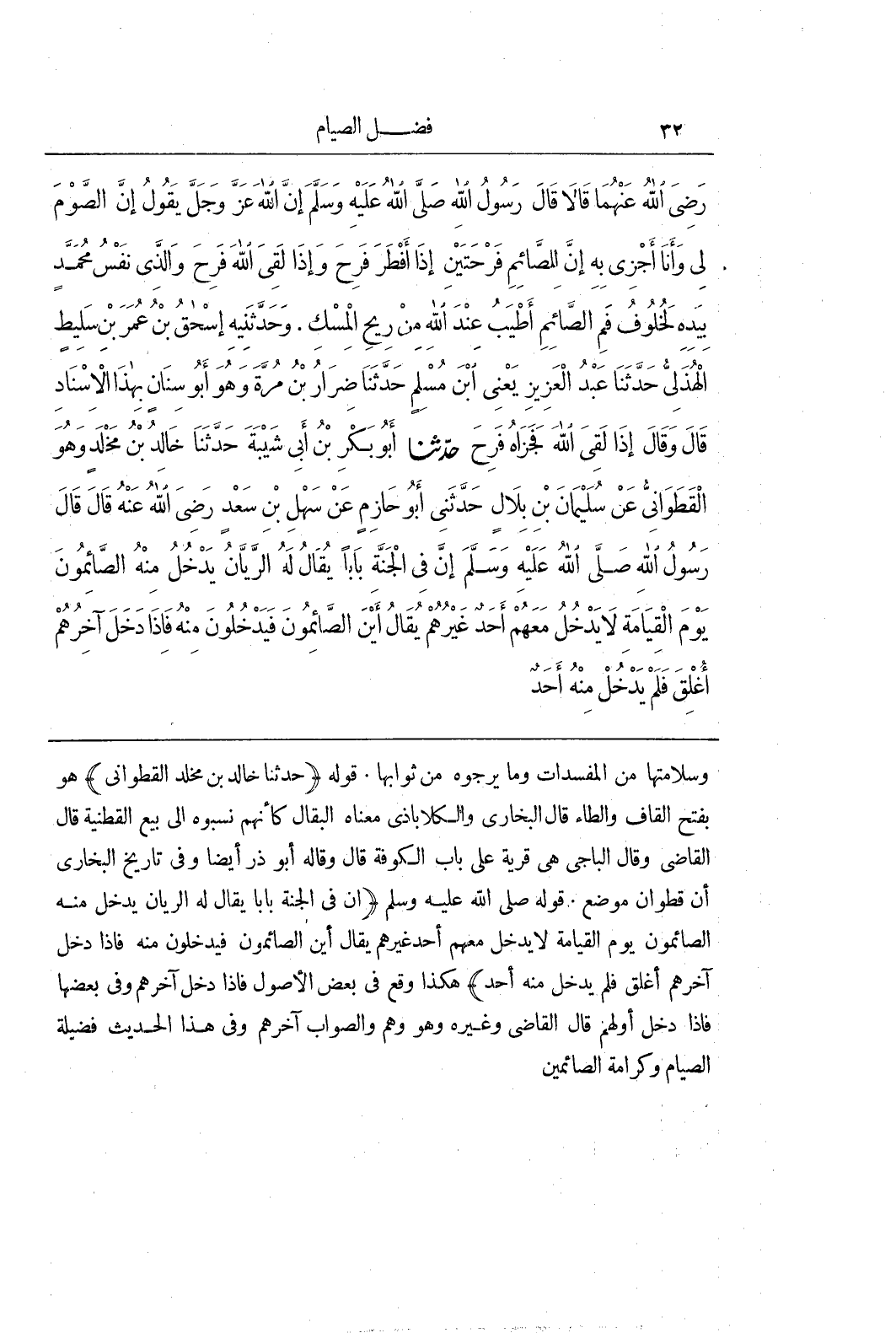 [1152] قَوْلُهُ (حَدَّثَنَا خَالِدُ بْنُ مَخْلَدٍ الْقَطَوَانِيُّ) هُوَ بِفَتْحِ الْقَافِ وَالطَّاءِ قَالَ الْبُخَارِيُّ وَالْكَلَابَاذِيُّ مَعْنَاهُ الْبَقَّالُ كَأَنَّهُمْ نَسَبُوهُ إِلَى بَيْعِ الْقُطْنِيَّةِ قَالَ الْقَاضِي وَقَالَ الْبَاجِيُّ هِيَ قَرْيَةٌ عَلَى بَابِ الْكُوفَةِ قَالَ وَقَالَهُ أَبُو ذَرٍّ أَيْضًا وَفِي تَارِيخِ الْبُخَارِيِّ أَنَّ قَطَوَانَ مَوْضِعٌ قَوْلُهُ صَلَّى اللَّهُ عَلَيْهِ وَسَلَّمَ (إِنَّ فِي الْجَنَّةِ بَابًا يُقَالُ لَهُ الرَّيَّانُ يَدْخُلُ مِنْهُ الصَّائِمُونَ يَوْمَ الْقِيَامَةِ لَا يَدْخُلُ مَعَهُمْ أَحَدٌ غَيْرُهُمْ يُقَالُ أَيْنَ الصَّائِمُونَ فَيَدْخُلُونَ مِنْهُ فَإِذَا دَخَلَ آخِرُهُمْ أُغْلِقَ فَلَمْ يَدْخُلْ مِنْهُ أَحَدٌ) هَكَذَا وَقَعَ فِي بَعْضِ الْأُصُولِ فَإِذَا دَخَلَ آخِرُهُمْ وَفِي بَعْضِهَا فَإِذَا دَخَلَ أَوَّلُهُمْ قَالَ الْقَاضِي وَغَيْرُهُ وهو وهم والصواب آخِرُهُمْ وَفِي هَذَا الْحَدِيثِ فَضِيلَةُ الصِّيَامِ وَكَرَامَةُ الصائمين
