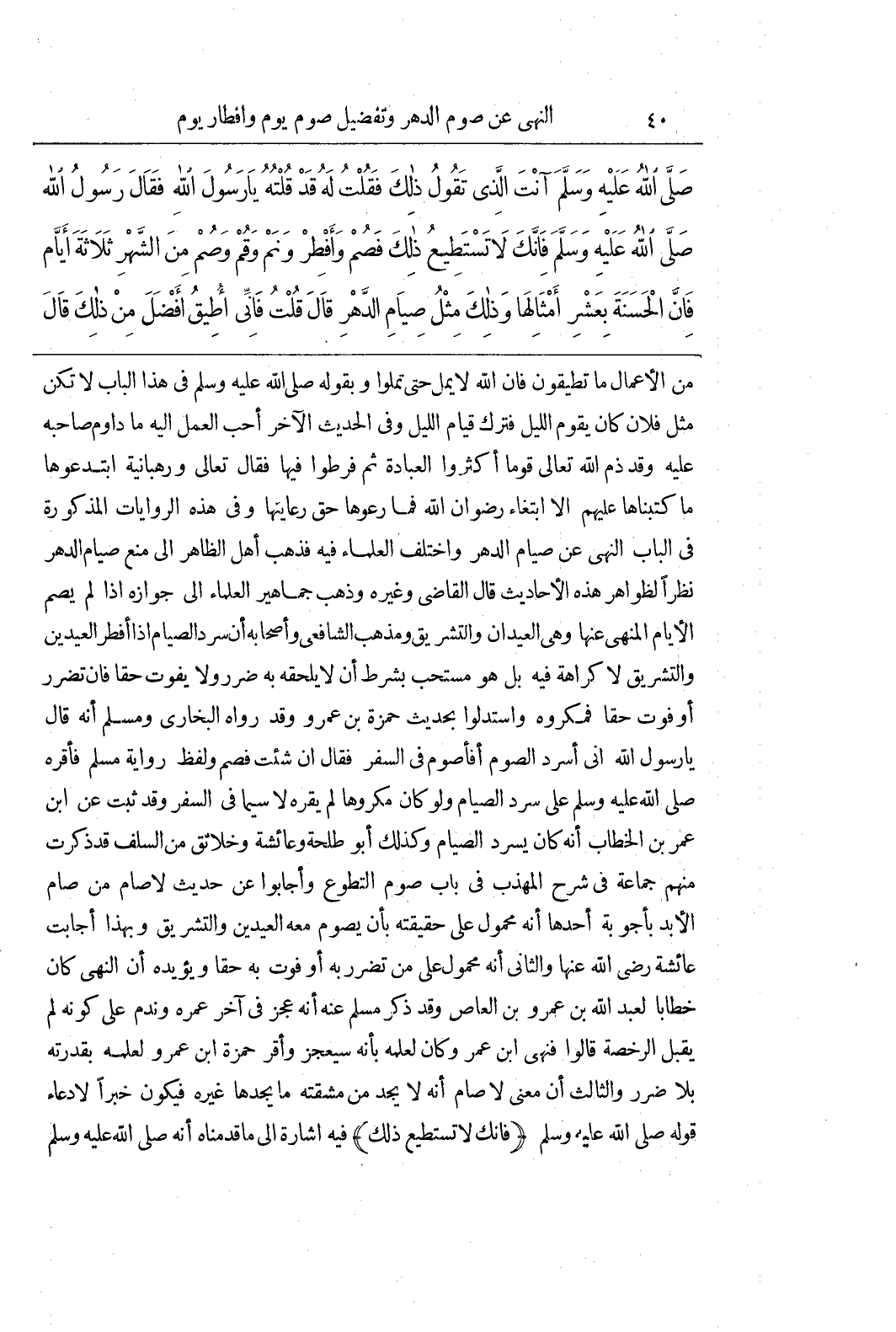 مِنَ الْأَعْمَالِ مَا تُطِيقُونَ فَإِنَّ اللَّهَ لَا يَمَلُّ حَتَّى تَمَلُّوا وَبِقَوْلِهِ صَلَّى اللَّهُ عَلَيْهِ وَسَلَّمَ فِي هَذَا الْبَابِ لَا تَكُنْ مِثْلَ فُلَانٍ كَانَ يَقُومُ اللَّيْلَ فَتَرَكَ قِيَامَ اللَّيْلِ وَفِي الْحَدِيثِ الْآخَرِ أَحَبُّ الْعَمَلِ إِلَيْهِ مَا دَاوَمَ صَاحِبُهُ عَلَيْهِ وَقَدْ ذَمَّ اللَّهُ تَعَالَى قَوْمًا أَكْثَرُوا الْعِبَادَةَ ثُمَّ فَرَّطُوا فِيهَا فَقَالَ تَعَالَى وَرَهْبَانِيَّةً ابْتَدَعُوهَا مَا كَتَبْنَاهَا عَلَيْهِمْ إِلَّا ابْتِغَاءَ رِضْوَانِ اللَّهِ فَمَا رَعَوْهَا حَقَّ رِعَايَتِهَا وَفِي هَذِهِ الرِّوَايَاتِ الْمَذْكُورَةِ فِي الْبَابِ النَّهْيُ عَنْ صِيَامِ الدَّهْرِ وَاخْتَلَفَ الْعُلَمَاءُ فِيهِ فَذَهَبَ أَهْلُ الظَّاهِرِ إِلَى مَنْعِ صِيَامِ الدَّهْرِ نَظَرًا لِظَوَاهِرِ هَذِهِ الْأَحَادِيثِ قَالَ الْقَاضِي وَغَيْرُهُ وَذَهَبَ جَمَاهِيرُ الْعُلَمَاءِ إِلَى جَوَازِهِ إِذَا لَمْ يَصُمِ الْأَيَّامَ الْمَنْهِيَّ عَنْهَا وَهِيَ الْعِيدَانِ وَالتَّشْرِيقُ وَمَذْهَبُ الشَّافِعِيِّ وَأَصْحَابِهِ أَنَّ سَرْدَ الصِّيَامِ إِذَا أَفْطَرَ الْعِيدَيْنِ وَالتَّشْرِيقَ لَا كَرَاهَةَ فِيهِ بَلْ هُوَ مُسْتَحَبٌّ بِشَرْطِ أَنْ لَا يَلْحَقَهُ بِهِ ضَرَرٌ وَلَا يُفَوِّتَ حَقًّا فَإِنْ تَضَرَّرَ أَوْ فَوَّتَ حَقًّا فَمَكْرُوهٌ وَاسْتَدَلُّوا بِحَدِيثِ حَمْزَةَ بْنِ عَمْرٍو وَقَدْ رَوَاهُ الْبُخَارِيُّ وَمُسْلِمٌ أَنَّهُ قَالَ يَا رَسُولَ اللَّهِ إِنِّي أَسْرُدُ الصَّوْمَ أَفَأَصُومُ فِي السَّفَرِ فَقَالَ إِنْ شِئْتَ فَصُمْ وَلَفْظُ رِوَايَةِ مُسْلِمٍ فَأَقَرَّهُ صَلَّى اللَّهُ عَلَيْهِ وَسَلَّمَ عَلَى سَرْدِ الصِّيَامِ وَلَوْ كَانَ مَكْرُوهًا لَمْ يُقِرَّهُ لَا سِيَّمَا فِي السَّفَرِ وَقَدْ ثَبَتَ عَنِ بن عُمَرَ بْنِ الْخَطَّابِ أَنَّهُ كَانَ يَسْرُدُ الصِّيَامَ وَكَذَلِكَ أَبُو طَلْحَةَ وَعَائِشَةُ وَخَلَائِقُ مِنَ السَّلَفِ قَدْ ذَكَرْتُ مِنْهُمْ جَمَاعَةً فِي شَرْحِ الْمُهَذَّبِ فِي بَابِ صَوْمِ التَّطَوُّعِ وَأَجَابُوا عَنْ حَدِيثِ لَا صَامَ مَنْ صَامَ الْأَبَدَ بِأَجْوِبَةٍ أَحَدُهَا أَنَّهُ مَحْمُولٌ عَلَى حَقِيقَتِهِ بِأَنْ يَصُومَ مَعَهُ الْعِيدَيْنِ وَالتَّشْرِيقَ وَبِهَذَا أَجَابَتْ عَائِشَةُ رَضِيَ اللَّهُ عَنْهَا وَالثَّانِي أَنَّهُ مَحْمُولٌ عَلَى مَنْ تَضَرَّرَ بِهِ أَوْ فَوَّتَ بِهِ حَقًّا وَيُؤَيِّدُهُ أَنَّ النَّهْيَ كَانَ خِطَابًا لِعَبْدِ اللَّهِ بْنِ عَمْرِو بْنِ الْعَاصِ وَقَدْ ذَكَرَ مُسْلِمٌ عَنْهُ أَنَّهُ عَجَزَ فِي آخِرِ عُمُرِهِ وَنَدِمَ عَلَى كَوْنِهِ لم يقبل الرخصة قالوا فنهى بن عمر وكان لِعِلْمِهِ بِأَنَّهُ سَيَعْجَزُ وَأَقَرَّ حَمْزَةَ بْنَ عَمْرٍو لِعِلْمِهِ بِقُدْرَتِهِ بِلَا ضَرَرٍ وَالثَّالِثَ أَنَّ مَعْنَى لَا صَامَ أَنَّهُ لَا يَجِدُ مِنْ مَشَقَّتِهِ مَا يَجِدُهَا غَيْرُهُ فَيَكُونُ خَبَرًا لَا دُعَاءً