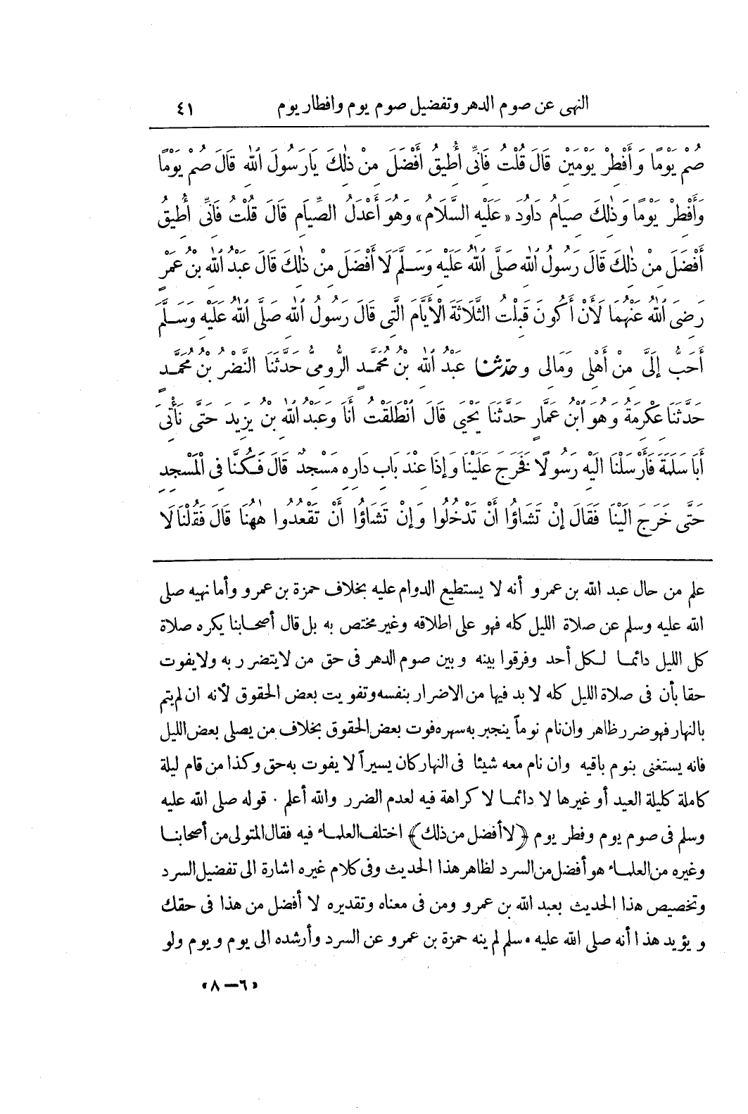 عَلِمَ مِنْ حَالِ عَبْدِ اللَّهِ بْنِ عَمْرٍو أَنَّهُ لَا يَسْتَطِيعُ الدَّوَامَ عَلَيْهِ بِخِلَافِ حَمْزَةَ بْنِ عَمْرٍو وَأَمَّا نَهْيُهُ صَلَّى اللَّهُ عَلَيْهِ وَسَلَّمَ عَنْ صَلَاةِ اللَّيْلِ كُلِّهِ فَهُوَ عَلَى اطلاقه وغير مُخْتَصٍّ بِهِ بَلْ قَالَ أَصْحَابُنَا يُكْرَهُ صَلَاةُ كُلِّ اللَّيْلِ دَائِمًا لِكُلِّ أَحَدٍ وَفَرَّقُوا بَيْنَهُ وَبَيْنَ صَوْمِ الدَّهْرِ فِي حَقِّ مَنْ لَا يَتَضَرَّرُ بِهِ وَلَا يُفَوِّتُ حَقًّا بِأَنَّ فِي صَلَاةِ اللَّيْلِ كُلِّهِ لَا بُدَّ فِيهَا مِنَ الْإِضْرَارِ بِنَفْسِهِ وَتَفْوِيتِ بَعْضِ الْحُقُوقِ لِأَنَّهُ إِنْ لَمْ يَنَمْ بِالنَّهَارِ فَهُوَ ضَرَرٌ ظَاهِرٌ وَإِنْ نَامَ نَوْمًا يَنْجَبِرُ بِهِ سَهَرُهُ فَوَّتَ بَعْضَ الْحُقُوقِ بِخِلَافِ مَنْ يُصَلِّي بَعْضَ اللَّيْلِ فَإِنَّهُ يَسْتَغْنِي بِنَوْمِ بَاقِيهِ وَإِنْ نَامَ مَعَهُ شَيْئًا فِي النَّهَارِ كَانَ يَسِيرًا لَا يَفُوتُ بِهِ حَقٌّ وَكَذَا مَنْ قَامَ لَيْلَةً كَامِلَةً كَلَيْلَةِ الْعِيدِ أَوْ غَيْرِهَا لَا دَائِمًا لَا كَرَاهَةَ فِيهِ لِعَدَمِ الضَّرَرِ وَاللَّهُ أَعْلَمُ قَوْلُهُ صَلَّى اللَّهُ عَلَيْهِ وَسَلَّمَ فِي صَوْمِ يَوْمٍ وَفِطْرِ يَوْمٍ (لَا أَفْضَلَ مِنْ ذَلِكَ) اخْتَلَفَ الْعُلَمَاءُ فِيهِ فَقَالَ الْمُتَوَلِّي مِنْ أَصْحَابِنَا وَغَيْرُهُ مِنَ الْعُلَمَاءِ هُوَ أَفْضَلُ مِنَ السَّرْدِ لِظَاهِرِ هَذَا الْحَدِيثِ وَفِي كَلَامِ غَيْرِهِ إِشَارَةٌ إِلَى تَفْضِيلِ السَّرْدِ وَتَخْصِيصُ هَذَا الْحَدِيثِ بِعَبْدِ اللَّهِ بْنِ عَمْرٍو وَمَنْ فِي مَعْنَاهُ وَتَقْدِيرُهُ لَا أَفْضَلَ مِنْ هَذَا فِي حَقِّكَ وَيُؤَيِّدُ هَذَا أَنَّهُ صَلَّى اللَّهُ عَلَيْهِ وَسَلَّمَ لَمْ يَنْهَ حَمْزَةَ بْنَ عَمْرٍو عَنِ السَّرْدِ وَأَرْشَدَهُ إِلَى يَوْمٍ ويوم ولو