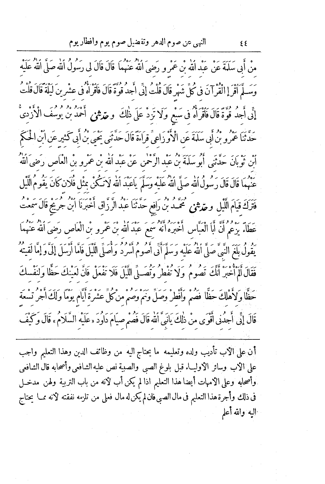 أَنَّ عَلَى الْأَبِ تَأْدِيبَ وَلَدِهِ وَتَعْلِيمَهُ مَا يَحْتَاجُ إِلَيْهِ مِنْ وَظَائِفِ الدِّينِ وَهَذَا التَّعْلِيمُ وَاجِبٌ عَلَى الْأَبِ وَسَائِرِ الْأَوْلِيَاءِ قَبْلَ بُلُوغِ الصَّبِيِّ وَالصَّبِيَّةِ نَصَّ عَلَيْهِ الشَّافِعِيُّ وَأَصْحَابُهُ قَالَ الشَّافِعِيُّ وَأَصْحَابُهُ وَعَلَى الْأُمَّهَاتِ أَيْضًا هَذَا التَّعْلِيمُ إِذَا لَمْ يَكُنْ أَبٌ لِأَنَّهُ مِنْ بَابِ التَّرْبِيَةِ وَلَهُنَّ مَدْخَلٌ فِي ذَلِكَ وَأُجْرَةُ هَذَا التَّعْلِيمِ فِي مَالِ الصَّبِيِّ فَإِنْ لَمْ يَكُنْ لَهُ مَالٌ فَعَلَى مَنْ تَلْزَمُهُ نَفَقَتُهُ لِأَنَّهُ مِمَّا يَحْتَاجُ إِلَيْهِ وَاللَّهُ أَعْلَمُ