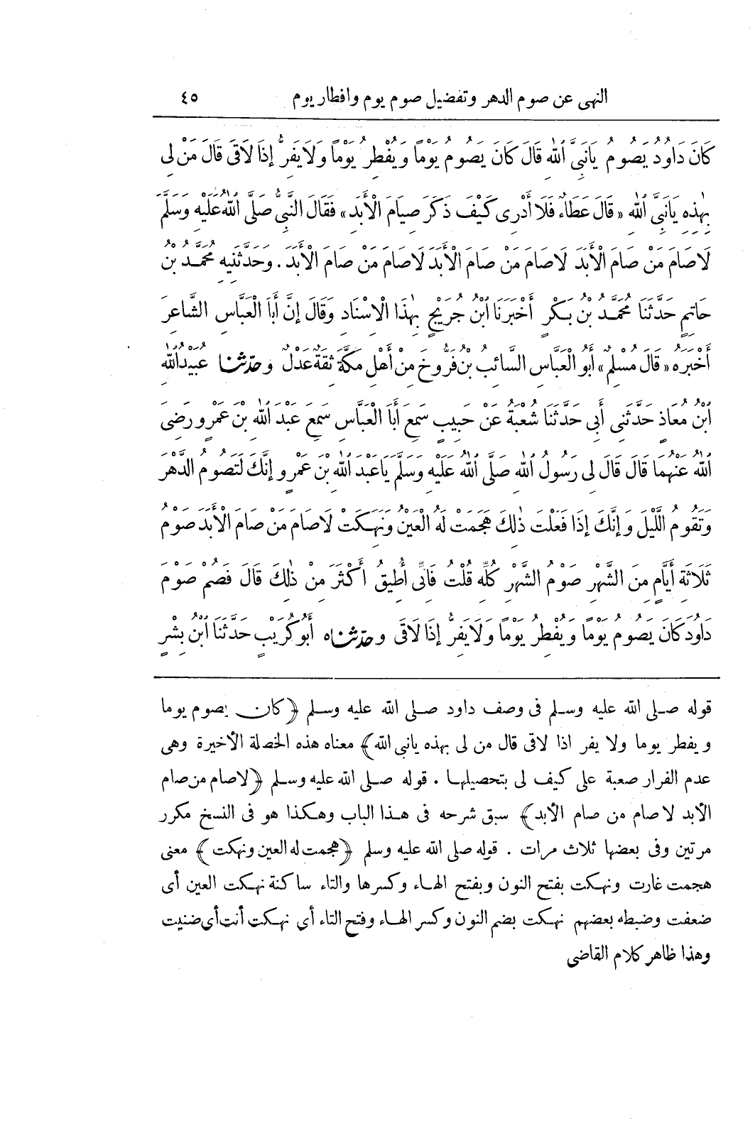 قَوْلُهُ صَلَّى اللَّهُ عَلَيْهِ وَسَلَّمَ فِي وَصْفِ دَاوُدَ صَلَّى اللَّهُ عَلَيْهِ وَسَلَّمَ (كَانَ يَصُومُ يَوْمًا وَيُفْطِرُ يَوْمًا وَلَا يَفِرُّ إِذَا لَاقَى قَالَ مَنْ لِي بِهَذِهِ يَا نَبِيَّ اللَّهِ) مَعْنَاهُ هَذِهِ الْخَصْلَةُ الْأَخِيرَةُ وَهِيَ عَدَمُ الْفِرَارِ صَعْبَةٌ عَلَيَّ كَيْفَ لِي بِتَحْصِيلِهَا قَوْلُهُ صَلَّى اللَّهُ عَلَيْهِ وَسَلَّمَ (لَا صَامَ مَنْ صَامَ الْأَبَدَ لَا صَامَ مَنْ صَامَ الْأَبَدَ) سَبَقَ شَرْحُهُ فِي هَذَا الْبَابِ وَهَكَذَا هُوَ فِي النُّسَخِ مُكَرَّرٌ مَرَّتَيْنِ وَفِي بَعْضِهَا ثَلَاثَ مَرَّاتٍ قَوْلُهُ صَلَّى اللَّهُ عَلَيْهِ وَسَلَّمَ (هَجَمَتْ لَهُ الْعَيْنُ وَنَهَكَتْ) مَعْنَى هَجَمَتْ غَارَتْ وَنَهَكَتْ بِفَتْحِ النون وبفتح الهاء وكسرها والتاء ساكنة الْعَيْنُ أَيْ ضَعُفَتْ وَضَبَطَهُ بَعْضُهُمْ نُهِكْتَ بِضَمِّ النُّونِ وَكَسْرِ الْهَاءِ وَفَتْحِ التَّاءِ أَيْ نُهِكْتَ أَنْتَ أَيْ ضَنَيْتَ وَهَذَا ظَاهِرُ كَلَامِ الْقَاضِي