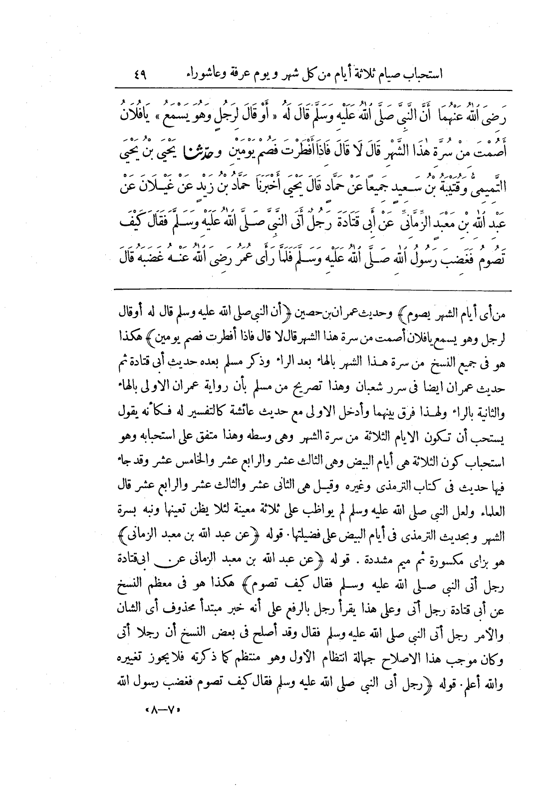 مِنْ أَيِّ أَيَّامِ الشَّهْرِ يَصُومُ) وَحَدِيثُ عِمْرَانَ بْنِ حُصَيْنٍ (أَنَّ النَّبِيَّ صَلَّى اللَّهُ عَلَيْهِ وَسَلَّمَ قَالَ لَهُ أَوْ قَالَ لِرَجُلٍ وَهُوَ يَسْمَعُ يَا فُلَانُ أَصُمْتَ مِنْ سُرَّةِ هَذَا الشَّهْرِ قَالَ لَا قَالَ فَإِذَا أَفْطَرْتَ فَصُمْ يَوْمَيْنِ) هَكَذَا هُوَ فِي جَمِيعِ النُّسَخِ مِنْ سُرَّةِ هَذَا الشَّهْرِ بِالْهَاءِ بَعْدَ الرَّاءِ وَذَكَرَ مُسْلِمٌ بَعْدَهُ حَدِيثَ أَبِي قَتَادَةَ ثُمَّ حَدِيثَ عِمْرَانَ أَيْضًا فِي سَرَرِ شَعْبَانَ وَهَذَا تَصْرِيحٌ مِنْ مُسْلِمٍ بِأَنَّ رِوَايَةَ عِمْرَانَ الْأُولَى بِالْهَاءِ وَالثَّانِيَةَ بِالرَّاءِ وَلِهَذَا فَرَّقَ بَيْنَهُمَا وَأَدْخَلَ الْأُولَى مَعَ حَدِيثِ عَائِشَةَ كَالتَّفْسِيرِ لَهُ فَكَأَنَّهُ يَقُولُ يُسْتَحَبُّ أَنْ تَكُونَ الْأَيَّامُ الثَّلَاثَةُ مِنْ سُرَّةِ الشَّهْرِ وَهِيَ وَسَطُهُ وَهَذَا مُتَّفَقٌ عَلَى اسْتِحْبَابِهِ وَهُوَ اسْتِحْبَابُ كَوْنِ الثَّلَاثَةِ هِيَ أَيَّامُ الْبِيضِ وَهِيَ الثَّالِثَ عَشَرَ وَالرَّابِعَ عَشَرَ وَالْخَامِسَ عَشَرَ وَقَدْ جَاءَ فِيهَا حَدِيثٌ فِي كِتَابِ التِّرْمِذِيِّ وَغَيْرِهِ وَقِيلَ هِيَ الثَّانِي عَشَرَ وَالثَّالِثَ عَشَرَ وَالرَّابِعَ عَشَرَ قَالَ الْعُلَمَاءُ وَلَعَلَّ النَّبِيَّ صَلَّى اللَّهُ عَلَيْهِ وَسَلَّمَ لَمْ يُوَاظِبْ عَلَى ثَلَاثَةٍ مُعَيَّنَةٍ لِئَلَّا يُظَنَّ تَعَيُّنُهَا وَنَبَّهَ بِسُرَّةِ الشَّهْرِ وَبِحَدِيثِ التِّرْمِذِيِّ فِي أَيَّامِ الْبِيضِ عَلَى فَضِيلَتِهَا