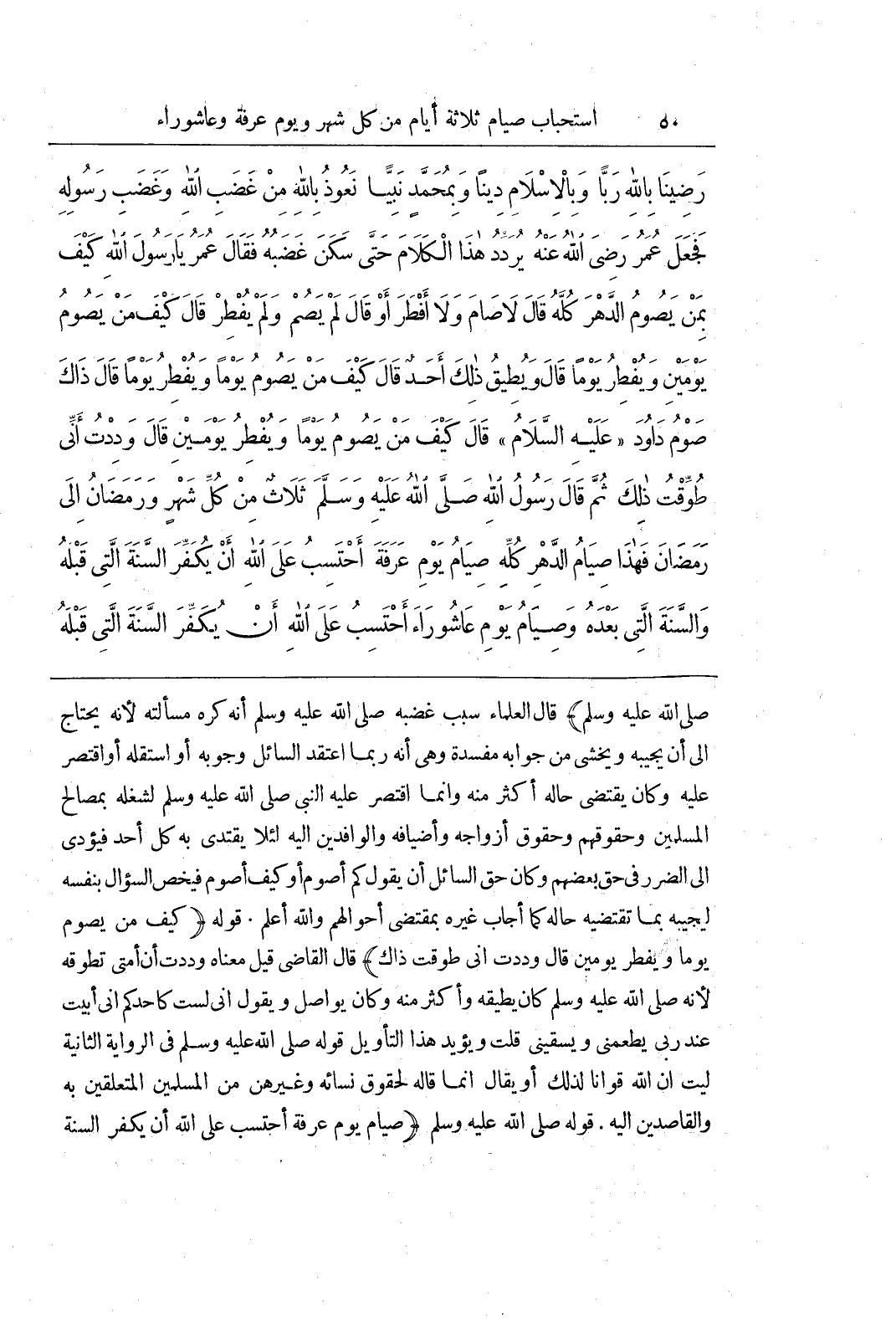 (قَالَ الْعُلَمَاءُ سَبَبُ غَضَبِهِ صَلَّى اللَّهُ عَلَيْهِ وَسَلَّمَ أَنَّهُ كَرِهَ مَسْأَلَتَهُ لِأَنَّهُ يَحْتَاجُ إِلَى أَنْ يُجِيبَهُ وَيَخْشَى مِنْ جَوَابِهِ مَفْسَدَةً وَهِيَ أَنَّهُ رُبَّمَا اعْتَقَدَ السَّائِلُ وُجُوبَهُ أَوِ اسْتَقَلَّهُ أَوِ اقْتَصَرَ عَلَيْهِ وَكَانَ يَقْتَضِي حَالُهُ أَكْثَرَ مِنْهُ وَإِنَّمَا اقْتَصَرَ عَلَيْهِ النَّبِيُّ صَلَّى اللَّهُ عَلَيْهِ وَسَلَّمَ لِشُغُلِهِ بِمَصَالِحِ الْمُسْلِمِينَ وَحُقُوقِهِمْ وَحُقُوقِ أَزْوَاجِهِ وَأَضْيَافِهِ وَالْوَافِدِينَ إِلَيْهِ لِئَلَّا يَقْتَدِيَ بِهِ كُلُّ أَحَدٍ فَيُؤَدِّيَ إِلَى الضَّرَرِ فِي حَقِّ بَعْضِهِمْ وَكَانَ حَقُّ السَّائِلِ أَنْ يَقُولَ كَمْ أَصُومُ أَوْ كَيْفَ أَصُومُ فَيَخُصُّ السُّؤَالَ بِنَفْسِهِ لِيُجِيبَهُ بِمَا تَقْتَضِيهِ حَالُهُ كَمَا أَجَابَ غَيْرَهُ بِمُقْتَضَى أَحْوَالِهِمْ وَاللَّهُ أَعْلَمُ قَوْلُهُ (كَيْفَ مَنْ يَصُومُ يَوْمًا وَيُفْطِرُ يَوْمَيْنِ قَالَ وَدِدْتُ أَنِّي طُوِّقْتُ ذَاكَ) قَالَ الْقَاضِي قِيلَ مَعْنَاهُ وَدِدْتُ أَنَّ أُمَّتِي تُطَوِّقُهُ لِأَنَّهُ صَلَّى اللَّهُ عَلَيْهِ وَسَلَّمَ كَانَ يُطِيقُهُ وَأَكْثَرَ مِنْهُ وَكَانَ يُوَاصِلُ وَيَقُولُ إِنِّي لَسْتُ كَأَحَدِكُمْ إِنِّي أَبِيتُ عِنْدَ رَبِّي يُطْعِمُنِي وَيَسْقِينِي قُلْتُ وَيُؤَيِّدُ هَذَا التَّأْوِيلَ قَوْلُهُ صَلَّى اللَّهُ عَلَيْهِ وَسَلَّمَ فِي الرِّوَايَةِ الثَّانِيَةِ لَيْتَ أَنَّ اللَّهَ قَوَّانَا لِذَلِكَ أَوْ يُقَالُ إِنَّمَا قَالَهُ لِحُقُوقِ نِسَائِهِ وَغَيْرِهِنَّ مِنَ الْمُسْلِمِينَ الْمُتَعَلِّقِينَ بِهِ وَالْقَاصِدِينَ إِلَيْهِ قَوْلُهُ صَلَّى اللَّهُ عَلَيْهِ وَسَلَّمَ (صِيَامُ يَوْمِ عَرَفَةَ أَحْتَسِبُ عَلَى اللَّهِ أَنْ يكفر السنة)