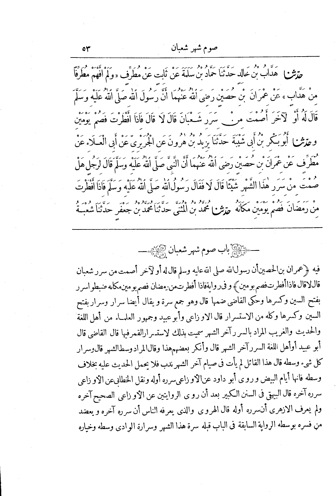 [1161] فِيهِ (عِمْرَانَ بْنِ الْحُصَيْنِ أَنَّ رَسُولَ اللَّهِ صَلَّى اللَّهُ عَلَيْهِ وَسَلَّمَ قَالَ لَهُ أَوْ لِآخَرَ أَصُمْتَ مِنْ سَرَرِ شَعْبَانَ قَالَ لَا قَالَ فَإِذَا أَفْطَرْتَ فَصُمْ يَوْمَيْنِ) وَفِي رِوَايَةٍ فَإِذَا أَفْطَرْتَ مِنْ رَمَضَانَ فَصُمْ يَوْمَيْنِ مَكَانَهُ ضَبَطُوا سَرَرِ بِفَتْحِ السِّينِ وَكَسْرِهَا وَحَكَى الْقَاضِي ضَمَّهَا قَالَ وَهُوَ جَمْعُ سُرَّةٍ وَيُقَالُ أَيْضًا سَرَارُ وَسِرَارُ بِفَتْحِ السِّينِ وَكَسْرِهَا وَكُلُّهُ مِنَ الِاسْتِسْرَارِ قَالَ الْأَوْزَاعِيُّ وَأَبُو عُبَيْدٍ وَجُمْهُورُ الْعُلَمَاءِ مِنْ أَهْلِ اللُّغَةِ وَالْحَدِيثِ وَالْغَرِيبِ الْمُرَادُ بِالسَّرَرِ آخِرُ الشَّهْرِ سُمِّيَتْ بِذَلِكَ لِاسْتِسْرَارِ الْقَمَرِ فِيهَا قَالَ الْقَاضِي قَالَ أَبُو عُبَيْدٍ وَأَهْلُ اللُّغَةِ السَّرَرُ آخِرُ الشَّهْرِ قَالَ وَأَنْكَرَ بَعْضُهُمْ هَذَا وَقَالَ الْمُرَادُ وَسَطُ الشهر قال وسرار كل شئ وَسَطُهُ قَالَ هَذَا الْقَائِلُ لَمْ يَأْتِ فِي صِيَامِ آخِرِ الشَّهْرِ نَدْبٌ فَلَا يُحْمَلُ الْحَدِيثُ عَلَيْهِ بِخِلَافِ وَسَطِهِ فَإِنَّهَا أَيَّامُ الْبِيضِ وَرَوَى أَبُو دَاوُدَ عَنِ الْأَوْزَاعِيِّ سَرَرُهُ أَوَّلُهُ وَنَقَلَ الْخَطَّابِيُّ عَنِ الْأَوْزَاعِيِّ سَرَرُهُ آخِرُهُ قَالَ الْبَيْهَقِيُّ فِي السُّنَنِ الْكَبِيرِ بَعْدَ أَنْ رَوَى الرِّوَايَتَيْنِ عَنِ الْأَوْزَاعِيِّ الصَّحِيحُ آخِرُهُ وَلَمْ يَعْرِفِ الْأَزْهَرِيُّ أَنَّ سَرَرَهُ أَوَّلُهُ قَالَ الْهَرَوِيُّ وَالَّذِي يَعْرِفُهُ النَّاسُ أَنَّ سَرَرَهُ آخِرُهُ وَيُعَضِّدُ مَنْ فَسَّرَهُ بِوَسَطِهِ الرِّوَايَةُ السَّابِقَةُ فِي الْبَابِ قَبْلَهُ سُرَّةِ هَذَا الشَّهْرِ وَسَرَارَةُ الْوَادِي وَسَطُهُ وَخِيَارُهُ)