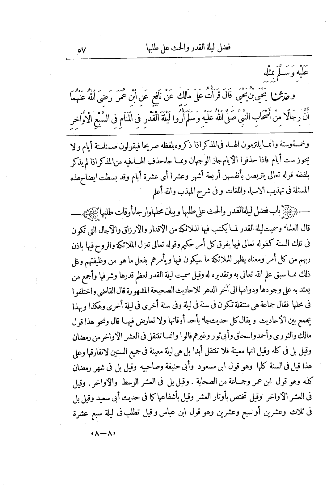 (باب فَضْلِ لَيْلَةِ الْقَدْرِ والحث على طلبها وبيان محلها وارجاء أَوْقَاتِ طَلَبِهَا قَالَ الْعُلَمَاءُ وَسُمِّيَتْ لَيْلَةُ الْقَدْرِ لِمَا يُكْتَبُ فِيهَا لِلْمَلَائِكَةِ مِنَ الْأَقْدَارِ وَالْأَرْزَاقِ وَالْآجَالِ الَّتِي تَكُونُ فِي تِلْكَ السَّنَةِ كَقَوْلِهِ تعالى فيها يفرق كل أمر حكيم وَقَوْلِهِ تَعَالَى تَنَزَّلُ الْمَلَائِكَةُ وَالرُّوحُ فِيهَا بِإِذْنِ ربهم من كل أمر وَمَعْنَاهُ يُظْهِرُ لِلْمَلَائِكَةِ مَا سَيَكُونُ فِيهَا وَيَأْمُرُهُمْ بِفِعْلِ مَا هُوَ مِنْ وَظِيفَتِهِمْ وَكُلُّ ذَلِكَ مِمَّا سَبَقَ عِلْمُ اللَّهِ تَعَالَى بِهِ وَتَقْدِيرُهُ لَهُ وَقِيلَ سُمِّيَتْ لَيْلَةُ الْقَدْرِ لِعِظَمِ قَدْرِهَا وَشَرَفِهَا وَأَجْمَعَ مَنْ يُعْتَدُّ بِهِ عَلَى وُجُودِهَا وَدَوَامِهَا إِلَى آخِرِ الدَّهْرِ لِلْأَحَادِيثِ الصَّحِيحَةِ الْمَشْهُورَةِ قَالَ الْقَاضِي وَاخْتَلَفُوا فِي مَحَلِّهَا فَقَالَ جَمَاعَةٌ هِيَ مُنْتَقِلَةٌ تَكُونُ فِي سَنَةٍ فِي لَيْلَةٍ وَفِي سَنَةٍ أُخْرَى فِي لَيْلَةٍ أُخْرَى وَهَكَذَا وَبِهَذَا يُجْمَعُ بَيْنَ الْأَحَادِيثِ وَيُقَالُ كُلُّ حَدِيثٍ جَاءَ بِأَحَدِ أَوْقَاتِهَا وَلَا تَعَارُضَ فِيهَا قَالَ وَنَحْوُ هَذَا قَوْلُ مَالِكٍ وَالثَّوْرِيِّ وَأَحْمَدَ وَإِسْحَاقَ وَأَبِي ثَوْرٍ وَغَيْرِهِمْ قَالُوا وَإِنَّمَا تَنْتَقِلُ فِي الْعَشْرِ الْأَوَاخِرِ مِنْ رَمَضَانَ وَقِيلَ بَلْ فِي كُلِّهِ وَقِيلَ إِنَّهَا مُعَيَّنَةٌ فَلَا تَنْتَقِلُ أَبَدًا بَلْ هِيَ لَيْلَةٌ مُعَيَّنَةٌ فِي جَمِيعِ السِّنِينَ لَا تُفَارِقُهَا وَعَلَى هَذَا قِيلَ فِي السَّنَةِ كلها وهو قول بن مَسْعُودٍ وَأَبِي حَنِيفَةَ وَصَاحِبَيْهِ وَقِيلَ بَلْ فِي شهر رمضان كله وهو قول بن عُمَرَ وَجَمَاعَةٍ مِنَ الصَّحَابَةِ وَقِيلَ بَلْ فِي الْعَشْرِ الْوَسَطِ وَالْأَوَاخِرِ وَقِيلَ فِي الْعَشْرِ الْأَوَاخِرِ وَقِيلَ تَخْتَصُّ بِأَوْتَارِ الْعَشْرِ وَقِيلَ بِأَشْفَاعِهَا كَمَا فِي حَدِيثِ أَبِي سَعِيدٍ وَقِيلَ بَلْ فِي ثَلَاثٍ وَعِشْرِينَ أَوْ سَبْعٍ وَعِشْرِينَ وَهُوَ قَوْلُ بن عَبَّاسٍ وَقِيلَ تُطْلَبُ فِي لَيْلَةِ سَبْعَ عَشْرَةَ)