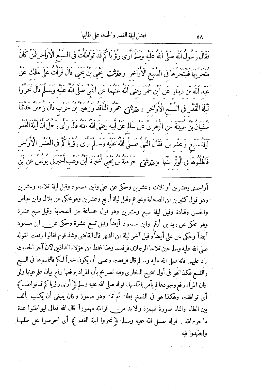 أَوْ إِحْدَى وَعِشْرِينَ أَوْ ثَلَاثٍ وَعِشْرِينَ وَحُكِيَ عن على وبن مَسْعُودٍ وَقِيلَ لَيْلَةُ ثَلَاثٍ وَعِشْرِينَ وَهُوَ قَوْلُ كَثِيرِينَ مِنَ الصَّحَابَةِ وَغَيْرِهِمْ وَقِيلَ لَيْلَةُ أَرْبَعٍ وعشرين وهو محكى عن بلال وبن عَبَّاسٍ وَالْحَسَنِ وَقَتَادَةَ وَقِيلَ لَيْلَةُ سَبْعٍ وَعِشْرِينَ وَهُوَ قَوْلُ جَمَاعَةٍ مِنَ الصَّحَابَةِ وَقِيلَ سَبْعَ عَشْرَةَ وَهُوَ مَحْكِيٌّ عَنْ زَيْدِ بْنِ أَرْقَمَ وبن مَسْعُودٍ أَيْضًا وَقِيلَ تِسْعَ عَشْرَةَ وَحُكِيَ عَنِ بن مَسْعُودٍ أَيْضًا وَحُكِيَ عَنْ عَلِيٍّ أَيْضًا وَقِيلَ آخِرُ لَيْلَةٍ مِنَ الشَّهْرِ قَالَ الْقَاضِي وَشَذَّ قَوْمٌ فَقَالُوا رُفِعَتْ لِقَوْلِهِ صَلَّى اللَّهُ عَلَيْهِ وَسَلَّمَ حِينَ تَلَاحَا الرَّجُلَانِ فَرُفِعَتْ وَهَذَا غَلَطٌ مِنْ هَؤُلَاءِ الشَّاذِّينَ لِأَنَّ آخِرَ الْحَدِيثِ يَرُدُّ عَلَيْهِمْ فَإِنَّهُ صَلَّى اللَّهُ عَلَيْهِ وَسَلَّمَ قَالَ فَرُفِعَتْ وَعَسَى أَنْ يَكُونَ خَيْرًا لَكُمْ فَالْتَمِسُوهَا فِي السَّبْعِ وَالتِّسْعِ هَكَذَا هُوَ فِي أَوَّلِ صَحِيحِ الْبُخَارِيِّ وَفِيهِ تَصْرِيحٌ بِأَنَّ الْمُرَادَ بِرَفْعِهَا رَفْعُ بَيَانِ عِلْمِ عَيْنِهَا وَلَوْ كَانَ الْمُرَادُ رَفْعَ وُجُودِهَا لَمْ يَأْمُرْ بِالْتِمَاسِهَا