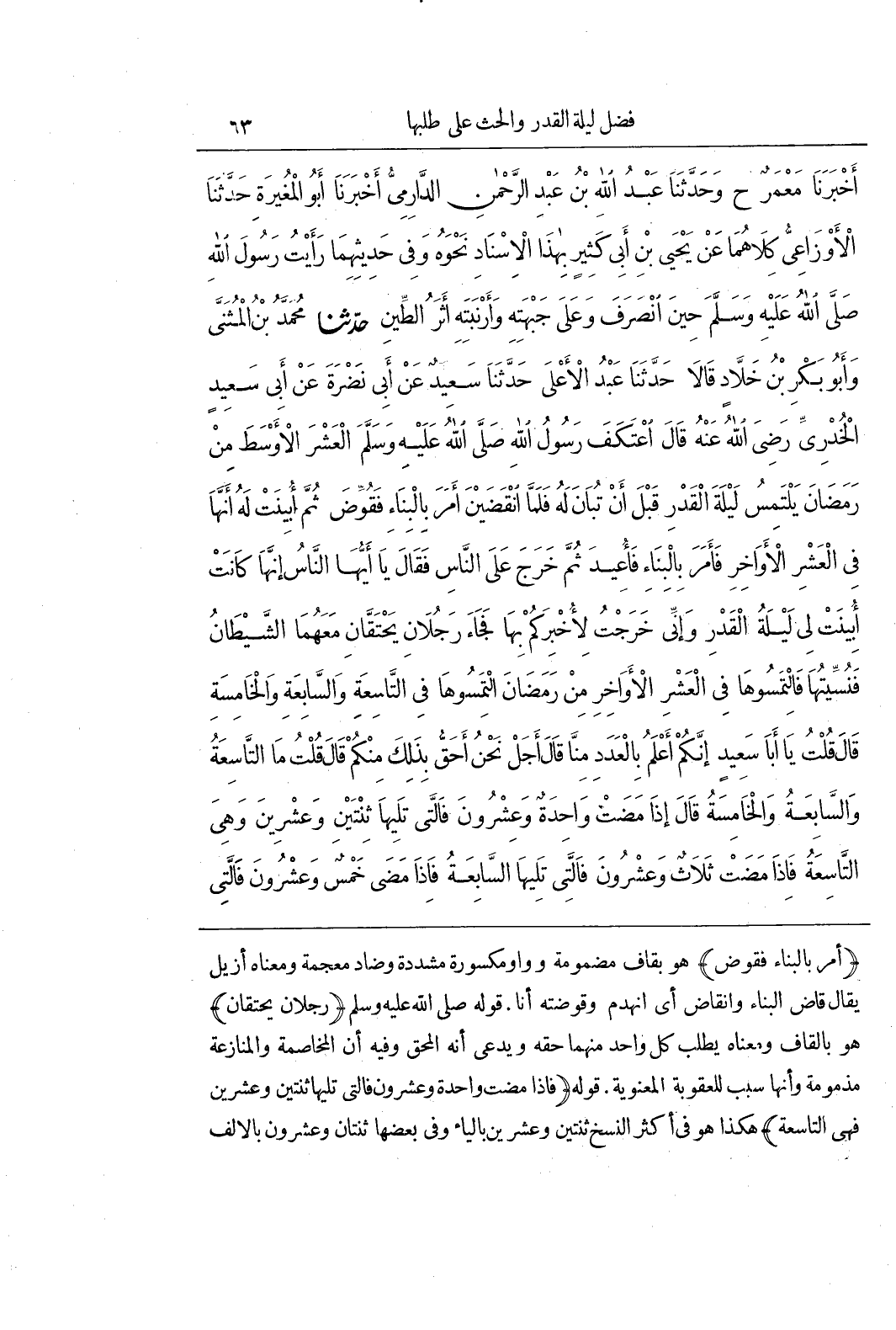 (أَمَرَ بِالْبِنَاءِ فَقُوِّضَ) هُوَ بِقَافٍ مَضْمُومَةٍ وَوَاوٍ مَكْسُورَةٍ مُشَدَّدَةٍ وَضَادٍ مُعْجَمَةٍ وَمَعْنَاهُ أُزِيلَ يُقَالُ قَاضَ الْبِنَاءُ وَانْقَاضَ أَيِ انْهَدَمَ وَقَوَّضْتُهُ أَنَا قَوْلُهُ صَلَّى اللَّهُ عَلَيْهِ وَسَلَّمَ (رَجُلَانِ يَحْتَقَّانِ) هُوَ بِالْقَافِ وَمَعْنَاهُ يَطْلُبُ كُلُّ وَاحِدٍ مِنْهُمَا حَقَّهُ وَيَدَّعِي أَنَّهُ الْمُحِقُّ وَفِيهِ أَنَّ الْمُخَاصَمَةَ وَالْمُنَازَعَةَ مَذْمُومَةٌ وَأَنَّهَا سَبَبٌ لِلْعُقُوبَةِ الْمَعْنَوِيَّةِ قَوْلُهُ (فَإِذَا مَضَتْ وَاحِدَةٌ وَعِشْرُونَ فَالَّتِي تَلِيهَا ثِنْتَيْنِ وَعِشْرِينَ فَهِيَ التَّاسِعَةُ) هَكَذَا هُوَ فِي أَكْثَرِ النسخ ثنتين وعشرين بالياء وفي بعضها اثنتان وعشرون بالالف