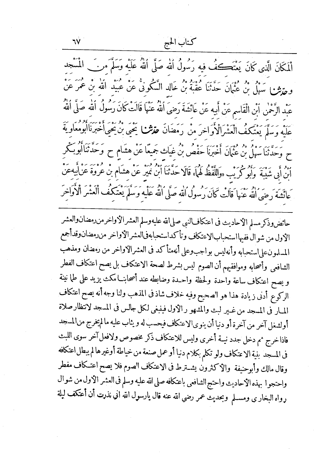 حَائِضٌ وَذَكَرَ مُسْلِمٌ الْأَحَادِيثَ فِي اعْتِكَافِ النَّبِيِّ صَلَّى اللَّهُ عَلَيْهِ وَسَلَّمَ الْعَشْرَ الْأَوَاخِرَ مِنْ رَمَضَانَ وَالْعَشْرَ الْأُوَلَ مِنْ شَوَّالٍ فَفِيهَا اسْتِحْبَابُ الِاعْتِكَافِ وَتَأَكُّدِ اسْتِحْبَابِهِ فِي الْعَشْرِ الْأَوَاخِرِ مِنْ رَمَضَانَ وَقَدْ أَجْمَعَ الْمُسْلِمُونَ عَلَى اسْتِحْبَابِهِ وَأَنَّهُ لَيْسَ بِوَاجِبٍ وَعَلَى أَنَّهُ مُتَأَكِّدٌ فِي الْعَشْرِ الْأَوَاخِرِ مِنْ رَمَضَانَ وَمَذْهَبُ الشَّافِعِيِّ وَأَصْحَابِهِ وَمُوَافِقِيهِمْ أَنَّ الصَّوْمَ لَيْسَ بِشَرْطٍ لِصِحَّةِ الِاعْتِكَافِ بَلْ يَصِحُّ اعْتِكَافُ الْفِطْرِ وَيَصِحُّ اعْتِكَافُ سَاعَةٍ وَاحِدَةٍ وَلَحْظَةٍ وَاحِدَةٍ وَضَابِطُهُ عِنْدَ أَصْحَابِنَا مُكْثُ يَزِيدَ عَلَى طُمَأْنِينَةِ الرُّكُوعِ أَدْنَى زِيَادَةٍ هَذَا هُوَ الصَّحِيحُ وَفِيهِ خِلَافٌ شَاذٌّ فِي الْمَذْهَبِ وَلَنَا وَجْهٌ أَنَّهُ يَصِحُّ اعْتِكَافُ الْمَارِّ فِي الْمَسْجِدِ مِنْ غَيْرِ لُبْثٍ وَالْمَشْهُورُ الْأَوَّلُ فَيَنْبَغِي لِكُلِّ جَالِسٍ فِي الْمَسْجِدِ لِانْتِظَارِ صَلَاةٍ أَوْ لِشُغُلٍ آخَرَ مِنْ آخِرَةٍ أَوْ دُنْيَا أَنْ يَنْوِيَ الاعتكاف فيحسب له ويثاب عليه مالم يَخْرُجْ مِنَ الْمَسْجِدِ فَإِذَا خَرَجَ ثُمَّ دَخَلَ جَدَّدَ نِيَّةً أُخْرَى وَلَيْسَ لِلِاعْتِكَافِ ذِكْرٌ مَخْصُوصٌ وَلَا فِعْلٌ آخَرُ سِوَى اللُّبْثِ فِي الْمَسْجِدِ بِنِيَّةِ الِاعْتِكَافِ وَلَوْ تَكَلَّمَ بِكَلَامِ دُنْيَا أَوْ عَمِلَ صَنْعَةً مِنْ خِيَاطَةٍ أَوْ غَيْرِهَا لَمْ يَبْطُلِ اعْتِكَافُهُ وَقَالَ مَالِكٌ وَأَبُو حَنِيفَةَ وَالْأَكْثَرُونَ يُشْتَرَطُ فِي الِاعْتِكَافِ الصَّوْمُ فَلَا يَصِحُّ اعْتِكَافُ مفطر وحتجوا بِهَذِهِ الْأَحَادِيثِ وَاحْتَجَّ الشَّافِعِيُّ بِاعْتِكَافِهِ صَلَّى اللَّهُ عَلَيْهِ وَسَلَّمَ فِي الْعَشْرِ الْأُوَلِ مِنْ شَوَّالٍ رَوَاهُ الْبُخَارِيُّ وَمُسْلِمٌ وَبِحَدِيثِ عُمَرَ رَضِيَ اللَّهُ عنه قال يارسول اللَّهِ إِنِّي نَذَرْتُ أَنْ أَعْتَكِفَ لَيْلَةً