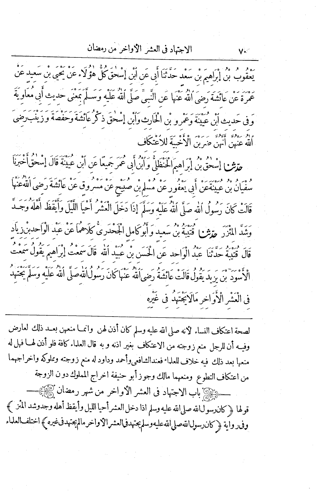 [1175] وَفِي رِوَايَةٍ كَانَ رَسُولُ اللَّهِ صَلَّى اللَّهُ عَلَيْهِ وَسَلَّمَ يَجْتَهِدُ فِي العشر الأواخر مالم يَجْتَهِدْ فِي غَيْرِهِ) اخْتَلَفَ الْعُلَمَاءُ)
