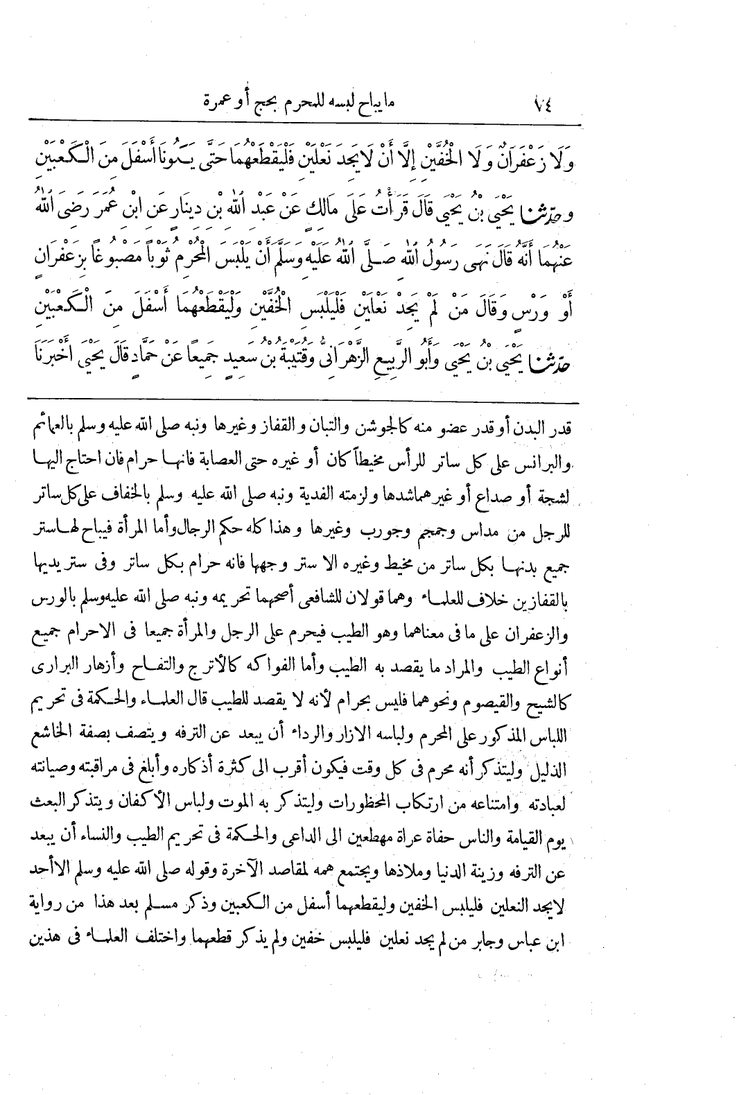 قَدْرِ الْبَدَنِ أَوْ قَدْرِ عُضْوٍ مِنْهُ كَالْجَوْشَنِ وَالتُّبَّانِ وَالْقُفَّازِ وَغَيْرِهَا وَنَبَّهَ صَلَّى اللَّهُ عَلَيْهِ وَسَلَّمَ بِالْعَمَائِمِ وَالْبَرَانِسِ عَلَى كُلِّ سَاتِرٍ لِلرَّأْسِ مَخِيطًا كَانَ أَوْ غَيْرَهُ حَتَّى الْعِصَابَةُ فَإِنَّهَا حَرَامٌ فَإِنِ احْتَاجَ إِلَيْهَا لِشَجَّةٍ أَوْ صُدَاعٍ أَوْ غَيْرِهِمَا شَدَّهَا وَلَزِمَتْهُ الْفِدْيَةُ وَنَبَّهَ صَلَّى اللَّهُ عَلَيْهِ وَسَلَّمَ بِالْخِفَافِ عَلَى كُلِّ سَاتِرٍ لِلرِّجْلِ مِنْ مَدَاسٍ وَجُمْجُمٍ وَجَوْرَبٍ وَغَيْرِهَا وَهَذَا كُلُّهُ حُكْمُ الرِّجَالِ وَأَمَّا الْمَرْأَةُ فَيُبَاحُ لَهَا سَتْرُ جَمِيعِ بَدَنِهَا بِكُلِّ سَاتِرٍ مِنْ مَخِيطٍ وَغَيْرِهِ إِلَّا سَتْرَ وَجْهِهَا فَإِنَّهُ حَرَامٌ بِكُلِّ سَاتِرٍ وَفِي سَتْرِ يَدَيْهَا بِالْقُفَّازَيْنِ خِلَافٌ لِلْعُلَمَاءِ وَهُمَا قَوْلَانِ لِلشَّافِعِيِّ أَصَحُّهُمَا تَحْرِيمُهُ وَنَبَّهَ صَلَّى الله عليه وسلم بالورس والزعفران على مافي مَعْنَاهُمَا وَهُوَ الطِّيبُ فَيَحْرُمُ عَلَى الرَّجُلِ وَالْمَرْأَةِ جَمِيعًا فِي الْإِحْرَامِ جَمِيعُ أَنْوَاعِ الطِّيبِ وَالْمُرَادُ مَا يُقْصَدُ بِهِ الطِّيبُ وَأَمَّا الْفَوَاكِهُ كَالْأُتْرُجِّ وَالتُّفَّاحِ وَأَزْهَارِ الْبَرَارِي كَالشِّيحِ وَالْقَيْصُومِ وَنَحْوِهِمَا فَلَيْسَ بِحَرَامٍ لِأَنَّهُ لَا يُقْصَدُ لِلطِّيبِ قَالَ الْعُلَمَاءُ وَالْحِكْمَةُ فِي تَحْرِيمِ اللِّبَاسِ الْمَذْكُورِ عَلَى الْمُحْرِمِ وَلِبَاسِهِ الْإِزَارَ وَالرِّدَاءَ أَنْ يَبْعُدَ عَنِ التَّرَفُّهِ وَيَتَّصِفَ بِصِفَةِ الْخَاشِعِ الذَّلِيلِ وَلِيَتَذَكَّرَ أَنَّهُ مُحْرِمٌ فِي كُلِّ وَقْتٍ فَيَكُونُ أَقْرَبَ إِلَى كَثْرَةِ أَذْكَارِهِ وَأَبْلَغَ فِي مُرَاقَبَتِهِ وَصِيَانَتِهِ لِعِبَادَتِهِ وَامْتِنَاعِهِ مِنَ ارْتِكَابِ الْمَحْظُورَاتِ وَلِيَتَذَكَّرَ بِهِ الْمَوْتَ وَلِبَاسَ الْأَكْفَانِ وَيَتَذَكَّرَ الْبَعْثَ يَوْمَ الْقِيَامَةِ وَالنَّاسُ حُفَاةٌ عُرَاةٌ مُهْطِعِينَ إِلَى الدَّاعِي وَالْحِكْمَةُ فِي تَحْرِيمِ الطِّيبِ وَالنِّسَاءِ أَنْ يَبْعُدَ عَنِ التَّرَفُّهِ وَزِينَةِ الدُّنْيَا وَمَلَاذِّهَا وَيَجْتَمِعَ هَمُّهُ لِمَقَاصِدِ الْآخِرَةِ وَقَوْلُهُ صَلَّى اللَّهُ عَلَيْهِ وَسَلَّمَ إِلَّا أَحَدٌ لَا يَجِدُ النَّعْلَيْنِ فَلْيَلْبَسِ الْخُفَّيْنِ وَلْيَقْطَعْهُمَا أَسْفَلَ مِنَ الْكَعْبَيْنِ وَذَكَرَ مُسْلِمٌ بَعْدَ هَذَا مِنْ رِوَايَةِ بن عَبَّاسٍ وَجَابِرٍ مَنْ لَمْ يَجِدْ نَعْلَيْنِ فَلْيَلْبَسْ خُفَّيْنِ وَلَمْ يَذْكُرْ قَطْعَهُمَا وَاخْتَلَفَ الْعُلَمَاءُ فِي هذين