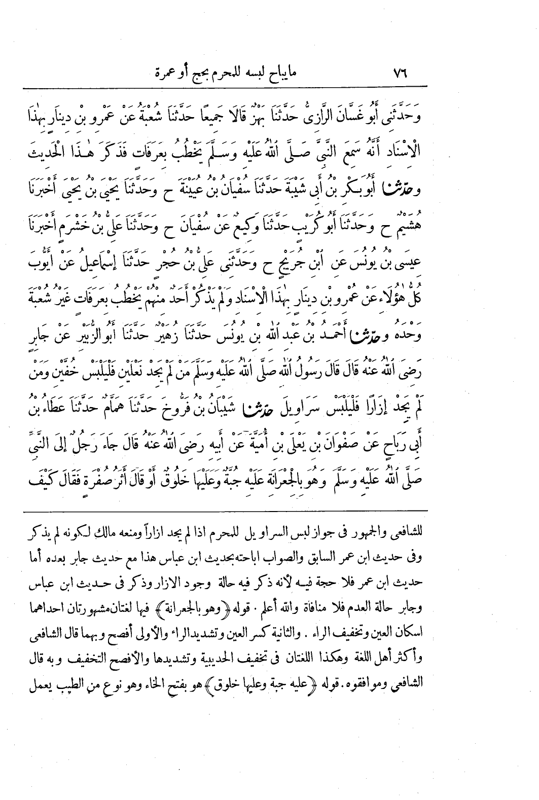 لِلشَّافِعِيِّ وَالْجُمْهُورِ فِي جَوَازِ لُبْسِ السَّرَاوِيلِ لِلْمُحْرِمِ إِذَا لَمْ يَجِدْ إِزَارًا وَمَنَعَهُ مَالِكٌ لِكَوْنِهِ لم يذكر وفي حديث بن عمر السابق والصواب اباحته بحديث بن عَبَّاسٍ هَذَا مَعَ حَدِيثِ جَابِرٍ بَعْدَهُ أَمَّا حديث بن عُمَرَ فَلَا حُجَّةَ فِيهِ لِأَنَّهُ ذَكَرَ فِيهِ حالة وجود الازار وذكر في حديث بن عَبَّاسٍ وَجَابِرٍ حَالَةَ الْعَدَمِ فَلَا مُنَافَاةَ وَاللَّهُ أَعْلَمُ قَوْلُهُ (وَهُوَ بِالْجِعْرَانَةِ) فِيهَا لُغَتَانِ مَشْهُورَتَانِ إِحْدَاهُمَا إِسْكَانُ الْعَيْنِ وَتَخْفِيفُ الرَّاءِ وَالثَّانِيَةُ كَسْرُ الْعَيْنِ وَتَشْدِيدُ الرَّاءِ وَالْأُولَى أَفْصَحُ وَبِهِمَا قَالَ الشَّافِعِيُّ وَأَكْثَرُ أَهْلِ اللُّغَةِ وَهَكَذَا اللُّغَتَانِ فِي تَخْفِيفِ الْحُدَيْبِيَةِ وَتَشْدِيدِهَا وَالْأَفْصَحُ التَّخْفِيفُ وَبِهِ قَالَ الشَّافِعِيُّ وَمُوَافِقُوهُ