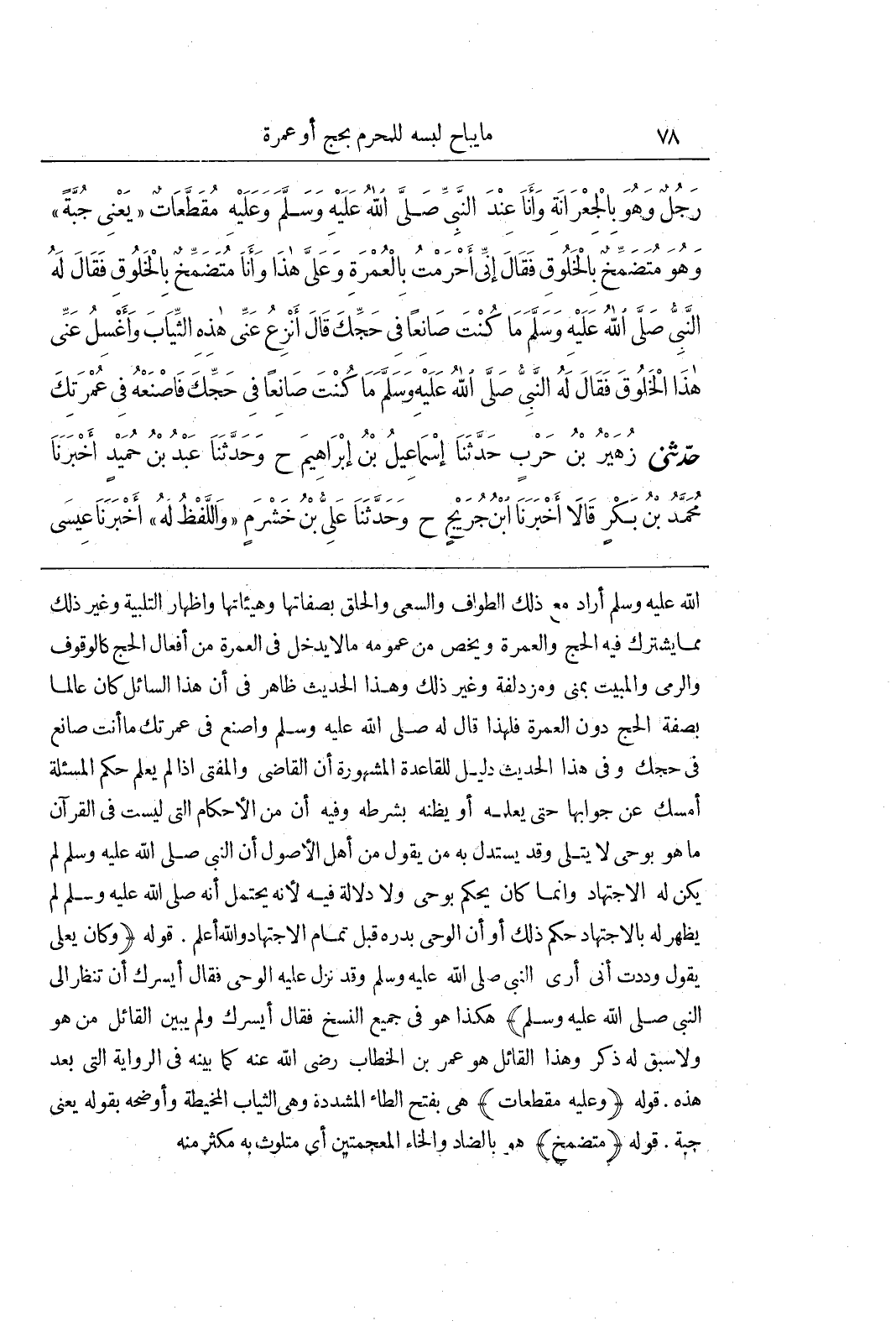 أَرَادَ مَعَ ذَلِكَ الطَّوَافَ وَالسَّعْيَ وَالْحَلْقَ بِصِفَاتِهَا وَهَيْئَاتِهَا وَإِظْهَارَ التَّلْبِيَةَ وَغَيْرَ ذَلِكَ مِمَّا يَشْتَرِكُ فِيهِ الْحَجُّ وَالْعُمْرَةُ وَيَخُصُّ مِنْ عُمُومِهِ مَا لَا يَدْخُلُ فِي الْعُمْرَةِ مِنْ أَفْعَالِ الْحَجِّ كَالْوُقُوفِ وَالرَّمْيِ وَالْمَبِيتِ بِمِنًى وَمُزْدَلِفَةَ وَغَيْرِ ذَلِكَ وَهَذَا الْحَدِيثُ ظَاهِرٌ فِي أَنَّ هَذَا السَّائِلَ كَانَ عَالِمًا بِصِفَةِ الْحَجِّ دُونَ الْعُمْرَةِ فَلِهَذَا قَالَ لَهُ صَلَّى اللَّهُ عَلَيْهِ وَسَلَّمَ وَاصْنَعْ فِي عُمْرَتِكَ مَا أَنْتَ صَانِعٌ فِي حَجِّكَ وَفِي هَذَا الْحَدِيثِ دَلِيلٌ لِلْقَاعِدَةِ الْمَشْهُورَةِ أَنَّ الْقَاضِي وَالْمُفْتِي إِذَا لَمْ يَعْلَمْ حُكْمَ الْمَسْأَلَةِ أَمْسَكَ عَنْ جَوَابِهَا حَتَّى يَعْلَمَهُ أَوْ يَظُنَّهُ بِشَرْطِهِ وَفِيهِ أَنَّ مِنَ الْأَحْكَامِ الَّتِي لَيْسَتْ فِي الْقُرْآنِ مَا هُوَ بِوَحْيٍ لَا يُتْلَى وَقَدْ يَسْتَدِلُّ بِهِ مَنْ يَقُولُ مِنْ أَهْلِ الْأُصُولِ أَنَّ النَّبِيَّ صَلَّى اللَّهُ عَلَيْهِ وَسَلَّمَ لَمْ يَكُنْ لَهُ الِاجْتِهَادُ وَإِنَّمَا كَانَ يَحْكُمُ بِوَحْيٍ وَلَا دَلَالَةَ فِيهِ لِأَنَّهُ يَحْتَمِلُ أَنَّهُ صَلَّى اللَّهُ عَلَيْهِ وَسَلَّمَ لَمْ يَظْهَرْ لَهُ بِالِاجْتِهَادِ حُكْمُ ذَلِكَ أَوْ أَنَّ الْوَحْيَ بَدَرَهُ قَبْلَ تَمَامِ الِاجْتِهَادِ وَاللَّهُ أَعْلَمُ قَوْلُهُ (وَكَانَ يَعْلَى يَقُولُ وَدِدْتُ أَنِّي أَرَى النَّبِيَّ صَلَّى اللَّهُ عَلَيْهِ وَسَلَّمَ وَقَدْ نَزَلَ عَلَيْهِ الْوَحْيُ فَقَالَ أَيَسُرُّكَ أَنْ تَنْظُرَ إِلَى النَّبِيِّ صَلَّى اللَّهُ عَلَيْهِ وَسَلَّمَ) هَكَذَا هُوَ فِي جَمِيعِ النُّسَخِ فَقَالَ أَيَسُرُّكَ وَلَمْ يُبَيِّنِ الْقَائِلُ مَنْ هُوَ وَلَا سَبَقَ لَهُ ذِكْرٌ وَهَذَا الْقَائِلُ هُوَ عُمَرُ بْنُ الْخَطَّابِ رَضِيَ اللَّهُ عَنْهُ كَمَا بَيَّنَهُ فِي الرِّوَايَةِ الَّتِي بَعْدَ هَذِهِ قوله (وعليه مقطعات) هي بفتح الطاء المشددة وهي الثياب المخيطة وأوضحه بقوله يعنى جبة قَوْلُهُ (مُتَضَمِّخٌ) هُوَ بِالضَّادِ وَالْخَاءِ الْمُعْجَمَتَيْنِ أَيْ مُتَلَوِّثٌ بِهِ مُكْثِرٌ مِنْهُ