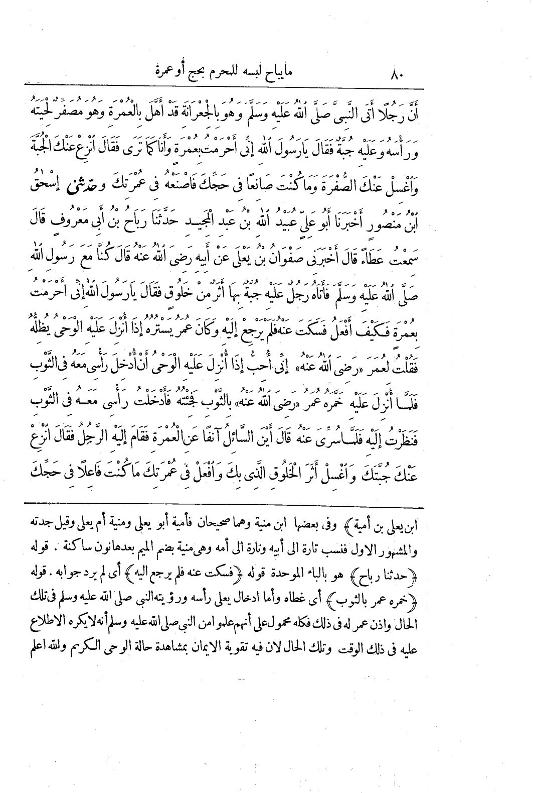 بن يعلى بن أمية) وفي بعضها بن مُنْيَةَ وَهُمَا صَحِيحَانِ فَأُمَيَّةُ أَبُو يَعْلَى وَمُنْيَةُ أُمُّ يَعْلَى وَقِيلَ جَدَّتُهُ وَالْمَشْهُورُ الْأَوَّلُ فَنُسِبَ تَارَةً إِلَى أَبِيهِ وَتَارَةً إِلَى أُمِّهِ وَهِيَ مُنْيَةُ بِضَمِّ الْمِيمِ بَعْدَهَا نُونٌ سَاكِنَةٌ قَوْلُهُ (حَدَّثَنَا رَبَاحُ) هُوَ بِالْبَاءِ الْمُوَحَّدَةِ قَوْلُهُ (فَسَكَتَ عَنْهُ فَلَمْ يَرْجِعْ إِلَيْهِ) أَيْ لَمْ يَرُدَّ جَوَابَهُ قَوْلُهُ (خَمَّرَهُ عُمَرُ بِالثَّوْبِ) أَيْ غَطَّاهُ وَأَمَّا إِدْخَالُ يَعْلَى رَأْسَهُ وَرُؤْيَتُهُ النَّبِيَّ صَلَّى اللَّهُ عَلَيْهِ وَسَلَّمَ فِي تِلْكَ الْحَالِ وَإِذْنُ عُمَرَ لَهُ فِي ذَلِكَ فَكُلُّهُ مَحْمُولٌ عَلَى أَنَّهُمْ عَلِمُوا مِنَ النَّبِيِّ صَلَّى اللَّهُ عَلَيْهِ وَسَلَّمَ أَنَّهُ لَا يَكْرَهُ الِاطِّلَاعَ عَلَيْهِ فِي ذَلِكَ الْوَقْتِ وَتِلْكَ الْحَالِ لِأَنَّ فِيهِ تَقْوِيَةُ الْإِيمَانِ بِمُشَاهَدَةِ حَالَةِ الْوَحْيِ الْكَرِيمِ وَاللَّهُ أَعْلَمُ