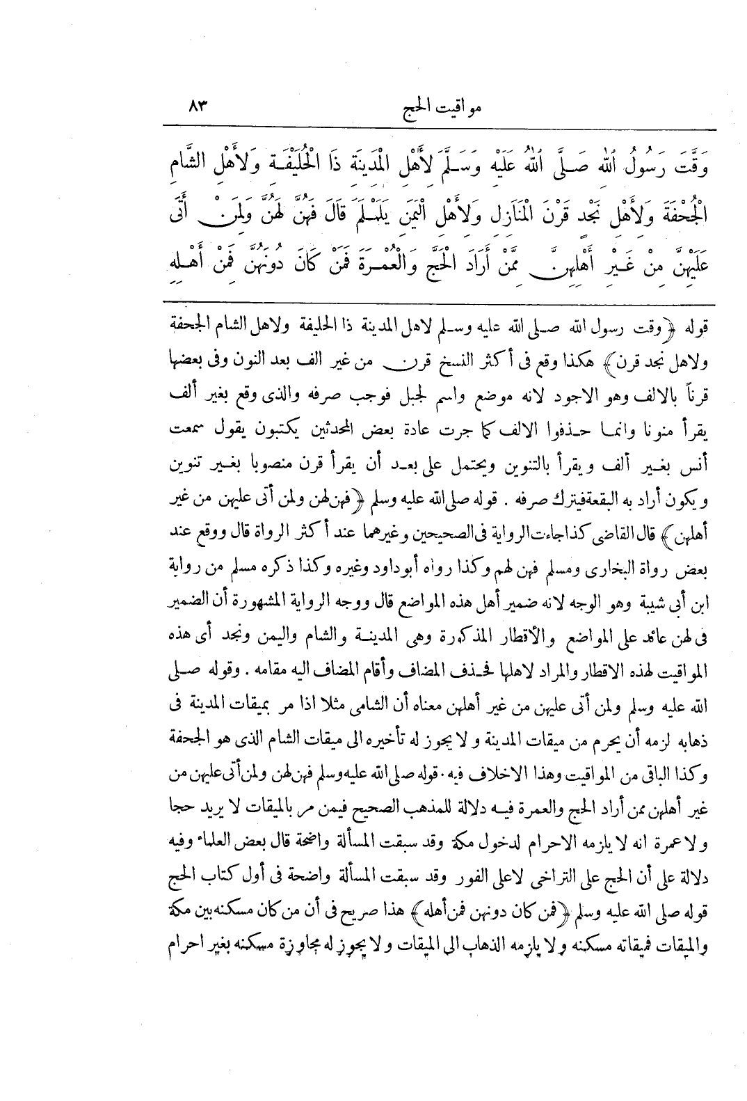 [1181] قَوْلُهُ (وَقَّتَ رَسُولُ اللَّهِ صَلَّى اللَّهُ عَلَيْهِ وَسَلَّمَ لِأَهْلِ الْمَدِينَةِ ذَا الْحُلَيْفَةِ وَلِأَهْلِ الشَّامِ الْجُحْفَةَ وَلِأَهْلِ نَجْدٍ قَرْنَ) هَكَذَا وَقَعَ فِي أَكْثَرِ النُّسَخِ قَرْنَ مِنْ غَيْرِ أَلِفٍ بَعْدَ النُّونِ وَفِي بَعْضِهَا قَرْنًا بِالْأَلِفِ وَهُوَ الْأَجْوَدُ لِأَنَّهُ مَوْضِعٌ وَاسْمٌ لِجَبَلٍ فَوَجَبَ صَرْفُهُ وَالَّذِي وَقَعَ بِغَيْرِ أَلِفٍ يُقْرَأ مُنَوَّنًا وَإِنَّمَا حَذَفُوا الْأَلِفَ كَمَا جَرَتْ عَادَةُ بَعْضِ الْمُحَدِّثِينَ يَكْتُبُونَ يَقُولُ سَمِعْتُ أَنَسَ بِغَيْرِ أَلِفٍ وَيُقْرَأُ بِالتَّنْوِينِ ويحتمل على بعد أن يقرأ قَرْنَ مَنْصُوبًا بِغَيْرِ تَنْوِينٍ وَيَكُونُ أَرَادَ بِهِ الْبُقْعَةَ فَيُتْرَكُ صَرْفُهُ قَوْلُهُ صَلَّى اللَّهُ عَلَيْهِ وَسَلَّمَ (فَهُنَّ لَهُنَّ وَلِمَنْ أَتَى عَلَيْهِنَّ مِنْ غَيْرِ أَهْلِهِنَّ) قَالَ الْقَاضِي كَذَا جَاءَتِ الرِّوَايَةُ فِي الصَّحِيحَيْنِ وَغَيْرِهِمَا عِنْدَ أَكْثَرِ الرُّوَاةِ قَالَ وَوَقَعَ عِنْدَ بَعْضِ رُوَاةِ الْبُخَارِيِّ وَمُسْلِمٍ فَهُنَّ لَهُمْ وَكَذَا رَوَاهُ أَبُو دَاوُدَ وَغَيْرُهُ وَكَذَا ذكره مسلم من رواية بن أَبِي شَيْبَةَ وَهُوَ الْوَجْهُ لِأَنَّهُ ضَمِيرُ أَهْلِ هَذِهِ الْمَوَاضِعِ قَالَ وَوَجْهُ الرِّوَايَةِ الْمَشْهُورَةِ أَنَّ الضَّمِيرَ فِي لَهُنَّ عَائِدٌ عَلَى الْمَوَاضِعِ وَالْأَقْطَارِ الْمَذْكُورَةِ وَهِيَ الْمَدِينَةُ وَالشَّامُ وَالْيَمَنُ وَنَجْدٌ أَيْ هَذِهِ الْمَوَاقِيتُ لِهَذِهِ الْأَقْطَارِ وَالْمُرَادُ لِأَهْلِهَا فَحَذَفَ الْمُضَافَ وَأَقَامَ الْمُضَافَ إِلَيْهِ مَقَامَهُ وَقَوْلُهُ صَلَّى اللَّهُ عَلَيْهِ وَسَلَّمَ وَلِمَنْ أَتَى عَلَيْهِنَّ مِنْ غَيْرِ أَهْلِهِنَّ مَعْنَاهُ أَنَّ الشَّامِيَّ مَثَلًا إِذَا مَرَّ بِمِيقَاتِ الْمَدِينَةِ فِي ذَهَابِهِ لَزِمَهُ أَنْ يُحْرِمَ مِنْ مِيقَاتِ الْمَدِينَةِ وَلَا يَجُوزُ لَهُ تَأْخِيرُهُ إِلَى مِيقَاتِ الشَّامِ الَّذِي هُوَ الْجُحْفَةُ وكذا الباقي من المواقيت وهذا لاخلاف فِيهِ قَوْلُهُ صَلَّى اللَّهُ عَلَيْهِ وَسَلَّمَ فَهُنَّ لَهُنَّ وَلِمَنْ أَتَى عَلَيْهِنَّ مِنْ غَيْرِ أَهْلِهِنَّ مِمَّنْ أَرَادَ الْحَجَّ وَالْعُمْرَةَ فِيهِ دَلَالَةٌ لِلْمَذْهَبِ الصَّحِيحِ فِيمَنْ مَرَّ بِالْمِيقَاتِ لَا يُرِيدُ حَجًّا وَلَا عُمْرَةً أَنَّهُ لَا يَلْزَمُهُ الْإِحْرَامُ لِدُخُولِ مَكَّةَ وَقَدْ سَبَقَتِ الْمَسْأَلَةُ وَاضِحَةً قَالَ بَعْضُ الْعُلَمَاءِ وَفِيهِ دَلَالَةٌ عَلَى أَنَّ الْحَجَّ عَلَى التَّرَاخِي لَا عَلَى الْفَوْرِ وَقَدْ سَبَقَتِ الْمَسْأَلَةُ وَاضِحَةً فِي أَوَّلِ كِتَابِ الْحَجِّ قَوْلُهُ صَلَّى اللَّهُ عَلَيْهِ وَسَلَّمَ (فَمَنْ كَانَ دُونَهُنَّ فَمِنْ أَهْلِهِ) هَذَا صَرِيحٌ فِي أَنَّ مَنْ كَانَ مسكنه بين مكة والميقات فميقاته مسكنه إِلَى الْمِيقَاتِ وَلَا يَجُوزُ لَهُ مُجَاوَزَةُ مَسْكَنِهِ بغير احرام