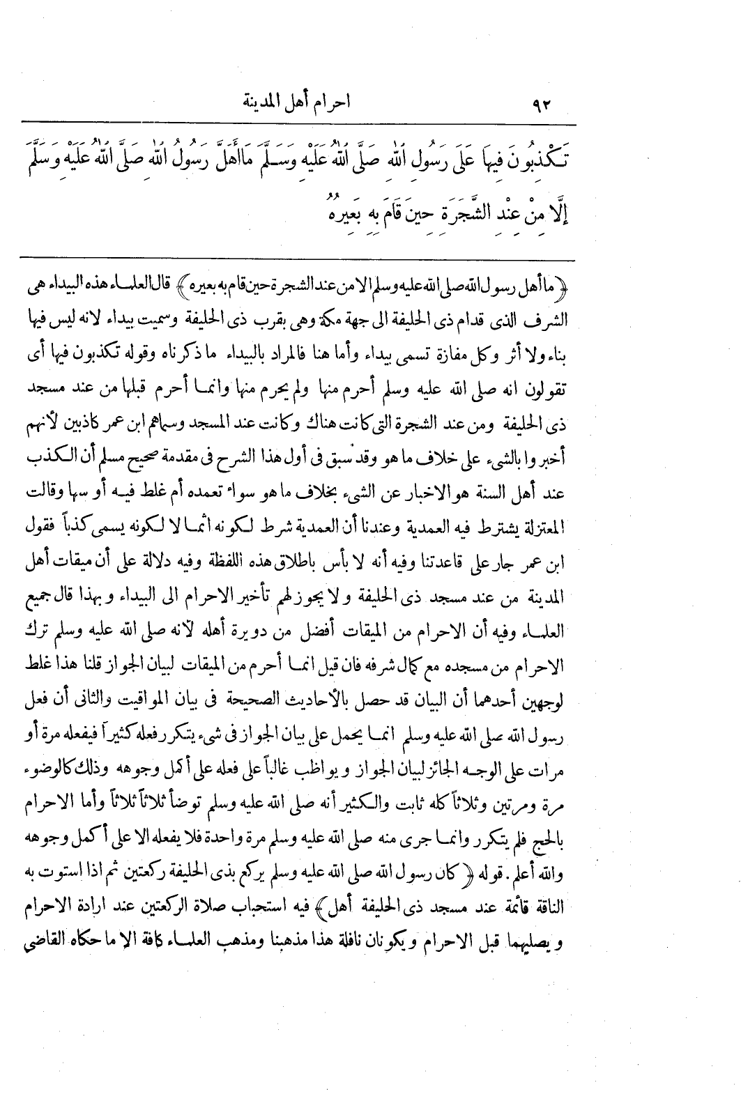 (مَا أَهَلَّ رَسُولِ اللَّهِ صَلَّى اللَّهُ عَلَيْهِ وَسَلَّمَ إِلَّا مِنْ عِنْدِ الشَّجَرَةِ حِينَ قَامَ بِهِ بَعِيرُهُ) قَالَ الْعُلَمَاءُ هَذِهِ الْبَيْدَاءُ هِيَ الشَّرَفُ الَّذِي قُدَّامَ ذِي الْحُلَيْفَةِ إِلَى جِهَةِ مَكَّةَ وَهِيَ بِقُرْبِ ذِي الْحُلَيْفَةِ وَسُمِّيَتْ بَيْدَاءَ لِأَنَّهُ لَيْسَ فِيهَا بِنَاءٌ وَلَا أَثَرٌ وَكُلُّ مَفَازَةٍ تُسَمَّى بَيْدَاءَ وَأَمَّا هُنَا فَالْمُرَادُ بِالْبَيْدَاءِ مَا ذَكَرْنَاهُ وَقَوْلُهُ تَكْذِبُونَ فِيهَا أَيْ تَقُولُونَ إِنَّهُ صَلَّى اللَّهُ عَلَيْهِ وَسَلَّمَ أَحْرَمَ مِنْهَا وَلَمْ يُحْرِمْ مِنْهَا وَإِنَّمَا أَحْرَمَ قَبْلَهَا مِنْ عِنْدِ مَسْجِدِ ذِي الْحُلَيْفَةِ وَمِنْ عِنْدِ الشَّجَرَةِ الَّتِي كَانَتْ هُنَاكَ وَكَانَتْ عِنْدَ الْمَسْجِدِ وَسَمَّاهُمُ بن عُمَرَ كَاذِبِينَ لِأَنَّهُمْ أَخْبَرُوا بِالشَّيْءِ عَلَى خِلَافِ مَا هُوَ وَقَدْ سَبَقَ فِي أَوَّلِ هَذَا الشَّرْحِ فِي مُقَدِّمَةِ صَحِيحِ مُسْلِمٍ أَنَّ الْكَذِبَ عِنْدَ أَهْلِ السُّنَّةِ هُوَ الْإِخْبَارُ عَنِ الشَّيْءِ بِخِلَافِ مَا هُوَ سَوَاءٌ تَعَمَّدَهُ أَمْ غَلِطَ فِيهِ أَوْ سَهَا وَقَالَتِ الْمُعْتَزِلَةُ يُشْتَرَطُ فِيهِ الْعَمْدِيَّةُ وَعِنْدَنَا أَنَّ الْعَمْدِيَّةَ شَرْطٌ لِكَوْنِهِ إِثْمًا لا لكونه يسمى كذبا فقول بن عُمَرَ جَارٍ عَلَى قَاعِدَتِنَا وَفِيهِ أَنَّهُ لَا بَأْسَ بِإِطْلَاقِ هَذِهِ اللَّفْظَةِ وَفِيهِ دَلَالَةٌ عَلَى أَنَّ مِيقَاتَ أَهْلِ الْمَدِينَةِ مِنْ عِنْدِ مَسْجِدِ ذِي الْحُلَيْفَةِ وَلَا يَجُوزُ لَهُمْ تَأْخِيرُ الْإِحْرَامِ إِلَى الْبَيْدَاءِ وَبِهَذَا قَالَ جَمِيعُ الْعُلَمَاءِ وَفِيهِ أَنَّ الْإِحْرَامَ مِنَ الْمِيقَاتِ أَفْضَلُ مِنْ دُوَيْرَةِ أَهْلِهِ لِأَنَّهُ صَلَّى اللَّهُ عَلَيْهِ وَسَلَّمَ تَرَكَ الْإِحْرَامَ مِنْ مَسْجِدِهِ مَعَ كَمَالِ شَرَفِهِ فَإِنْ قِيلَ إِنَّمَا أَحْرَمَ مِنَ الْمِيقَاتِ لِبَيَانِ الْجَوَازِ قُلْنَا هَذَا غَلَطٌ لِوَجْهَيْنِ أَحَدُهُمَا أَنَّ الْبَيَانَ قَدْ حَصَلَ بِالْأَحَادِيثِ الصَّحِيحَةِ فِي بَيَانِ الْمَوَاقِيتِ وَالثَّانِي أَنَّ فِعْلِ رَسُولِ اللَّهِ صَلَّى اللَّهُ عَلَيْهِ وَسَلَّمَ إِنَّمَا يُحْمَلُ عَلَى بَيَانِ الْجَوَازِ فِي شَيْءٍ يَتَكَرَّرُ فِعْلُهُ كَثِيرًا فَيَفْعَلُهُ مَرَّةً أَوْ مَرَّاتٍ عَلَى الْوَجْهِ الْجَائِزِ لِبَيَانِ الْجَوَازِ وَيُوَاظِبُ غَالِبًا عَلَى فِعْلِهِ عَلَى أَكْمَلِ وُجُوهِهِ وَذَلِكَ كَالْوُضُوءِ مَرَّةً وَمَرَّتَيْنِ وَثَلَاثًا كُلُّهُ ثَابِتٌ وَالْكَثِيرُ أَنَّهُ صَلَّى اللَّهُ عَلَيْهِ وَسَلَّمَ تَوَضَّأَ ثَلَاثًا ثَلَاثًا وَأَمَّا الْإِحْرَامُ بِالْحَجِّ فَلَمْ يَتَكَرَّرْ وَإِنَّمَا جَرَى مِنْهُ صَلَّى اللَّهُ عَلَيْهِ وَسَلَّمَ مَرَّةً وَاحِدَةً فَلَا يَفْعَلُهُ إِلَّا عَلَى أَكْمَلِ وُجُوهِهِ وَاللَّهُ أَعْلَمُ قَوْلُهُ (كَانَ رَسُولُ اللَّهِ صَلَّى اللَّهُ عَلَيْهِ وَسَلَّمَ يَرْكَعُ بِذِي الْحُلَيْفَةِ رَكْعَتَيْنِ ثُمَّ إِذَا اسْتَوَتْ بِهِ النَّاقَةُ قَائِمَةً عِنْدَ مَسْجِدِ ذِي الْحُلَيْفَةِ أَهَلَّ) فِيهِ اسْتِحْبَابُ صَلَاةِ الرَّكْعَتَيْنِ عِنْدَ إِرَادَةِ الْإِحْرَامِ وَيُصَلِّيهِمَا قَبْلَ الْإِحْرَامِ وَيَكُونَانِ نَافِلَةً هَذَا مَذْهَبُنَا وَمَذْهَبُ الْعُلَمَاءِ كَافَّةً إِلَّا مَا حَكَاهُ الْقَاضِي