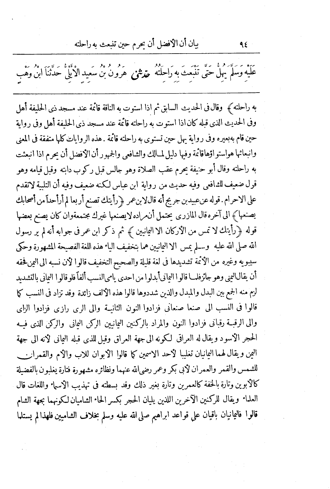 بِهِ رَاحِلَتُهُ) وَقَالَ فِي الْحَدِيثِ السَّابِقِ ثُمَّ إِذَا اسْتَوَتْ بِهِ النَّاقَةُ قَائِمَةً عِنْدَ مَسْجِدِ ذِي الْحُلَيْفَةِ أَهَلَّ وَفِي الْحَدِيثِ الَّذِي قَبْلَهُ كَانَ إِذَا اسْتَوَتْ بِهِ رَاحِلَتُهُ قَائِمَةً عِنْدَ مَسْجِدِ ذِي الْحُلَيْفَةِ أَهَلَّ وَفِي رِوَايَةٍ حِينَ قام به بعيره وفي رواية يهل حين تَسْتَوِيَ بِهِ رَاحِلَتُهُ قَائِمَةً هَذِهِ الرِّوَايَاتُ كُلُّهَا متفقة في المعنى وابنعاثها هُوَ اسْتِوَاؤُهَا قَائِمَةً وَفِيهَا دَلِيلٌ لِمَالِكٍ وَالشَّافِعِيِّ وَالْجُمْهُورِ أَنَّ الْأَفْضَلَ أَنْ يُحْرِمَ إِذَا انْبَعَثَتْ بِهِ رَاحِلَتُهُ وَقَالَ أَبُو حَنِيفَةَ يُحْرِمُ عَقِبَ الصَّلَاةِ وَهُوَ جَالِسٌ قَبْلَ رُكُوبِ دَابَّتِهِ وَقَبْلَ قِيَامِهِ وَهُوَ قَوْلٌ ضَعِيفٌ لِلشَّافِعِيِّ وَفِيهِ حَدِيثٌ من رواية بن عَبَّاسٍ لَكِنَّهُ ضَعِيفٌ وَفِيهِ أَنَّ التَّلْبِيَةَ لَا تُقَدَّمُ عَلَى الْإِحْرَامِ قَوْلُهُ عَنْ عُبَيْدِ بْنِ جُرَيْجٍ أَنَّهُ قَالَ لِابْنِ عُمَرَ (رَأَيْتُكَ تَصْنَعُ أَرْبَعًا لَمْ أَرَ أَحَدًا مِنْ أَصْحَابِكَ يَصْنَعُهَا) إِلَى آخِرِهِ قَالَ الْمَازِرِيُّ يَحْتَمِلُ أَنَّ مُرَادَهُ لَا يَصْنَعُهَا غَيْرُكَ مُجْتَمِعَةً وَإِنْ كَانَ يَصْنَعُ بَعْضَهَا قَوْلُهُ (رَأَيْتُكَ لَا تَمَسُّ مِنَ الْأَرْكَانِ الا اليمانيين) ثم ذكر بن عُمَرَ فِي جَوَابِهِ أَنَّهُ لَمْ يَرَ رَسُولَ اللَّهِ صَلَّى اللَّهُ عَلَيْهِ وَسَلَّمَ يَمَسُّ إِلَّا الْيَمَانِيَيْنِ هُمَا بِتَخْفِيفِ الْيَاءِ هَذِهِ اللُّغَةُ الْفَصِيحَةُ الْمَشْهُورَةُ وَحَكَى سِيبَوَيْهِ وَغَيْرُهُ مِنَ الْأَئِمَّةِ تَشْدِيدَهَا فِي لُغَةٍ قَلِيلَةٍ وَالصَّحِيحُ التَّخْفِيفُ قَالُوا لِأَنَّ نَسَبَهُ إِلَى الْيَمَنِ فَحَقُّهُ أَنْ يُقَالَ الْيَمَنِيُّ وَهُوَ جَائِزٌ فَلَمَّا قَالُوا الْيَمَانِي أَبْدَلُوا مِنْ إِحْدَى يَاءَيِ النَّسَبِ أَلِفًا فَلَوْ قَالُوا الْيَمَانِيُّ بِالتَّشْدِيدِ لَزِمَ مِنْهُ الْجَمْعُ بَيْنَ الْبَدَلِ وَالْمُبْدَلِ وَالَّذِينَ شَدَّدُوهَا قَالُوا هَذِهِ الْأَلِفُ زَائِدَةٌ وَقَدْ تُزَادُ فِي النَّسَبِ كَمَا قَالُوا فِي النَّسَبِ إِلَى صنعا صَنْعَانِيٌّ فَزَادُوا النُّونَ الثَّانِيَةَ وَإِلَى الرَّيِّ رَازِيٌّ فَزَادُوا الزَّايَ وإِلَى الرَّقَبَةِ رَقَبَانِيٌّ فَزَادُوا النُّونَ وَالْمُرَادُ بِالرُّكْنَيْنِ الْيَمَانِيَيْنِ الرُّكْنُ الْيَمَانِي وَالرُّكْنُ الَّذِي فِيهِ الْحَجَرُ الْأَسْوَدُ وَيُقَالُ لَهُ الْعِرَاقِيُّ لِكَوْنِهِ إِلَى جِهَةِ الْعِرَاقِ وَقِيلَ لِلَّذِي قِبَلَهُ الْيَمَانِيُّ لِأَنَّهُ إِلَى جِهَةِ الْيَمَنِ وَيُقَالُ لَهُمَا الْيَمَانِيَّانِ تَغْلِيبًا لِأَحَدِ الِاسْمَيْنِ كَمَا قَالُوا الْأَبَوَانِ لِلْأَبِ وَالْأُمِّ وَالْقَمَرَانِ لِلشَّمْسِ وَالْقَمَرِ وَالْعُمَرَانِ لِأَبِي بَكْرٍ وَعُمَرَ رَضِيَ اللَّهُ عَنْهُمَا وَنَظَائِرُهُ مَشْهُورَةٌ فَتَارَةً يُغَلِّبُونَ بِالْفَضِيلَةِ كَالْأَبَوَيْنِ وَتَارَةً بِالْخِفَّةِ كَالْعُمَرَيْنِ وَتَارَةً بِغَيْرِ ذَلِكَ وَقَدْ بَسَطْتُهُ فِي تَهْذِيبِ الْأَسْمَاءِ وَاللُّغَاتِ قَالَ الْعُلَمَاءُ وَيُقَالُ لِلرُّكْنَيْنِ الْآخَرَيْنِ اللَّذَيْنِ يَلِيَانِ الْحِجْرَ بِكَسْرِ الْحَاءِ الشَّامِيَّانِ لِكَوْنِهِمَا بِجِهَةِ الشَّامِ قَالُوا فَالْيَمَانِيَانِ بَاقِيَانِ عَلَى قَوَاعِدِ إِبْرَاهِيمَ صَلَّى اللَّهُ عَلَيْهِ وَسَلَّمَ بِخِلَافِ الشَّامِيَّيْنِ فَلِهَذَا لم يستلما