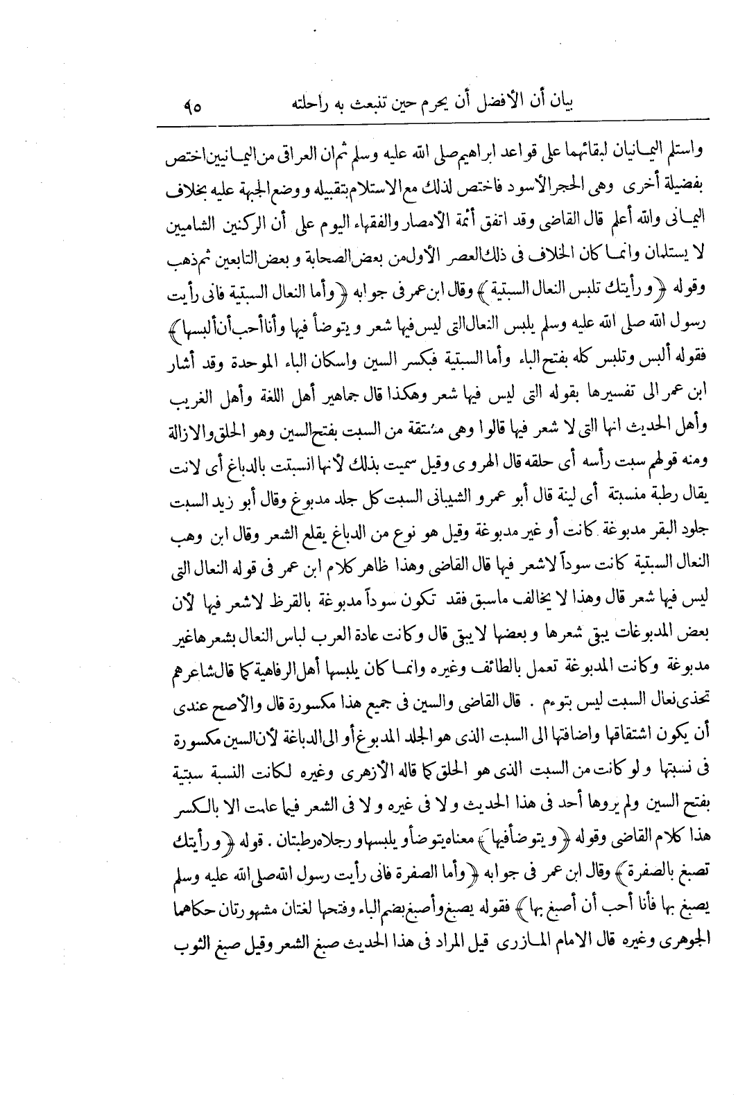 (قَالَ الْقَاضِي وَالسِّينُ فِي جَمِيعِ هَذَا مَكْسُورَةٌ قَالَ وَالْأَصَحُّ عِنْدِي أَنْ يَكُونَ اشْتِقَاقُهَا وَإِضَافَتُهَا إِلَى السِّبْتِ الَّذِي هُوَ الْجِلْدُ الْمَدْبُوغُ أَوْ إِلَى الدِّبَاغَةِ لِأَنَّ السِّينَ مَكْسُورَةٌ فِي نِسْبَتِهَا وَلَوْ كَانَتْ مِنْ السَّبْتِ الَّذِي هُوَ الْحَلْقُ كَمَا قَالَهُ الْأَزْهَرِيُّ وَغَيْرُهُ لَكَانَتِ النِّسْبَةُ سَبْتِيَّةٌ بِفَتْحِ السِّينِ وَلَمْ يَرْوِهَا أَحَدٌ فِي هَذَا الْحَدِيثِ وَلَا فِي غَيْرِهِ وَلَا فِي الشِّعْرِ فِيمَا عَلِمْتُ إِلَّا بِالْكَسْرِ هَذَا كَلَامُ الْقَاضِي وَقَوْلُهُ (وَيَتَوَضَّأُ فِيهَا) مَعْنَاهُ يَتَوَضَّأُ وَيَلْبَسُهَا وَرِجْلَاهُ رَطْبَتَانِ قَوْلُهُ (ورأيتك تصبغ بالصفرة وقال بن عُمَرَ فِي جَوَابِهِ وَأَمَّا الصُّفْرَةُ فَإِنِّي رَأَيْتُ رَسُولَ اللَّهِ صَلَّى اللَّهُ عَلَيْهِ وَسَلَّمَ يَصْبُغُ بِهَا فَأَنَا أُحِبُّ أَنْ أَصْبُغَ بِهَا) فَقَوْلُهُ يَصْبُغُ وَأَصْبُغُ بِضَمِّ الْبَاءِ وَفَتْحِهَا لُغَتَانِ مَشْهُورَتَانِ حَكَاهُمَا الْجَوْهَرِيُّ وَغَيْرُهُ قَالَ الْإِمَامُ الْمَازِرِيُّ قِيلَ الْمُرَادُ فِي هَذَا الْحَدِيثِ صَبْغُ الشَّعْرِ وَقِيلَ صبغ الثوب)