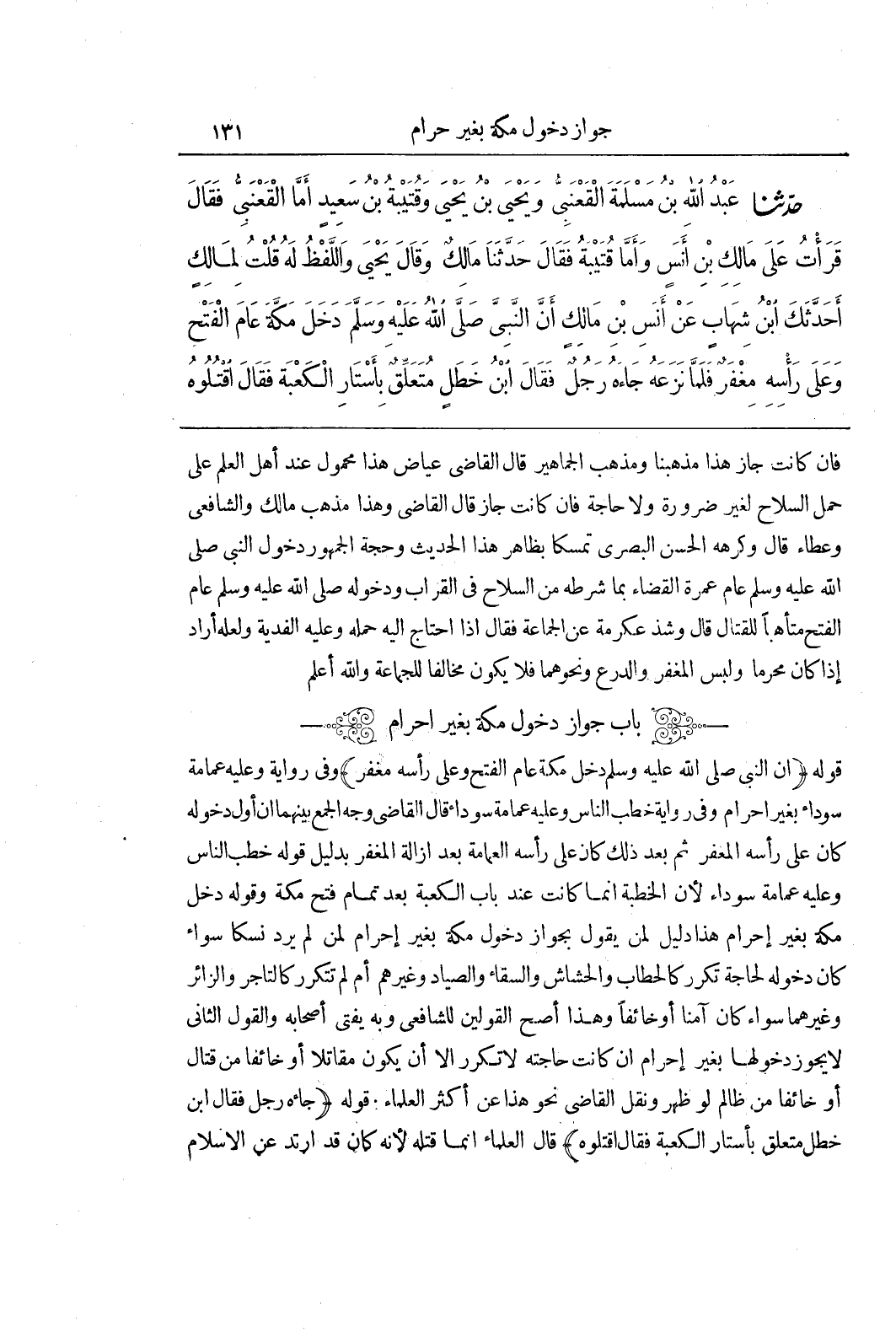 [1357] قَوْلُهُ (أَنَّ النَّبِيَّ صَلَّى اللَّهُ عَلَيْهِ وَسَلَّمَ دَخَلَ مَكَّةَ عَامَ الْفَتْحِ وَعَلَى رَأْسِهِ مِغْفَرٌ) وَفِي رِوَايَةٍ وَعَلَيْهِ عِمَامَةٌ سَوْدَاءُ بِغَيْرِ إِحْرَامٍ وَفِي رِوَايَةٍ خَطَبَ النَّاسَ وَعَلَيْهِ عِمَامَةٌ سَوْدَاءُ قَالَ الْقَاضِي وَجْهُ الْجَمْعِ بَيْنَهُمَا أَنَّ أَوَّلَ دُخُولِهِ كَانَ عَلَى رَأْسِهِ الْمِغْفَرُ ثُمَّ بَعْدَ ذَلِكَ كَانَ عَلَى رَأْسِهِ الْعِمَامَةُ بَعْدَ إِزَالَةِ الْمِغْفَرِ بِدَلِيلِ قَوْلِهِ خَطَبَ النَّاسَ وَعَلَيْهِ عِمَامَةٌ سَوْدَاءُ لِأَنَّ الْخُطْبَةَ إِنَّمَا كَانَتْ عِنْدَ بَابِ الْكَعْبَةِ بَعْدَ تَمَامِ فَتْحِ مَكَّةَ وَقَوْلِهِ دَخَلَ مَكَّةَ بِغَيْرِ إِحْرَامٍ هَذَا دَلِيلٌ لِمَنْ يَقُولُ بِجَوَازِ دُخُولِ مَكَّةَ بِغَيْرِ إِحْرَامٍ لِمَنْ لَمْ يُرِدْ نُسُكًا سَوَاءٌ كَانَ دُخُولُهُ لِحَاجَةِ تُكَرَّرٍ كَالْحَطَّابِ وَالْحَشَّاشِ وَالسَّقَّاءِ وَالصَّيَّادِ وَغَيْرِهِمْ أَمْ لَمْ تَتَكَرَّرْ كَالتَّاجِرِ وَالزَّائِرِ وَغَيْرِهِمَا سَوَاءٌ كَانَ آمِنًا أَوْ خَائِفًا وَهَذَا أَصَحُّ الْقَوْلَيْنِ لِلشَّافِعِيِّ وَبِهِ يُفْتِي أَصْحَابُهُ وَالْقَوْلُ الثَّانِي لَا يَجُوزُ دُخُولُهَا بِغَيْرِ إِحْرَامٍ إِنْ كَانَتْ حَاجَتُهُ لَا تُكَرَّرُ إِلَّا أَنْ يَكُونَ مُقَاتِلًا أَوْ خَائِفًا مِنْ قِتَالٍ أَوْ خَائِفًا مِنْ ظَالِمٍ لَوْ ظَهَرَ وَنَقَلَ الْقَاضِي نَحْوَ هَذَا عَنْ اكثر العلماء قوله (جاءه رجل فقال بن خَطَلٍ مُتَعَلِّقٌ بِأَسْتَارِ الْكَعْبَةِ فَقَالَ اقْتُلُوهُ) قَالَ الْعُلَمَاءُ إِنَّمَا قَتَلَهُ لِأَنَّهُ كَانَ قَدِ ارْتَدَّ عن الاسلام