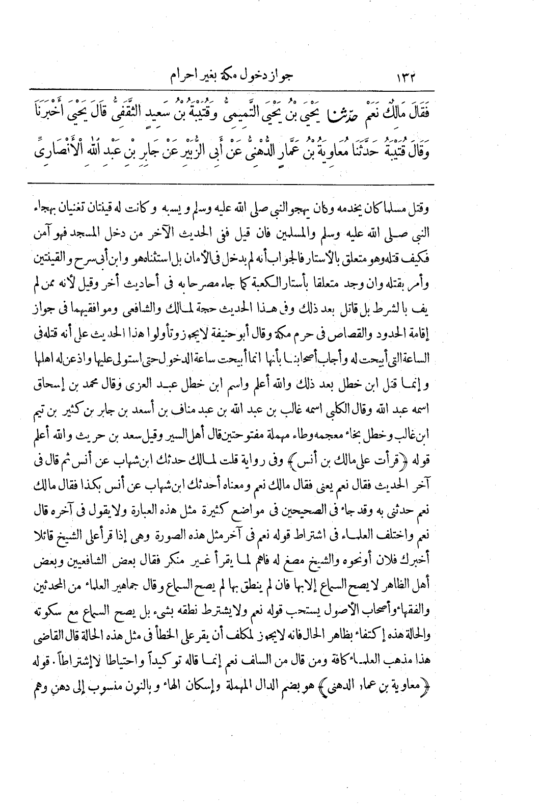 وَقَتَلَ مُسْلِمًا كَانَ يَخْدُمُهُ وَكَانَ يَهْجُو النَّبِيَّ صَلَّى اللَّهُ عَلَيْهِ وَسَلَّمَ وَيَسُبُّهُ وَكَانَتْ لَهُ قَيْنَتَانِ تُغَنِّيَانِ بِهِجَاءِ النَّبِيِّ صَلَّى اللَّهُ عَلَيْهِ وَسَلَّمَ وَالْمُسْلِمِينَ فَإِنْ قِيلَ فَفِي الْحَدِيثِ الْآخَرِ مَنْ دَخَلَ الْمَسْجِدَ فَهُوَ آمِنٌ فَكَيْفَ قَتَلَهُ وَهُوَ مُتَعَلِّقٌ بِالْأَسْتَارِ فَالْجَوَابُ أَنَّهُ لَمْ يَدْخُلْ في الأمان بل استثناه هو وبن أَبِي سَرَحٍ وَالْقَيْنَتَيْنِ وَأَمَرَ بِقَتْلِهِ وَإِنْ وُجِدَ مُتَعَلِّقًا بِأَسْتَارِ الْكَعْبَةِ كَمَا جَاءَ مُصَرَّحًا بِهِ فِي أَحَادِيثَ أُخَرَ وَقِيلَ لِأَنَّهُ مِمَّنْ لَمْ يَفِ بِالشَّرْطِ بَلْ قَاتَلَ بَعْدَ ذَلِكَ وَفِي هَذَا الْحَدِيثِ حُجَّةٌ لِمَالِكٍ وَالشَّافِعِيِّ وَمُوَافِقِيهِمَا فِي جَوَازِ إِقَامَةِ الْحُدُودِ وَالْقِصَاصِ فِي حَرَمِ مَكَّةَ وَقَالَ أَبُو حَنِيفَةَ لَا يَجُوزُ وَتَأَوَّلُوا هَذَا الْحَدِيثَ عَلَى أَنَّهُ قَتَلَهُ فِي السَّاعَةِ الَّتِي أُبِيحَتْ لَهُ وَأَجَابَ أَصْحَابُنَا بِأَنَّهَا إِنَّمَا أُبِيحَتْ سَاعَةَ الدُّخُولِ حَتَّى اسْتَوْلَى عَلَيْهَا وَأَذْعَنَ لَهُ اهلها وإنما قتل بن خطل بعد ذلك والله أعلم واسم بن خَطَلٍ عَبْدُ الْعُزَّى وَقَالَ مُحَمَّدُ بْنُ إِسْحَاقَ اسْمُهُ عَبْدُ اللَّهِ وَقَالَ الْكَلْبِيُّ اسْمُهُ غَالِبُ بْنُ عَبْدِ اللَّهِ بْنِ عَبْدِ مَنَافِ بْنِ أَسْعَدَ بْنِ جَابِرِ بْنِ كَثِيرِ بْنِ تَيْمِ بْنِ غَالِبٍ وَخَطَلٌ بِخَاءِ مُعْجَمَةٍ وَطَاءٍ مُهْمَلَةٍ مَفْتُوحَتَيْنِ قَالَ أَهْلُ السِّيَرِ وَقِيلَ سَعْدُ بْنُ حُرَيْثٍ وَاللَّهُ أَعْلَمُ قَوْلُهُ (قَرَأَتْ عَلَى مَالِكِ بْنِ أَنَسٍ) وَفِي رِوَايَةٍ قُلْتُ لِمَالِكٍ حَدَّثَكَ بن شِهَابٍ عَنْ أَنَسِ ثُمَّ قَالَ فِي آخِرِ الحديث فقال نعم يعنى فقال مالك نعم ومعناه أحدثك بن شِهَابٍ عَنْ أَنَسٍ بِكَذَا فَقَالَ مَالِكٌ نَعَمْ حَدَّثَنِي بِهِ وَقَدْ جَاءَ فِي الصَّحِيحَيْنِ فِي مَوَاضِعَ كَثِيرَةٍ مِثْلُ هَذِهِ الْعِبَارَةِ وَلَا يَقُولُ فِي آخِرِهِ قَالَ نَعَمْ وَاخْتَلَفَ الْعُلَمَاءُ فِي اشْتِرَاطِ قَوْلِهِ نَعَمْ فِي آخِرِ مِثْلِ هَذِهِ الصُّورَةِ وَهِيَ إِذَا قَرَأَ عَلَى الشَّيْخِ قَائِلًا أَخْبَرَكَ فُلَانٌ أَوْ نَحْوَهُ وَالشَّيْخُ مُصْغٍ لَهُ فَاهِمٌ لِمَا يَقْرَأُ غَيْرُ مُنْكِرٍ فَقَالَ بَعْضُ الشَّافِعِيِّينَ وَبَعْضُ أَهْلِ الظَّاهِرِ لَا يَصِحُّ السَّمَاعُ إِلَّا بِهَا فَإِنْ لَمْ يَنْطِقْ بِهَا لَمْ يَصِحَّ السَّمَاعُ وَقَالَ جَمَاهِيرُ الْعُلَمَاءِ مِنَ الْمُحَدِّثِينَ وَالْفُقَهَاءِ وَأَصْحَابِ الْأُصُولِ يُسْتَحَبُّ قَوْلُهُ نَعَمْ وَلَا يُشْتَرَطُ نُطْقُهُ بِشَيْءٍ بَلْ يَصِحُّ السَّمَاعُ مَعَ سُكُوتِهِ وَالْحَالَةُ هَذِهِ اكْتِفَاءً بِظَاهِرِ الْحَالِ فَإِنَّهُ لَا يَجُوزُ لِمُكَلَّفٍ أَنْ يُقِرَّ عَلَى الْخَطَأِ فِي مِثْلِ هَذِهِ الْحَالَةِ قَالَ الْقَاضِي هَذَا مَذْهَبُ الْعُلَمَاءِ كَافَّةً وَمَنْ قَالَ مِنَ السَّلَفِ نَعَمْ إِنَّمَا قَالَهُ تَوْكِيدًا وَاحْتِيَاطًا لَا اشْتِرَاطًا