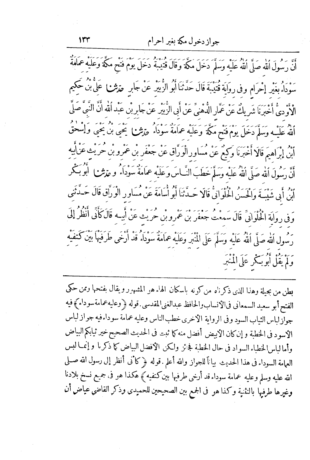 [1359] قَوْلُهُ (وَعَلَيْهِ عِمَامَةٌ سَوْدَاءُ) فِيهِ جَوَازُ لِبَاسِ الثِّيَابِ السُّودِ وَفِي الرِّوَايَةِ الْأُخْرَى خَطَبَ النَّاسَ وَعَلَيْهِ عِمَامَةٌ سَوْدَاءُ فِيهِ جَوَازُ لِبَاسِ الْأَسْوَدِ فِي الْخُطْبَةِ وَإِنْ كَانَ الْأَبْيَضُ أَفْضَلَ مِنْهُ كَمَا ثَبَتَ فِي الْحَدِيثِ الصَّحِيحِ خَيْرُ ثِيَابِكُمُ الْبَيَاضُ وَأَمَّا لِبَاسُ الْخُطَبَاءِ السَّوَادَ فِي حَالِ الْخُطْبَةِ فَجَائِزٌ وَلَكِنَّ الْأَفْضَلَ الْبَيَاضُ كَمَا ذَكَرْنَا وَإِنَّمَا لَبِسَ الْعِمَامَةَ السَّوْدَاءَ فِي هَذَا الْحَدِيثِ بَيَانًا لِلْجَوَازِ وَاللَّهُ أَعْلَمُ قَوْلُهُ (كَأَنِّي أَنْظُرُ إِلَى رَسُولِ اللَّهِ صَلَّى اللَّهُ عَلَيْهِ وَسَلَّمَ وَعَلَيْهِ عِمَامَةٌ سَوْدَاءُ قَدْ أَرْخَى طَرَفَيْهَا بَيْنَ كَتِفَيْهِ) هَكَذَا هُوَ فِي جَمِيعِ نُسَخِ بِلَادِنَا وَغَيْرِهَا طَرَفَيْهَا بِالتَّثْنِيَةِ وَكَذَا هُوَ فِي الْجَمْعِ بَيْنَ الصَّحِيحَيْنِ لِلْحُمَيْدِيِّ وَذَكَرَ الْقَاضِي عِيَاضٌ أَنَّ