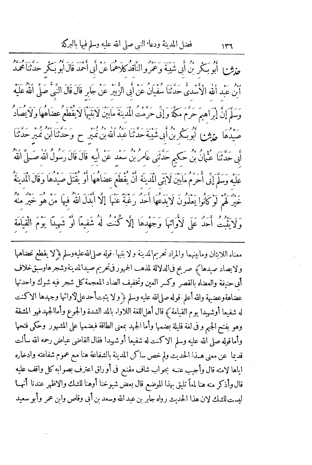 [1362] قَوْلُهُ صَلَّى اللَّهُ عَلَيْهِ وَسَلَّمَ (لَا يُقْطَعُ عِضَاهُهَا وَلَا يُصَادُ صَيْدُهَا) صَرِيحٌ فِي الدَّلَالَةِ لِمَذْهَبِ الْجُمْهُورِ فِي تَحْرِيمِ صَيْدِ الْمَدِينَةِ وَشَجَرِهَا وَسَبَقَ خِلَافُ أَبِي حَنِيفَةَ وَالْعِضَاهُ بِالْقَصْرِ وَكَسْرِ الْعَيْنِ وَتَخْفِيفِ الضَّادِ الْمُعْجَمَةِ كُلُّ شَجَرٍ فِيهِ شَوْكٌ وَاحِدَتُهَا عِضَاهَةٌ وَعَضِيهَةٌ وَاللَّهُ أَعْلَمُ