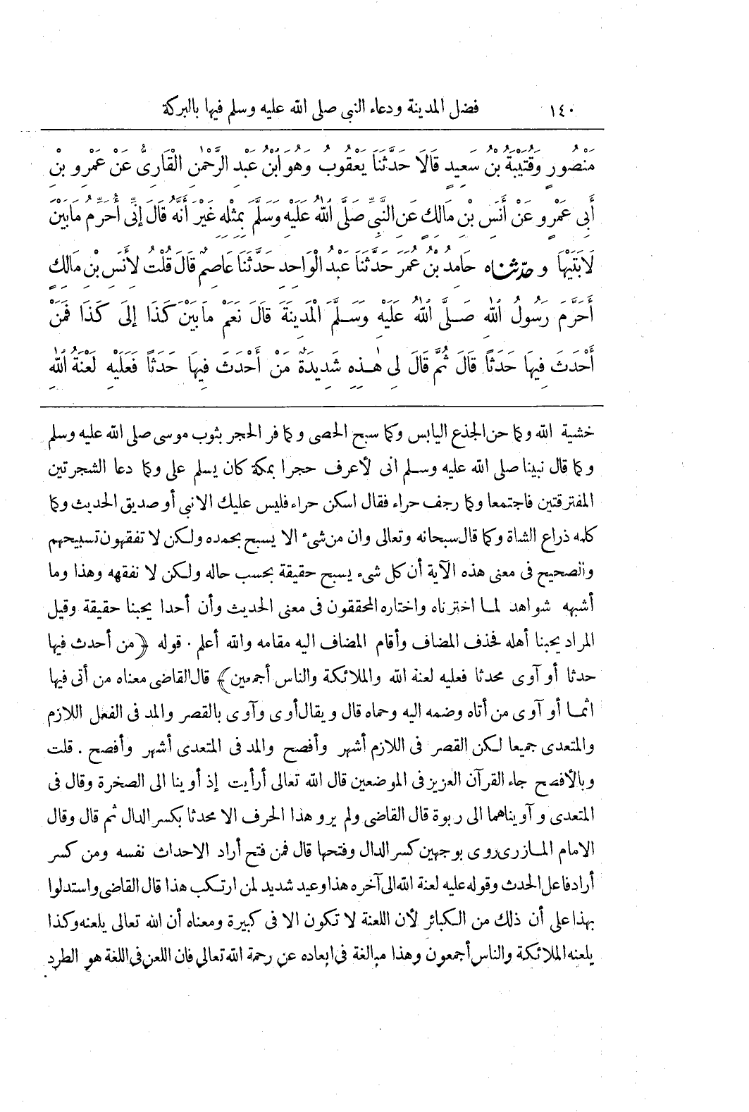 [1366] قَوْلُهُ (مَنْ أَحْدَثَ فِيهَا حَدَثًا أَوْ آوَى مُحْدِثًا فَعَلَيْهِ لَعْنَةُ اللَّهِ وَالْمَلَائِكَةِ وَالنَّاسِ أَجْمَعِينَ) قَالَ الْقَاضِي مَعْنَاهُ مَنْ أَتَى فِيهَا إِثْمًا أَوْ آوَى مَنْ أَتَاهُ وَضَمَّهُ إِلَيْهِ وَحَمَاهُ قَالَ وَيُقَالُ أَوَى وَآوَى بِالْقَصْرِ وَالْمَدِّ فِي الْفِعْلِ اللَّازِمِ وَالْمُتَعَدِّي جَمِيعًا لَكِنَّ الْقَصْرَ فِي اللَّازِمِ أَشْهَرُ وَأَفْصَحُ وَالْمَدُّ فِي الْمُتَعَدِّي أَشْهَرُ وَأَفْصَحُ قُلْتُ وَبِالْأَفْصَحِ جَاءَ الْقُرْآنُ الْعَزِيزُ فِي الْمَوْضِعَيْنِ قَالَ اللَّهُ تَعَالَى أَرَأَيْتَ إِذْ أَوَيْنَا إِلَى الصخرة وقال في المتعدى وآويناهما إلى ربوة قَالَ الْقَاضِي وَلَمْ يُرْوَ هَذَا الْحَرْفُ إِلَّا مُحْدِثًا بِكَسْرِ الدَّالِ ثُمَّ قَالَ وَقَالَ الْإِمَامُ الْمَازِرِيُّ رُوِيَ بِوَجْهَيْنِ كَسْرِ الدَّالِ وَفَتْحِهَا قَالَ فَمَنْ فَتَحَ أَرَادَ الْإِحْدَاثَ نَفْسَهُ وَمَنْ كَسَرَ أَرَادَ فَاعِلَ الْحَدَثِ وَقَوْلُهُ عَلَيْهِ لَعْنَةُ اللَّهِ إِلَى آخِرِهِ هَذَا وَعِيدٌ شَدِيدٌ لِمَنِ ارْتَكَبَ هَذَا قَالَ الْقَاضِي وَاسْتَدَلُّوا بِهَذَا عَلَى أَنَّ ذَلِكَ مِنَ الْكَبَائِرِ لِأَنَّ اللَّعْنَةَ لَا تَكُونُ إِلَّا فِي كَبِيرَةٍ وَمَعْنَاهُ أَنَّ اللَّهَ تَعَالَى يَلْعَنُهُ وَكَذَا يَلْعَنُهُ الْمَلَائِكَةُ وَالنَّاسُ أَجْمَعُونَ وَهَذَا مُبَالَغَةٌ فِي إِبْعَادِهِ عَنْ رَحْمَةِ اللَّهِ تَعَالَى فَإِنَّ اللَّعْنَ فِي اللُّغَةِ هُوَ الطَّرْدُ