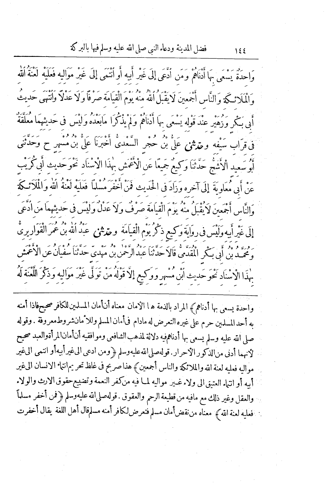 وَاحِدَةٌ يَسْعَى بِهَا أَدْنَاهُمْ) الْمُرَادُ بِالذِّمَّةِ هُنَا الْأَمَانُ مَعْنَاهُ أَنَّ أَمَانَ الْمُسْلِمِينَ لِلْكَافِرِ صَحِيحٌ فَإِذَا أَمَّنَهُ بِهِ أَحَدُ الْمُسْلِمِينَ حَرُمَ عَلَى غَيْرِهِ التَّعَرُّضُ لَهُ مَا دَامَ فِي أَمَانِ الْمُسْلِمِ وَلِلْأَمَانِ شُرُوطٌ مَعْرُوفَةٌ وَقَوْلُهُ صَلَّى اللَّهُ عَلَيْهِ وَسَلَّمَ يَسْعَى بِهَا أَدْنَاهُمْ فِيهِ دَلَالَةٌ لِمَذْهَبِ الشَّافِعِيِّ وَمُوَافِقِيهِ أَنَّ أَمَانَ الْمَرْأَةِ وَالْعَبْدِ صحيح لِأَنَّهُمَا أَدْنَى مِنَ الذُّكُورِ الْأَحْرَارِ قَوْلُهُ صَلَّى اللَّهُ عَلَيْهِ وَسَلَّمَ (وَمَنِ ادَّعَى إِلَى غَيْرِ أَبِيهِ أَوِ انْتَمَى إِلَى غَيْرِ مَوَالِيهِ فَعَلَيْهِ لَعْنَةُ اللَّهِ وَالْمَلَائِكَةِ وَالنَّاسِ أَجْمَعِينَ) هَذَا صَرِيحٌ فِي غِلَظِ تَحْرِيمِ انْتِمَاءِ الْإِنْسَانِ إِلَى غَيْرِ أَبِيهِ أَوِ انْتِمَاءِ الْعَتِيقِ إِلَى وَلَاءِ غَيْرِ مَوَالِيهِ لِمَا فِيهِ مِنْ كُفْرِ النِّعْمَةِ وَتَضْيِيعِ حُقُوقِ الْإِرْثِ وَالْوَلَاءِ وَالْعَقْلِ وَغَيْرِ ذَلِكَ مَعَ مَا فِيهِ مِنْ قَطِيعَةِ الرَّحِمِ وَالْعُقُوقِ قَوْلُهُ صَلَّى اللَّهُ عَلَيْهِ وَسَلَّمَ (فَمَنْ أَخْفَرَ مُسْلِمًا فَعَلَيْهِ لَعْنَةُ اللَّهِ) مَعْنَاهُ مَنْ نَقَضَ أَمَانَ مُسْلِمٍ فَتَعَرَّضَ لِكَافِرٍ أَمَّنَهُ مُسْلِمٌ قَالَ أَهْلُ اللُّغَةِ يُقَالُ أَخَفَرْتَ