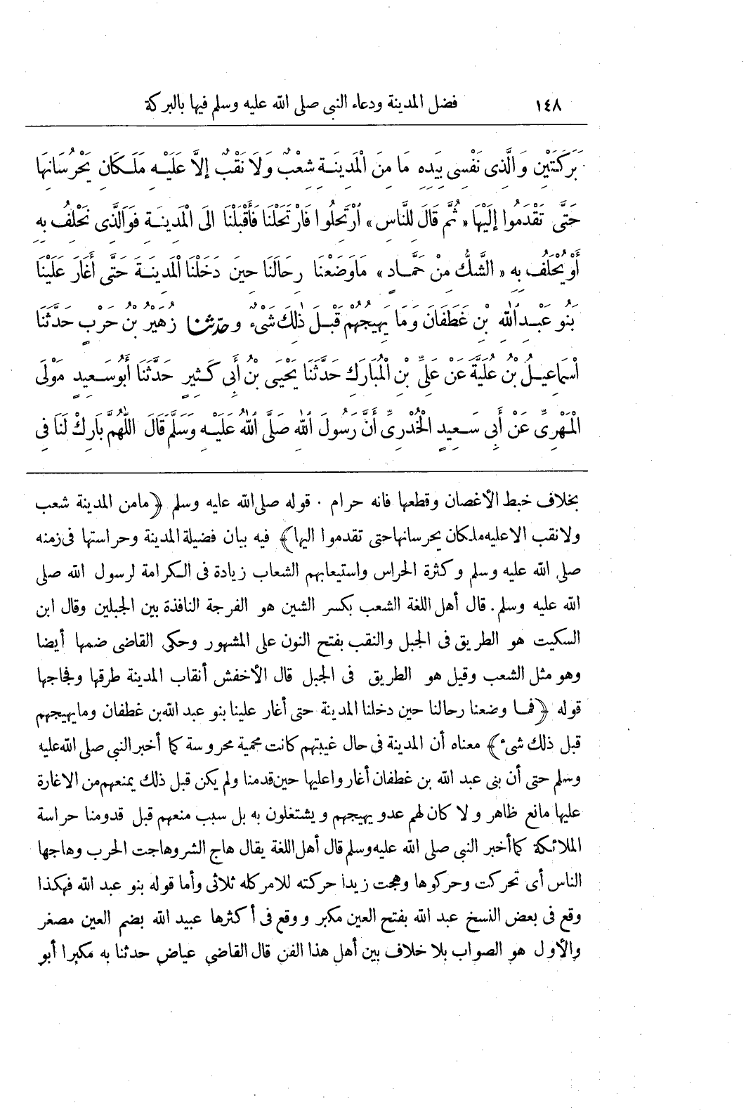 بِخِلَافِ خَبْطِ الْأَغْصَانِ وَقَطْعِهَا فَإِنَّهُ حَرَامٌ قَوْلُهُ صَلَّى اللَّهُ عَلَيْهِ وَسَلَّمَ مَا مِنْ الْمَدِينَةِ شِعْبٌ وَلَا نَقْبٌ إِلَّا عَلَيْهِ مَلَكَانِ يَحْرُسَانِهَا حَتَّى تَقْدَمُوا إِلَيْهَا فِيهِ بَيَانُ فَضِيلَةِ الْمَدِينَةِ وَحِرَاسَتِهَا فِي زَمَنِهِ صَلَّى اللَّهُ عَلَيْهِ وَسَلَّمَ وَكَثْرَةِ الْحُرَّاسِ وَاسْتِيعَابِهِمُ الشِّعَابُ زِيَادَةٌ فِي الْكَرَامَةِ لِرَسُولِ اللَّهِ صَلَّى اللَّهُ عَلَيْهِ وَسَلَّمَ قَالَ أَهْلُ اللُّغَةِ الشِّعْبُ بِكَسْرِ الشِّينِ هُوَ الْفُرْجَةُ النافذة بين الجبلين وقال بن السِّكِّيتِ هُوَ الطَّرِيقُ فِي الْجَبَلِ وَالنَّقْبُ بِفَتْحِ النُّونِ عَلَى الْمَشْهُورِ وَحَكَى الْقَاضِي ضَمَّهَا أَيْضًا وَهُوَ مِثْلُ الشِّعْبِ وَقِيلَ هُوَ الطَّرِيقُ فِي الجبل قال الأخفش أنقاب المدينة وطرقها وَفِجَاجُهَا قَوْلُهُ فَمَا وَضَعْنَا رِحَالَنَا حِينَ دَخَلْنَا الْمَدِينَةَ حَتَّى أَغَارَ عَلَيْنَا بَنُو عَبْدِ اللَّهِ بْنِ غَطَفَانَ وَمَا يَهِيجُهُمْ قَبْلَ ذَلِكَ شَيْءٌ مَعْنَاهُ أَنَّ الْمَدِينَةَ فِي حَالِ غَيْبَتِهِمْ كَانَتْ مَحْمِيَّةً مَحْرُوسَةً كَمَا أَخْبَرَ النَّبِيُّ صَلَّى اللَّهُ عَلَيْهِ وَسَلَّمَ حَتَّى إِنَّ بَنِي عَبْدِ اللَّهِ بْنِ غَطَفَانَ أَغَارُوا عَلَيْهَا حِينَ قَدِمْنَا وَلَمْ يَكُنْ قَبْلَ ذَلِكَ يَمْنَعُهُمْ مِنَ الْإِغَارَةِ عَلَيْهَا مَانِعٌ ظَاهِرٌ وَلَا كَانَ لَهُمْ عَدُوٌّ يَهِيجُهُمْ وَيَشْتَغِلُونَ بِهِ بَلْ سَبَبُ مَنْعِهِمْ قَبْلَ قُدُومِنَا حِرَاسَةُ الْمَلَائِكَةِ كَمَا أَخْبَرَ النَّبِيِّ صَلَّى اللَّهُ عَلَيْهِ وَسَلَّمَ قَالَ أَهْلُ اللُّغَةِ يُقَالُ هَاجَ الشَّرُّ وَهَاجَتِ الْحَرْبُ وَهَاجَهَا النَّاسُ أَيْ تَحَرَّكَتْ وَحَرَّكُوهَا وَهِجْتُ زَيْدًا حَرَّكْتُهُ لِلْأَمْرِ كُلُّهُ ثَلَاثِيٌّ وَأَمَّا قَوْلُهُ بَنُو عَبْدِ اللَّهِ فَهَكَذَا وَقَعَ فِي بَعْضِ النُّسَخِ عَبْدِ اللَّهِ بِفَتْحِ الْعَيْنِ مُكَبَّرٌ وَوَقَعَ فِي أَكْثَرِهَا عُبَيْدِ اللَّهِ بِضَمِّ الْعَيْنِ مُصَغَّرٌ وَالْأَوَّلُ هُوَ الصَّوَابُ بِلَا خِلَافٍ بَيْنَ أَهْلِ هَذَا الْفَنِّ قَالَ الْقَاضِي عِيَاضٌ حَدَّثَنَا بِهِ مُكَبَّرًا أَبُو
