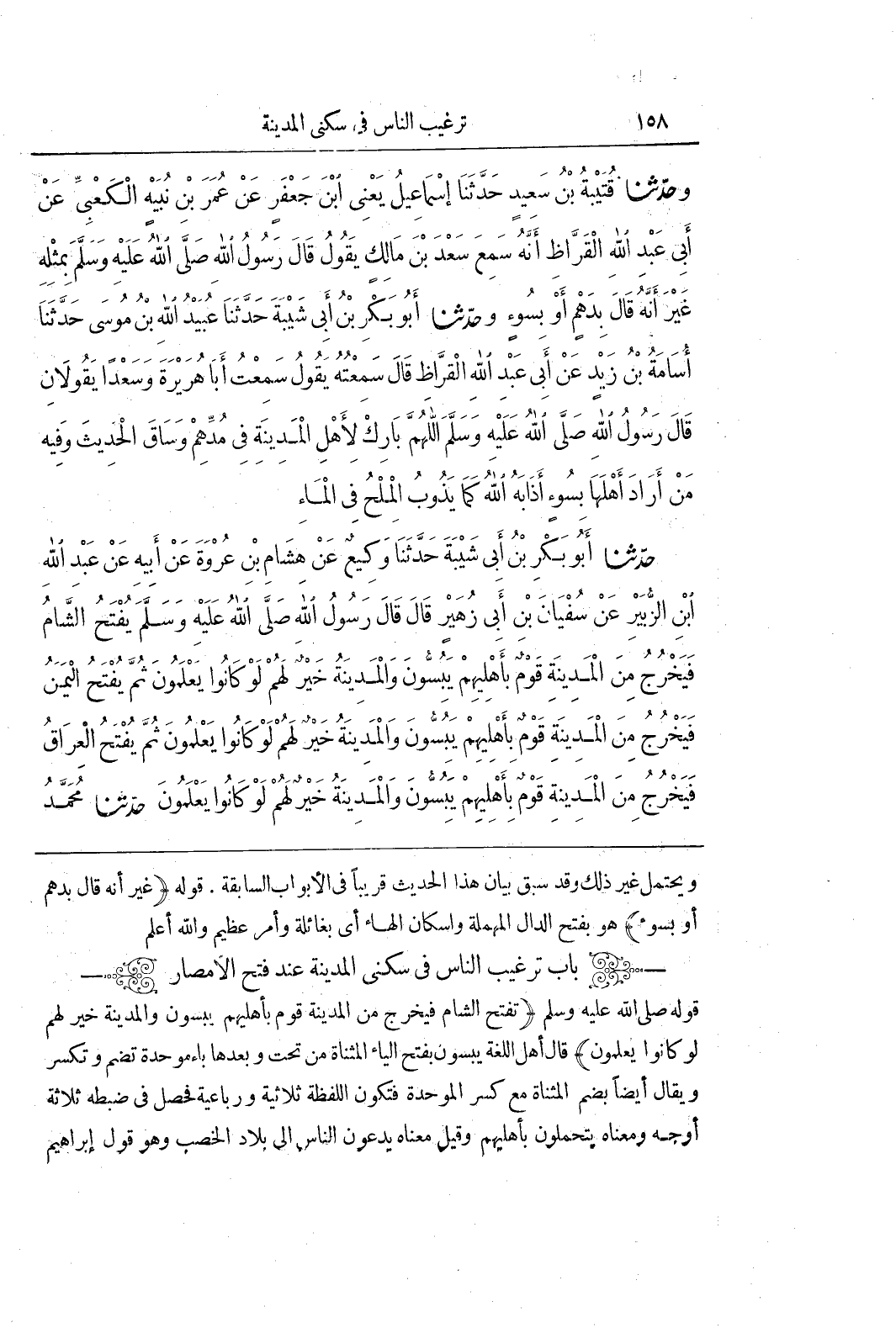 [1388] قَوْلُهُ صَلَّى اللَّهُ عَلَيْهِ وَسَلَّمَ (تُفْتَحُ الشَّامُ فَيَخْرُجُ مِنَ الْمَدِينَةِ قَوْمٌ بِأَهْلِيهِمْ يَبُسُّونَ وَالْمَدِينَةُ خَيْرٌ لَهُمْ لَوْ كَانُوا يَعْلَمُونَ) قَالَ أَهْلُ اللُّغَةِ يَبُسُّونَ بِفَتْحِ الْيَاءِ الْمُثَنَّاةِ مِنْ تَحْتَ وَبَعْدَهَا بَاءٌ مُوَحَّدَةٌ تُضَمُّ وَتُكْسَرُ وَيُقَالُ أَيْضًا بِضَمِّ الْمُثَنَّاةِ مَعَ كَسْرِ الْمُوَحَّدَةِ فَتَكُونُ اللَّفْظَةُ ثُلَاثِيَّةً وَرُبَاعِيَّةً فَحَصَلَ فِي ضَبْطِهِ ثَلَاثَةُ أَوْجُهٍ وَمَعْنَاهُ يَتَحَمَّلُونَ بِأَهْلِيهِمْ وَقِيلَ مَعْنَاهُ يَدْعُونَ النَّاسَ إِلَى بِلَادِ الْخِصْبِ وهو قول ابراهيم