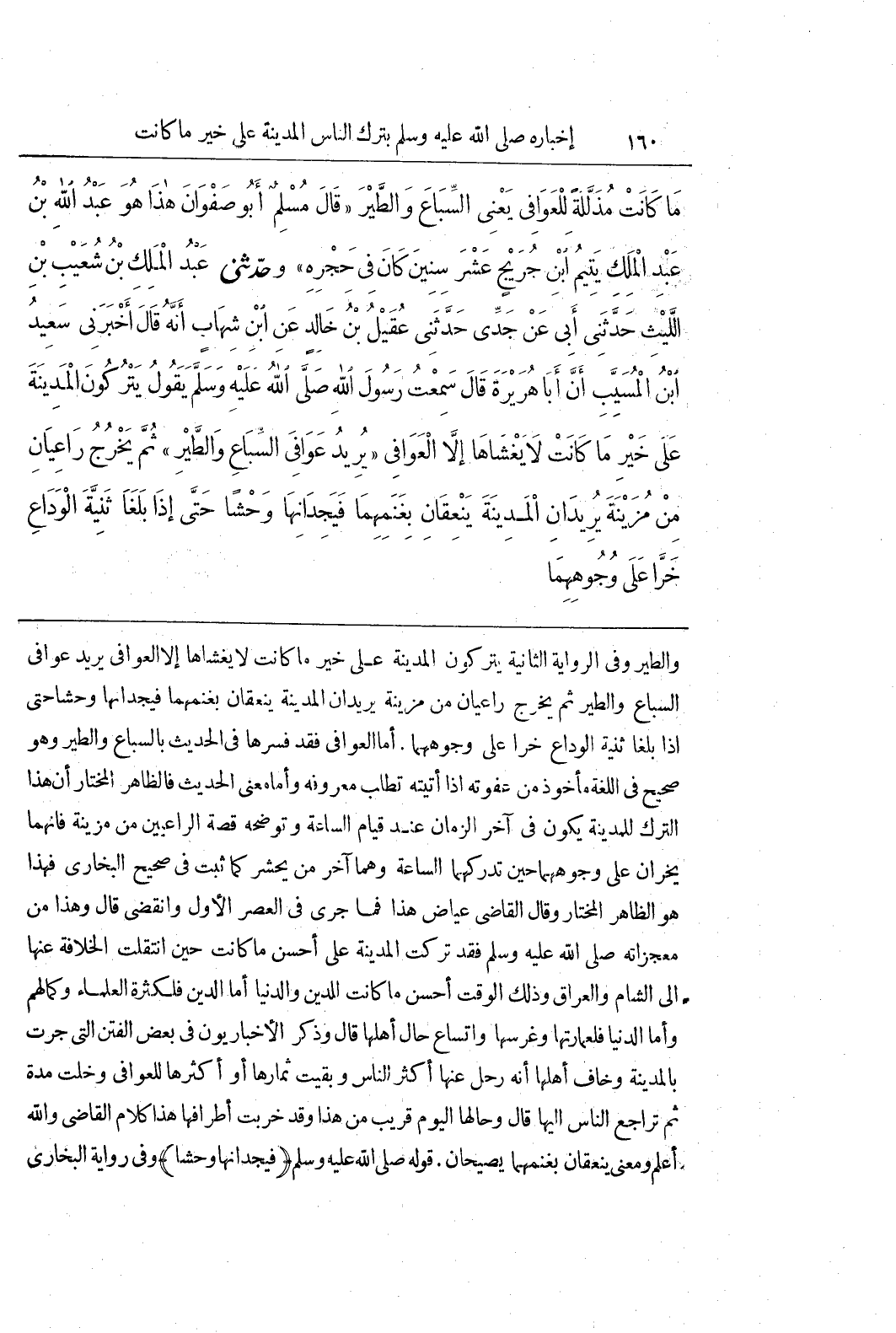 والطيروفي الرِّوَايَةِ الثَّانِيَةِ يَتْرُكُونَ الْمَدِينَةَ عَلَى خَيْرِ مَا كَانَتْ لَا يَغْشَاهَا إِلَّا الْعَوَافِي يُرِيدُ عَوَافِيَ السِّبَاعِ وَالطَّيْرِ ثُمَّ يَخْرُجُ رَاعِيَانِ مِنْ مُزَيْنَةَ يريدان المدينة ينعقان بغنمها فَيَجِدَانِهَا وَحْشًا حَتَّى إِذَا بَلَغَا ثَنِيَّةَ الْوَدَاعِ خَرَّا عَلَى وُجُوهِهِمَا أَمَّا الْعَوَافِي فَقَدْ فَسَّرَهَا فِي الْحَدِيثِ بِالسِّبَاعِ وَالطَّيْرِ وَهُوَ صَحِيحٌ فِي اللُّغَةِ مَأْخُوذٌ مِنْ عَفَوْتِهِ إِذَا أَتَيْتَهُ تَطْلُبُ مَعْرُوفَهُ وَأَمَّا مَعْنَى الْحَدِيثِ فَالظَّاهِرُ الْمُخْتَارُ أَنَّ هَذَا التَّرْكَ لِلْمَدِينَةِ يَكُونُ فِي آخِرِ الزَّمَانِ عند قيام الساعة وتوضحه قصة الراعبين مِنْ مُزَيْنَةَ فَإِنَّهُمَا يَخِرَّانِ عَلَى وُجُوهِهِمَا حِينَ تُدْرِكُهُمَا السَّاعَةُ وَهُمَا آخِرُ مَنْ يُحْشَرُ كَمَا ثَبَتَ فِي صَحِيحِ الْبُخَارِيِّ فَهَذَا هُوَ الظَّاهِرُ المختار وقال القاضي عياض هذا فما جَرَى فِي الْعَصْرِ الْأَوَّلِ وَانْقَضَى قَالَ وَهَذَا مِنْ مُعْجِزَاتِهِ صَلَّى اللَّهُ عَلَيْهِ وَسَلَّمَ فَقَدْ تُرِكَتِ الْمَدِينَةُ عَلَى أَحْسَنِ مَا كَانَتْ حِينَ انْتَقَلَتِ الْخِلَافَةُ عَنْهَا إِلَى الشَّامِ وَالْعِرَاقِ وَذَلِكَ الْوَقْتُ أَحْسَنُ مَا كَانَتِ الدِّينَ وَالدُّنْيَا أَمَّا الدِّينُ فَلِكَثْرَةِ الْعُلَمَاءِ وَكَمَالِهِمْ وَأَمَّا الدُّنْيَا فَلِعِمَارَتِهَا وَغَرْسِهَا وَاتِّسَاعِ حَالِ أَهْلِهَا قَالَ وَذَكَرَ الْأَخْبَارِيُّونَ فِي بَعْضِ الْفِتَنِ الَّتِي جَرَتْ بِالْمَدِينَةِ وَخَافَ أَهْلُهَا أَنَّهُ رَحَلَ عَنْهَا أَكْثَرُ النَّاسِ وَبَقِيَتْ ثِمَارُهَا أَوْ أَكْثَرُهَا لِلْعَوَافِي وَخَلَتْ مُدَّةً ثُمَّ تَرَاجَعَ النَّاسُ إِلَيْهَا قَالَ وَحَالُهَا الْيَوْمَ قَرِيبٌ مِنْ هَذَا وَقَدْ خَرِبَتْ أَطْرَافُهَا هَذَا كَلَامُ الْقَاضِي وَاللَّهُ أَعْلَمُ وَمَعْنَى يَنْعِقَانِ بِغَنَمِهِمَا يَصِيحَانِ قَوْلُهُ صَلَّى اللَّهُ عَلَيْهِ وَسَلَّمَ (فَيَجِدَانِهَا وَحْشًا) وَفِي رِوَايَةِ الْبُخَارِيِّ