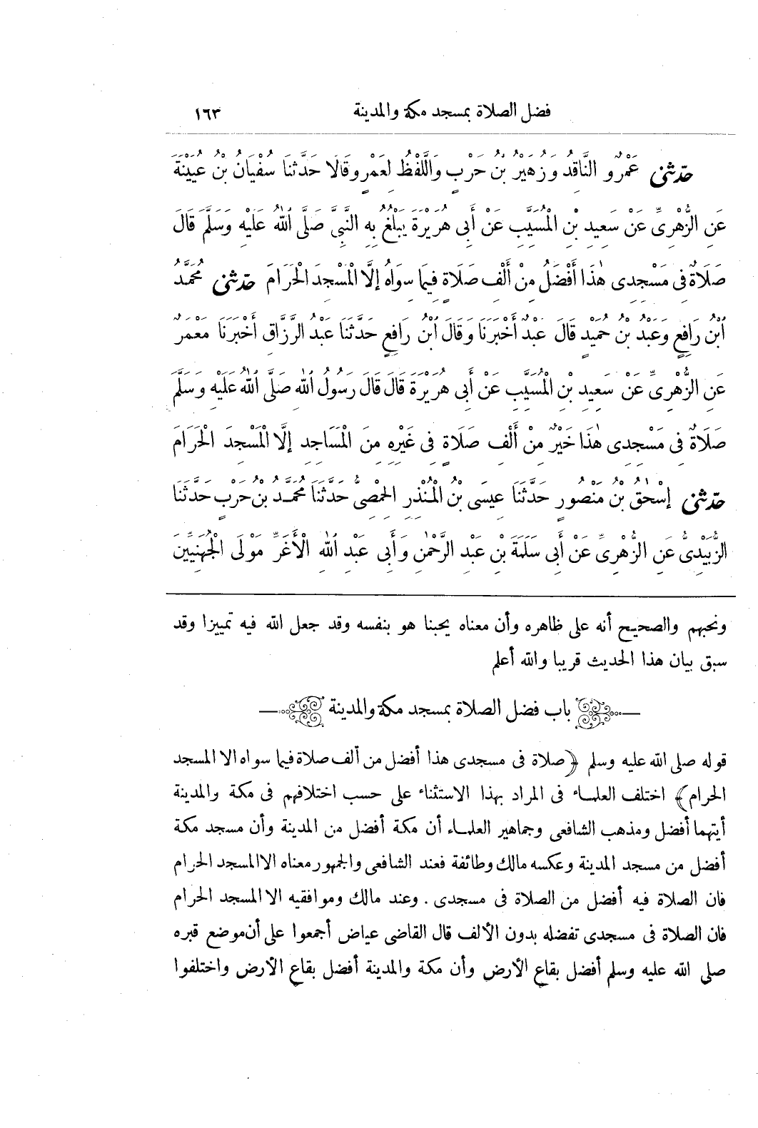 [1394] قَوْلُهُ صَلَّى اللَّهُ عَلَيْهِ وَسَلَّمَ (صَلَاةٌ فِي مَسْجِدِي هَذَا أَفْضَلُ مِنْ أَلْفِ صَلَاةٍ فِيمَا سِوَاهُ إِلَّا الْمَسْجِدَ الْحَرَامَ) اخْتَلَفَ الْعُلَمَاءُ فِي الْمُرَادِ بِهَذَا الِاسْتِثْنَاءِ عَلَى حَسَبِ اخْتِلَافِهِمْ فِي مَكَّةَ وَالْمَدِينَةِ أَيَّتُهُمَا أَفْضَلُ وَمَذْهَبُ الشَّافِعِيِّ وَجَمَاهِيرِ الْعُلَمَاءِ أَنَّ مَكَّةَ أَفْضَلُ مِنَ الْمَدِينَةِ وَأَنَّ مَسْجِدَ مَكَّةَ أَفْضَلُ مِنْ مَسْجِدِ الْمَدِينَةِ وَعَكَسَهُ مَالِكٌ وَطَائِفَةٌ فَعِنْدَ الشَّافِعِيِّ وَالْجُمْهُورِ مَعْنَاهُ إِلَّا الْمَسْجِدَ الْحَرَامَ فَإِنَّ الصَّلَاةَ فِيهِ أَفْضَلُ مِنَ الصَّلَاةِ فِي مَسْجِدِي وَعِنْدَ مَالِكٍ وَمُوَافِقِيهِ إِلَّا الْمَسْجِدَ الْحَرَامَ فَإِنَّ الصَّلَاةَ فِي مَسْجِدِي تَفْضُلُهُ بِدُونِ الْأَلْفِ قَالَ الْقَاضِي عِيَاضٌ أَجْمَعُوا عَلَى أَنَّ مَوْضِعَ قَبْرِهِ صَلَّى اللَّهُ عَلَيْهِ وَسَلَّمَ أَفْضَلُ بِقَاعِ الْأَرْضِ وَأَنَّ مَكَّةَ وَالْمَدِينَةَ أَفْضَلُ بِقَاعِ الْأَرْضِ وَاخْتَلَفُوا