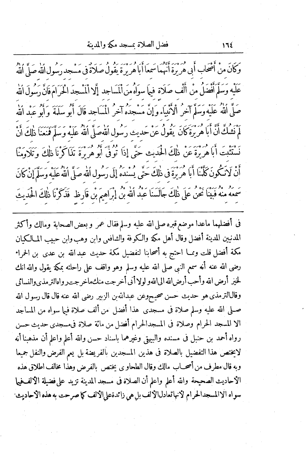 فِي أَفْضَلِهِمَا مَا عَدَا مَوْضِعِ قَبْرِهِ صَلَّى اللَّهُ عَلَيْهِ وَسَلَّمَ فَقَالَ عُمَرُ وَبَعْضُ الصَّحَابَةِ وَمَالِكٌ وَأَكْثَرُ الْمَدَنِيِّينَ الْمَدِينَةُ أَفْضَلُ وَقَالَ أَهْلُ مكة والكوفة والشافعي وبن وهب وبن حَبِيبٍ الْمَالِكِيَّانِ مَكَّةُ أَفْضَلُ قُلْتُ وَمِمَّا احْتَجَّ بِهِ أَصْحَابُنَا لِتَفْضِيلِ مَكَّةَ حَدِيثُ عَبْدِ اللَّهِ بْنِ عَدِيِّ بْنِ الْحَمْرَاءِ رَضِيَ اللَّهُ عَنْهُ أَنَّهُ سَمِعَ النَّبِيَّ صَلَّى اللَّهُ عَلَيْهِ وَسَلَّمَ وَهُوَ وَاقِفٌ عَلَى رَاحِلَتِهِ بِمَكَّةَ يَقُولُ وَاللَّهِ إِنَّكِ لَخَيْرُ أَرْضِ اللَّهِ وَأَحَبُّ أَرْضِ اللَّهِ إِلَى اللَّهِ وَلَوْلَا أَنِّي أُخْرِجْتُ مِنْكِ مَا خَرَجْتُ رَوَاهُ التِّرْمِذِيُّ وَالنَّسَائِيُّ وَقَالَ التِّرْمِذِيُّ هُوَ حَدِيثٌ حَسَنٌ صَحِيحٌ وَعَنْ عَبْدِ اللَّهِ بْنِ الزُّبَيْرِ رَضِيَ اللَّهُ عَنْهُ قَالَ قَالَ رَسُولُ اللَّهِ صَلَّى اللَّهُ عَلَيْهِ وَسَلَّمَ صَلَاةٌ فِي مَسْجِدِي هَذَا أَفْضَلُ مِنْ أَلْفِ صَلَاةٍ فِيمَا سِوَاهُ مِنَ الْمَسَاجِدِ إِلَّا الْمَسْجِدَ الْحَرَامِ وَصَلَاةٌ فِي الْمَسْجِدِ الْحَرَامِ أَفْضَلُ مِنْ مِائَةِ صَلَاةٍ فِي مَسْجِدِي حَدِيثٌ حَسَنٌ رَوَاهُ أَحْمَدُ بْنُ حَنْبَلٍ فِي مُسْنَدِهِ وَالْبَيْهَقِيُّ وَغَيْرُهُمَا بِإِسْنَادٍ حَسَنٍ وَاللَّهُ أَعْلَمُ وَاعْلَمْ أَنَّ مَذْهَبَنَا أَنَّهُ لَا يَخْتَصُّ هَذَا التَّفْضِيلُ بِالصَّلَاةِ فِي هَذَيْنِ الْمَسْجِدَيْنِ بِالْفَرِيضَةِ بَلْ يَعُمُّ الْفَرْضَ وَالنَّفْلَ جَمِيعًا وَبِهِ قَالَ مُطَرَّفٌ مِنْ أَصْحَابِ مَالِكٍ وَقَالَ الطَّحَاوِيُّ يَخْتَصُّ بِالْفَرْضِ وَهَذَا مُخَالِفٌ إِطْلَاقَ هَذِهِ الْأَحَادِيثِ الصَّحِيحَةِ وَاللَّهُ أَعْلَمُ وَاعْلَمْ أَنَّ الصَّلَاةَ فِي مَسْجِدِ الْمَدِينَةِ تَزِيدُ عَلَى فَضِيلَةِ الْأَلْفِ فِيمَا سِوَاهُ إِلَّا الْمَسْجِدَ الْحَرَامَ لِأَنَّهَا تُعَادِلُ الْأَلْفَ بَلْ هِيَ زَائِدَةٌ عَلَى الْأَلْفِ كَمَا صُرِّحَتْ بِهِ هَذِهِ الْأَحَادِيثُ