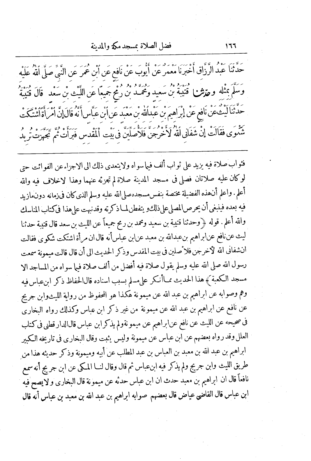 [1396] قَوْلُهُ (وَحَدَّثَنَا قُتَيْبَةُ بْنُ سَعِيدٍ وَمُحَمَّدُ بْنُ رُمْحٍ جَمِيعًا عَنِ اللَّيْثِ بْنِ سَعْدٍ قَالَ قُتَيْبَةُ حَدَّثَنَا لَيْثٌ عَنْ نَافِعٍ عَنْ إِبْرَاهِيمَ بْنِ عَبْدِ اللَّهِ بْنِ معبد عن بن عباس أنه قال ان مرأة اشْتَكَتْ شَكْوَى فَقَالَتْ إِنْ شَفَانِي اللَّهُ لَأَخْرُجَنَّ فَلَأُصَلِّيَنَّ فِي بَيْتِ الْمَقْدِسِ وَذَكَرَ الْحَدِيثَ إِلَى أَنْ قَالَ قَالَتْ مَيْمُونَةُ سَمِعْتُ رَسُولَ اللَّهِ صَلَّى اللَّهُ عَلَيْهِ وَسَلَّمَ يَقُولُ صَلَاةٌ فِيهِ أَفْضَلُ مِنْ أَلْفِ صَلَاةٍ فِيمَا سِوَاهُ مِنَ الْمَسَاجِدِ إِلَّا مَسْجِدَ الْكَعْبَةِ) هَذَا الْحَدِيثُ مِمَّا أُنْكِرَ عَلَى مُسْلِمٍ بِسَبَبِ إِسْنَادِهِ قَالَ الْحُفَّاظُ ذكر بن عَبَّاسٍ فِيهِ وَهَمٌ وَصَوَابُهُ عَنْ إِبْرَاهِيمَ بْنِ عَبْدِ اللَّهِ عَنْ مَيْمُونَةَ هَكَذَا هُوَ الْمَحْفُوظُ من رواية الليث وبن جُرَيْجٍ عَنْ نَافِعٍ عَنْ إِبْرَاهِيمَ بْنِ عَبْدِ الله عن ميمونة من غير ذكر بن عَبَّاسٍ وَكَذَلِكَ رَوَاهُ الْبُخَارِيُّ فِي صَحِيحِهِ عَنِ اللَّيْثِ عَنْ نَافِعٍ عَنْ إِبْرَاهِيمَ عَنْ مَيْمُونَةَ ولم يذكر بن عَبَّاسٍ قَالَ الدَّارَقُطْنِيُّ فِي كِتَابِ الْعِلَلِ وَقَدْ رواه بعضهم عن بن عَبَّاسٍ عَنْ مَيْمُونَةَ وَلَيْسَ يَثْبُتُ وَقَالَ الْبُخَارِيُّ فِي تَارِيخِهِ الْكَبِيرِ إِبْرَاهِيمُ بْنُ عَبْدِ اللَّهِ بْنِ مَعْبَدِ بْنِ الْعَبَّاسِ بْنِ عَبْدِ الْمُطَّلِبِ عَنْ أَبِيهِ وَمَيْمُونَةَ وَذَكَرَ حَدِيثَهُ هَذَا مِنْ طريق الليث وبن جريج ولم يذكر فيه بن عَبَّاسٍ ثُمَّ قَالَ وَقَالَ لَنَا الْمَكِّيُّ عَنِ بن جُرَيْجٍ أَنَّهُ سَمِعَ نَافِعًا قَالَ إِنَّ إِبْرَاهِيمَ بن معبد حدث ان بن عَبَّاسٍ حَدَّثَهُ عَنْ مَيْمُونَةَ قَالَ الْبُخَارِيُّ وَلَا يصح فيه بن عَبَّاسٍ قَالَ الْقَاضِي عِيَاضٌ قَالَ بَعْضُهُمْ صَوَابُهُ إِبْرَاهِيمُ بْنُ عَبْدِ اللَّهِ بْنِ مَعْبَدِ بْنِ عَبَّاسٍ أَنَّهُ قَالَ