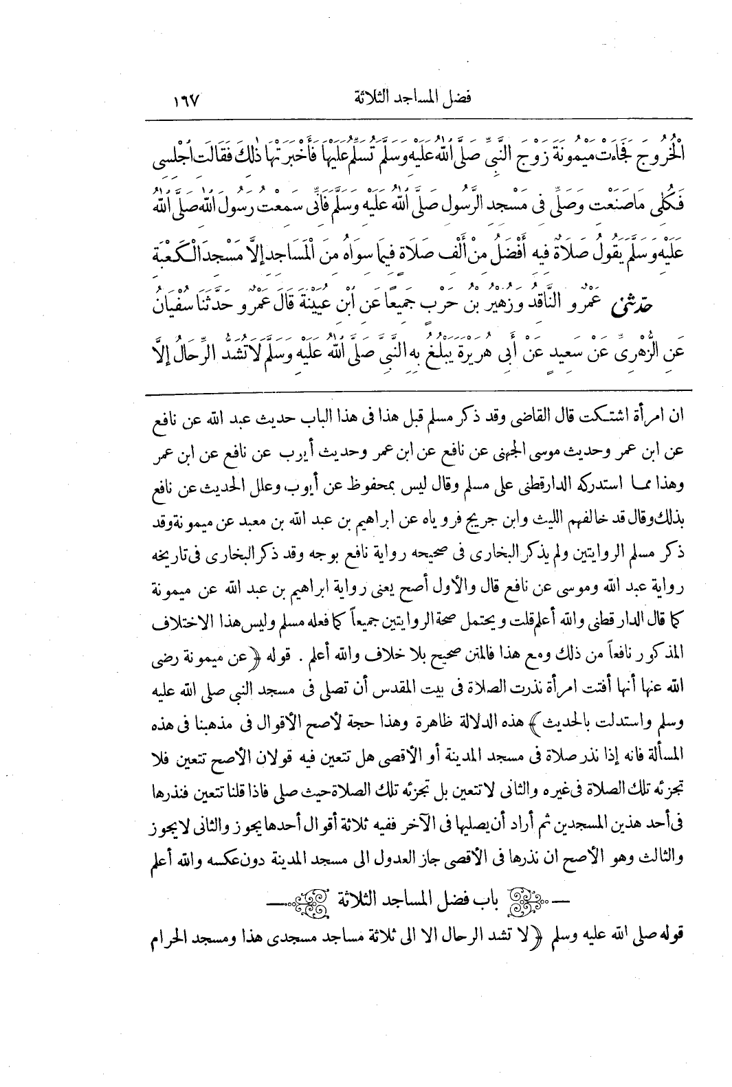 إِنَّ امْرَأَةً اشْتَكَتْ قَالَ الْقَاضِي وَقَدْ ذَكَرَ مُسْلِمٌ قَبْلَ هَذَا فِي هَذَا الْبَابِ حَدِيثَ عبد الله عن نافع عن بن عُمَرَ وَحَدِيثَ مُوسَى الْجُهَنِيِّ عَنْ نَافِعٍ عَنِ بن عمر وحديث أيوب عن نافع عن بن عُمَرَ وَهَذَا مِمَّا اسْتَدْرَكَهُ الدَّارَقُطْنِيُّ عَلَى مُسْلِمٍ وَقَالَ لَيْسَ بِمَحْفُوظٍ عَنْ أَيُّوبَ وَعَلَّلَ الْحَدِيثَ عَنْ نَافِعٍ بِذَلِكَ وَقَالَ قَدْ خَالَفَهُمُ اللَّيْثُ وبن جُرَيْجٍ فَرَوَيَاهُ عَنْ إِبْرَاهِيمَ بْنِ عَبْدِ اللَّهِ بْنِ مَعْبَدٍ عَنْ مَيْمُونَةَ وَقَدْ ذَكَرَ مُسْلِمٌ الرِّوَايَتَيْنِ وَلَمْ يَذْكُرِ الْبُخَارِيُّ فِي صَحِيحِهِ رِوَايَةَ نَافِعٍ بِوَجْهٍ وَقَدْ ذَكَرَ الْبُخَارِيُّ فِي تَارِيخِهِ رِوَايَةَ عَبْدِ اللَّهِ وَمُوسَى عَنْ نَافِعٍ قَالَ وَالْأَوَّلُ أَصَحُّ يَعْنِي رِوَايَةَ إِبْرَاهِيمَ بْنِ عَبْدِ الله عن ميمونة كما قال الدار قطنى وَاللَّهُ أَعْلَمُ قُلْتُ وَيَحْتَمِلُ صِحَّةَ الرِّوَايَتَيْنِ جَمِيعًا كَمَا فَعَلَهُ مُسْلِمٌ وَلَيْسَ هَذَا الِاخْتِلَافُ الْمَذْكُورُ نافعا مِنْ ذَلِكَ وَمَعَ هَذَا فَالْمَتْنُ صَحِيحٌ بِلَا خِلَافٍ وَاللَّهُ أَعْلَمُ قَوْلُهُ (عَنْ مَيْمُونَةَ رَضِيَ اللَّهُ عَنْهَا أَنَّهَا أَفْتَتِ امْرَأَةً نَذَرَتِ الصَّلَاةَ فِي بَيْتِ الْمَقْدِسِ أَنْ تُصَلِّيَ فِي مَسْجِدِ النَّبِيِّ صَلَّى اللَّهُ عَلَيْهِ وَسَلَّمَ وَاسْتَدَلَّتْ بِالْحَدِيثِ) هَذِهِ الدَّلَالَةُ ظَاهِرَةٌ وَهَذَا حُجَّةٌ لِأَصَحِّ الْأَقْوَالِ فِي مَذْهَبِنَا فِي هَذِهِ الْمَسْأَلَةِ فَإِنَّهُ إِذَا نَذَرَ صَلَاةً فِي مَسْجِدِ الْمَدِينَةِ أَوِ الْأَقْصَى هَلْ تَتَعَيَّنُ فِيهِ قَوْلَانِ الْأَصَحُّ تَتَعَيَّنُ فَلَا تُجْزِئُهُ تِلْكَ الصَّلَاةُ فِي غَيْرِهِ وَالثَّانِي لَا تَتَعَيَّنُ بَلْ تُجْزِئُهُ تِلْكَ الصَّلَاةُ حَيْثُ صَلَّى فإذا قُلْنَا تَتَعَيَّنُ فَنَذْرُهَا فِي أَحَدِ هَذَيْنِ الْمَسْجِدَيْنِ ثُمَّ أَرَادَ أَنْ يُصَلِّيَهَا فِي الْآخَرِ فَفِيهِ ثَلَاثَةُ أَقْوَالٍ أَحَدُهَا يَجُوزُ وَالثَّانِي لَا يَجُوزُ وَالثَّالِثُ وَهُوَ الْأَصَحُّ إِنْ نَذَرَهَا فِي الْأَقْصَى جَازَ الْعُدُولُ إِلَى مَسْجِدِ الْمَدِينَةِ دُونَ عَكْسِهِ والله أعلم