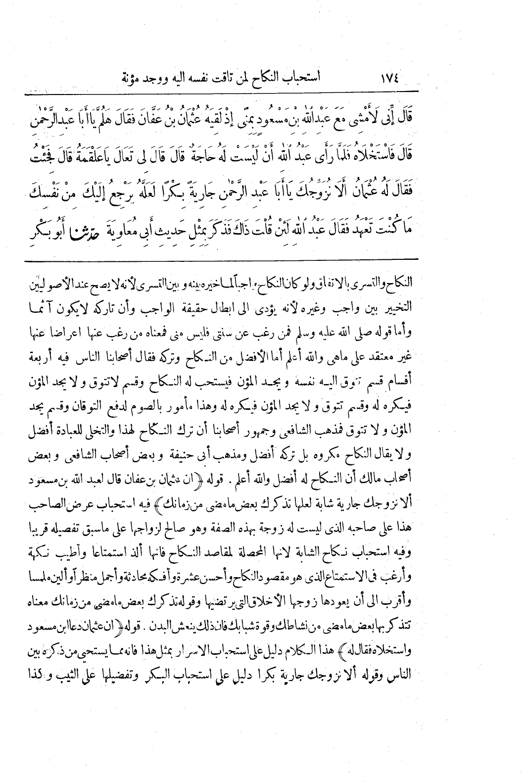 النِّكَاحِ وَالتَّسَرِّي بِالِاتِّفَاقِ وَلَوْ كَانَ النِّكَاحُ وَاجِبًا لَمَا خَيَّرَهُ بَيْنَهُ وَبَيْنَ التَّسَرِّي لِأَنَّهُ لَا يصح عند الأصوليين التخيير بين واجب وغيره لِأَنَّهُ يُؤَدِّي إِلَى إِبْطَالِ حَقِيقَةِ الْوَاجِبِ وَأَنَّ تَارِكَهُ لَا يَكُونُ آثِمًا وَأَمَّا قَوْلُهُ صَلَّى اللَّهُ عَلَيْهِ وَسَلَّمَ فَمَنْ رَغِبَ عَنْ سُنَّتِي فَلَيْسَ مِنِّي فَمَعْنَاهُ مَنْ رَغِبَ عَنْهَا إِعْرَاضًا عنها غير معتقد على ما هي والله أعلم أما الْأَفْضَلُ مِنَ النِّكَاحِ وَتَرْكِهِ فَقَالَ أَصْحَابُنَا النَّاسُ فِيهِ أَرْبَعَةُ أَقْسَامٍ قِسْمٌ تَتُوقُ إِلَيْهِ نَفْسُهُ وَيَجِدُ الْمُؤَنَ فَيُسْتَحَبُّ لَهُ النِّكَاحُ وَقِسْمٌ لَا تَتُوقُ وَلَا يَجِدُ الْمُؤَنَ فَيُكْرَهُ لَهُ وَقِسْمٌ تَتُوقُ وَلَا يَجِدُ الْمُؤَنَ فَيُكْرَهُ لَهُ وَهَذَا مَأْمُورٌ بِالصَّوْمِ لِدَفْعِ التَّوَقَانِ وَقِسْمٌ يَجِدُ الْمُؤَنَ وَلَا تَتُوقُ فَمَذْهَبُ الشَّافِعِيِّ وَجُمْهُورِ أَصْحَابِنَا أَنَّ تَرْكَ النِّكَاحِ لِهَذَا وَالتَّخَلِّي لِلْعِبَادَةِ أَفْضَلُ وَلَا يُقَالُ النِّكَاحُ مَكْرُوهٌ بَلْ تَرْكُهُ أَفْضَلُ وَمَذْهَبُ أَبِي حَنِيفَةَ وَبَعْضِ أَصْحَابِ الشَّافِعِيِّ وَبَعْضِ أَصْحَابِ مَالِكٍ أَنَّ النِّكَاحَ لَهُ أَفْضَلُ وَاللَّهُ أَعْلَمُ قَوْلُهُ (إِنَّ عُثْمَانَ بْنَ عَفَّانَ قَالَ لِعَبْدِ اللَّهِ بْنِ مَسْعُودٍ أَلَا نُزَوِّجُكَ جَارِيَةً شَابَّةً لَعَلَّهَا تُذَكِّرُكَ بَعْضَ مَا مَضَى مِنْ زَمَانِكَ) فِيهِ اسْتِحْبَابُ عَرْضِ الصَّاحِبِ هَذَا عَلَى صَاحِبِهِ الَّذِي لَيْسَتْ لَهُ زَوْجَةٌ بِهَذِهِ الصِّفَةِ وَهُوَ صَالِحٌ لِزَوَاجِهَا عَلَى مَا سَبَقَ تَفْصِيلُهُ قَرِيبًا وَفِيهِ اسْتِحْبَابُ نِكَاحِ الشَّابَّةِ لِأَنَّهَا الْمُحَصِّلَةُ لِمَقَاصِدِ النِّكَاحِ فَإِنَّهَا أَلَذُّ اسْتِمْتَاعًا وَأَطْيَبُ نَكْهَةً وَأَرْغَبُ فِي الِاسْتِمْتَاعِ الَّذِي هُوَ مَقْصُودُ النِّكَاحِ وَأَحْسَنُ عِشْرَةً وَأَفْكَهُ مُحَادَثَةً وَأَجْمَلُ مَنْظَرًا وَأَلْيَنُ مَلْمَسًا وَأَقْرَبُ إِلَى أَنْ يُعَوِّدَهَا زَوْجُهَا الْأَخْلَاقَ الَّتِي يَرْتَضِيهَا وَقَوْلُهُ تُذَكِّرُكَ بَعْضَ مَا مَضَى مِنْ زَمَانِكَ مَعْنَاهُ تَتَذَكَّرُ بِهَا بَعْضَ مَا مَضَى مِنْ نَشَاطِكَ وَقُوَّةِ شَبَابِكَ فَإِنَّ ذَلِكَ يُنْعِشُ البدن قوله (ان عثمان دعا بن مَسْعُودٍ وَاسْتَخْلَاهُ فَقَالَ لَهُ) هَذَا الْكَلَامُ دَلِيلٌ عَلَى اسْتِحْبَابِ الْإِسْرَارِ بِمِثْلِ هَذَا فَإِنَّهُ مِمَّا يُسْتَحَى مِنْ ذِكْرِهِ بَيْنَ النَّاسِ وَقَوْلُهُ أَلَا نُزَوِّجُكَ جَارِيَةً بِكْرًا دَلِيلٌ عَلَى اسْتِحْبَابِ الْبِكْرِ وَتَفْضِيلِهَا عَلَى الثَّيِّبِ وَكَذَا