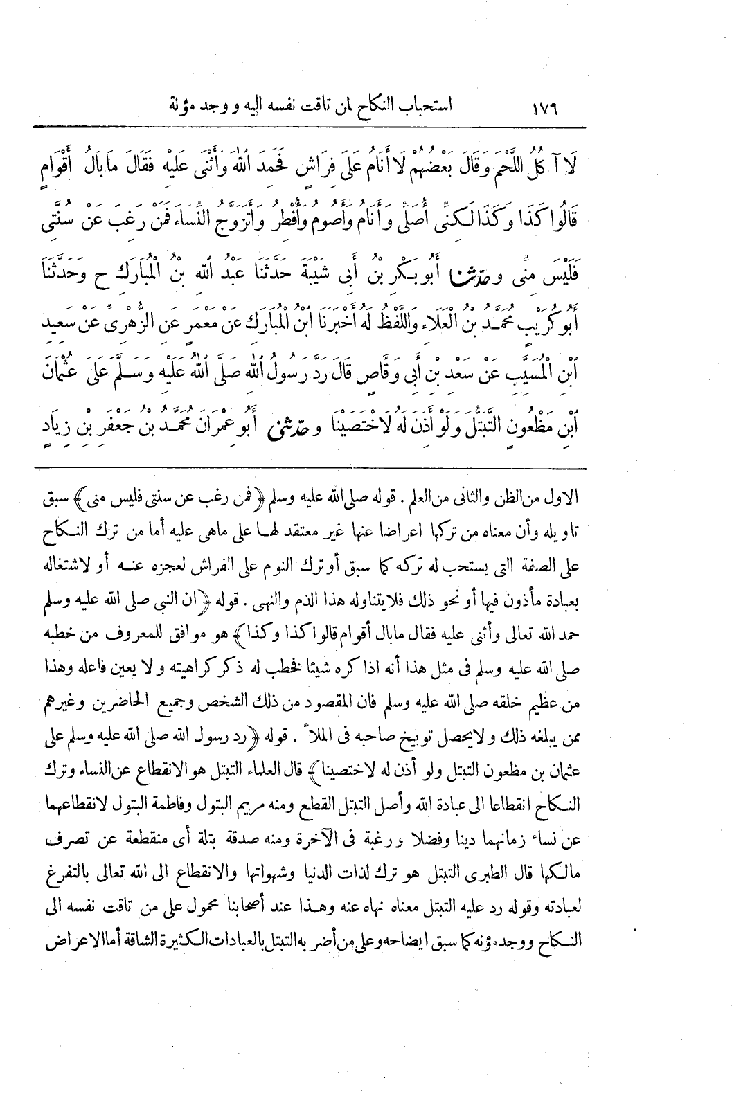 [1402] قَوْلُهُ (رَدَّ رَسُولُ اللَّهِ صَلَّى اللَّهُ عَلَيْهِ وَسَلَّمَ عَلَى عُثْمَانَ بْنِ مَظْعُونٍ التَّبَتُّلَ وَلَوْ أَذِنَ لَهُ لَاخْتَصَيْنَا) قَالَ الْعُلَمَاءُ التَّبَتُّلُ هُوَ الِانْقِطَاعُ عَنِ النِّسَاءِ وَتَرْكُ النِّكَاحِ انْقِطَاعًا إِلَى عِبَادَةِ اللَّهِ وَأَصْلُ التَّبَتُّلِ الْقَطْعُ وَمِنْهُ مَرْيَمُ الْبَتُولُ وَفَاطِمَةُ الْبَتُولُ لِانْقِطَاعِهِمَا عَنْ نِسَاءِ زَمَانِهِمَا دِينًا وَفَضْلًا وَرَغْبَةً فِي الْآخِرَةِ وَمِنْهُ صَدَقَةٌ بَتْلَةٌ أَيْ مُنْقَطِعَةٌ عَنْ تَصَرُّفِ مَالِكِهَا قَالَ الطَّبَرِيُّ التَّبَتُّلُ هُوَ تَرْكُ لَذَّاتِ الدُّنْيَا وَشَهَوَاتِهَا وَالِانْقِطَاعُ إِلَى اللَّهِ تَعَالَى بِالتَّفَرُّغِ لِعِبَادَتِهِ وَقَوْلُهُ رَدَّ عَلَيْهِ التَّبَتُّلَ مَعْنَاهُ نَهَاهُ عَنْهُ وَهَذَا عِنْدَ أَصْحَابِنَا مَحْمُولٌ عَلَى مَنْ تَاقَتْ نَفْسُهُ إِلَى النِّكَاحِ وَوَجَدَ مُؤَنَهُ كَمَا سَبَقَ ايضاحه وعلى من أضربه التَّبَتُّلُ بِالْعِبَادَاتِ الْكَثِيرَةِ الشَّاقَّةِ أَمَّا الْإِعْرَاضُ