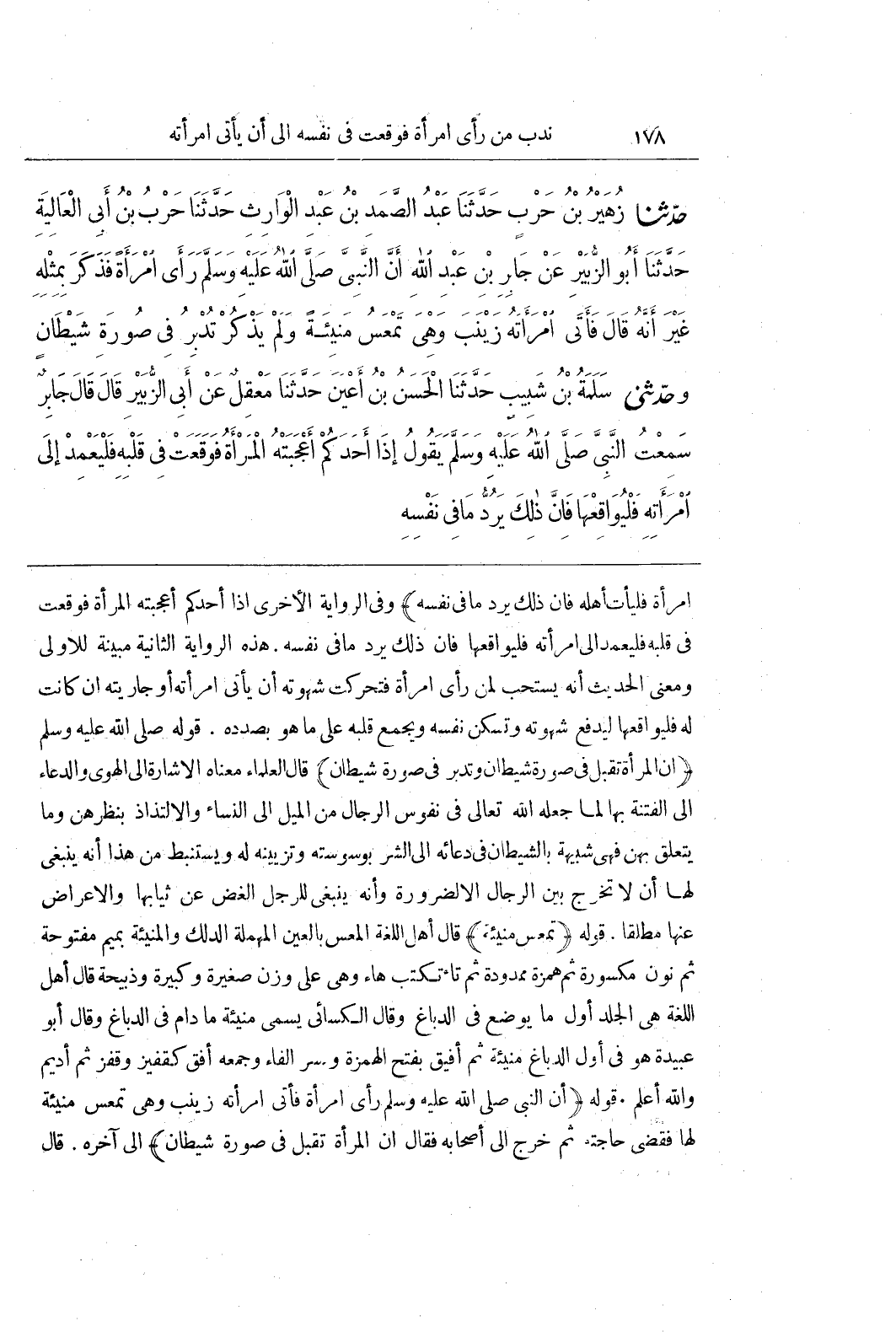 امْرَأَةً فَلْيَأْتِ أَهْلَهُ فَإِنَّ ذَلِكَ يَرُدُّ مَا فِي نَفْسِهِ) وَفِي الرِّوَايَةِ الْأُخْرَى إِذَا أَحَدُكُمْ أَعْجَبَتْهُ الْمَرْأَةُ فَوَقَعَتْ فِي قَلْبِهِ فَلْيَعْمِدْ إِلَى امْرَأَتِهِ فَلْيُوَاقِعْهَا فَإِنَّ ذَلِكَ يَرُدُّ مَا فِي نَفْسِهِ هَذِهِ الرِّوَايَةُ الثَّانِيَةُ مُبَيِّنَةٌ لِلْأُولَى وَمَعْنَى الْحَدِيثِ أَنَّهُ يُسْتَحَبُّ لِمَنْ رَأَى امْرَأَةً فَتَحَرَّكَتْ شَهْوَتُهُ أَنْ يَأْتِيَ امْرَأَتَهُ أَوْ جَارِيَتَهُ إِنْ كَانَتْ لَهُ فَلْيُوَاقِعْهَا لِيَدْفَعَ شَهْوَتَهُ وَتَسْكُنَ نَفْسُهُ وَيَجْمَعَ قَلْبَهُ عَلَى مَا هُوَ بِصَدَدِهِ قَوْلُهُ صَلَّى اللَّهُ عَلَيْهِ وَسَلَّمَ (إِنَّ الْمَرْأَةَ تُقْبِلُ فِي صُورَةِ شَيْطَانٍ وَتُدْبِرُ فِي صُورَةِ شَيْطَانٍ) قَالَ الْعُلَمَاءُ مَعْنَاهُ الْإِشَارَةُ إِلَى الْهَوَى وَالدُّعَاءِ إِلَى الْفِتْنَةِ بِهَا لِمَا جَعَلَهُ اللَّهُ تَعَالَى فِي نُفُوسِ الرِّجَالِ مِنَ الْمَيْلِ إِلَى النِّسَاءِ وَالِالْتِذَاذِ بِنَظَرِهِنَّ وَمَا يَتَعَلَّقُ بِهِنَّ فَهِيَ شَبِيهَةٌ بِالشَّيْطَانِ فِي دُعَائِهِ إِلَى الشَّرِّ بِوَسْوَسَتِهِ وَتَزْيِينِهِ لَهُ وَيُسْتَنْبَطُ مِنْ هَذَا أَنَّهُ يَنْبَغِي لَهَا أَنْ لَا تَخْرُجَ بَيْنَ الرِّجَالِ إِلَّا لِضَرُورَةٍ وَأَنَّهُ يَنْبَغِي لِلرَّجُلِ الْغَضُّ عَنْ ثِيَابِهَا وَالْإِعْرَاضُ عَنْهَا مُطْلَقًا قَوْلُهُ (تَمْعَسُ مَنِيئَةً) قَالَ أَهْلُ اللغة المعس بالعين المهملة الدلك والمنيئة بِمِيمٍ مَفْتُوحَةٍ ثُمَّ نُونٍ مَكْسُورَةٍ ثُمَّ هَمْزَةٍ مَمْدُودَةٍ ثُمَّ تَاءٍ تُكْتَبُ هَاءً وَهِيَ عَلَى وَزْنِ صَغِيرَةٍ وَكَبِيرَةٍ وَذَبِيحَةٍ قَالَ أَهْلُ اللُّغَةِ هي الجلد أول ما يوضع في الدباغ وقال الكسائي يسمي منيئة ثم أفيق بفتح الهمزة وسر الفاء وجمعه أفق كفقيز وقفز ثم أديم عُبَيْدَةَ هُوَ فِي أَوَّلِ الدِّبَاغِ مَنِيئَةٌ ثُمَّ أَفِيقٌ بِفَتْحِ الْهَمْزَةِ وَكَسْرِ الْفَاءِ وَجَمْعُهُ أُفُقٌ كَقَفِيزِ وَقُفُزٌ ثُمَّ أَدِيمٌ وَاللَّهُ أَعْلَمُ قَوْلُهُ (إِنَّ النَّبِيَّ صَلَّى اللَّهُ عليه وسلم رأى امْرَأَةً فَأَتَى امْرَأَتَهُ زَيْنَبَ وَهِيَ تَمْعَسُ مَنِيئَةً لَهَا فَقَضَى حَاجَتَهُ ثُمَّ خَرَجَ إِلَى أَصْحَابِهِ فَقَالَ إِنَّ الْمَرْأَةَ تُقْبِلُ فِي صُورَةِ شَيْطَانٍ) إِلَى آخِرِهِ قَالَ