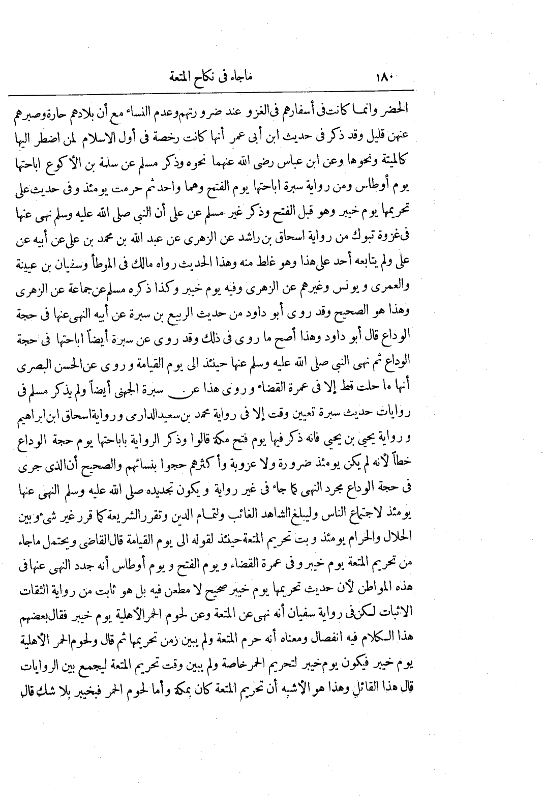 الْحَضَرِ وَإِنَّمَا كَانَتْ فِي أَسْفَارِهِمْ فِي الْغَزْوِ عِنْدَ ضَرُورَتِهِمْ وَعَدَمِ النِّسَاءِ مَعَ أَنَّ بِلَادَهُمْ حَارَّةٌ وَصَبْرَهُمْ عَنْهُنَّ قَلِيلٌ وَقَدْ ذَكَرَ فِي حديث بن أَبِي عُمَرَ أَنَّهَا كَانَتْ رُخْصَةً فِي أَوَّلِ الْإِسْلَامِ لِمَنِ اضْطُرَّ إِلَيْهَا كَالْمَيْتَةِ وَنَحْوِهَا وَعَنِ بن عَبَّاسٍ رَضِيَ اللَّهُ عَنْهُمَا نَحْوُهُ وَذَكَرَ مُسْلِمٌ عَنْ سَلَمَةَ بْنِ الْأَكْوَعِ إِبَاحَتَهَا يَوْمَ أَوْطَاسَ وَمِنْ رِوَايَةِ سَبْرَةَ إِبَاحَتُهَا يَوْمَ الْفَتْحِ وَهُمَا وَاحِدٌ ثَمَّ حُرِّمَتْ يَوْمَئِذٍ وَفِي حَدِيثِ عَلِيٍّ تَحْرِيمُهَا يَوْمَ خَيْبَرَ وَهُوَ قَبْلَ الْفَتْحِ وَذَكَرَ غَيْرُ مُسْلِمٍ عَنْ عَلِيٍّ إِنَّ النَّبِيَّ صَلَّى اللَّهُ عَلَيْهِ وَسَلَّمَ نَهَى عَنْهَا فِي غَزْوَةِ تَبُوكَ مِنْ رِوَايَةِ إِسْحَاقَ بْنِ رَاشِدٍ عَنِ الزُّهْرِيِّ عَنْ عَبْدِ اللَّهِ بْنِ مُحَمَّدِ بْنِ عَلِيٍّ عَنْ أَبِيهِ عَنْ عَلِيٍّ وَلَمْ يُتَابِعْهُ أَحَدٌ عَلَى هَذَا وَهُوَ غَلَطٌ مِنْهُ وَهَذَا الْحَدِيثُ رَوَاهُ مَالِكٌ فِي الْمُوَطَّأِ وَسُفْيَانُ بْنُ عُيَيْنَةَ وَالْعُمَرِيُّ وَيُونُسُ وَغَيْرُهُمْ عَنِ الزُّهْرِيِّ وَفِيهِ يَوْمَ خَيْبَرَ وَكَذَا ذَكَرَهُ مُسْلِمٌ عَنْ جَمَاعَةٍ عَنِ الزُّهْرِيِّ وَهَذَا هُوَ الصَّحِيحُ وَقَدْ رَوَى أَبُو دَاوُدَ مِنْ حَدِيثِ الرَّبِيعِ بْنِ سَبْرَةَ عَنْ أَبِيهِ النَّهْيَ عَنْهَا فِي حَجَّةِ الْوَدَاعِ قَالَ أَبُو دَاوُدَ وَهَذَا أَصَحُّ مَا رُوِيَ فِي ذَلِكَ وَقَدْ رُوِيَ عَنْ سَبْرَةَ أَيْضًا إِبَاحَتُهَا فِي حَجَّةِ الْوَدَاعِ ثُمَّ نَهَى النَّبِيُّ صَلَّى اللَّهُ عَلَيْهِ وَسَلَّمَ عَنْهَا حِينَئِذٍ إِلَى يَوْمِ الْقِيَامَةِ وَرُوِيَ عَنِ الْحَسَنِ الْبَصْرِيِّ أَنَّهَا مَا حَلَّتْ قَطُّ إِلَّا فِي عُمْرَةِ الْقَضَاءِ وَرُوِيَ هَذَا عَنْ سَبْرَةَ الْجُهَنِيِّ أَيْضًا وَلَمْ يَذْكُرْ مُسْلِمٌ فِي رِوَايَاتِ حَدِيثِ سَبْرَةَ تَعْيِينَ وَقْتٍ إِلَّا فِي رِوَايَةِ مُحَمَّدِ بْنِ سَعِيدٍ الدَّارِمِيِّ وَرِوَايَةِ إِسْحَاقَ بْنِ إِبْرَاهِيمَ وَرِوَايَةِ يَحْيَى بْنِ يَحْيَى فَإِنَّهُ ذَكَرَ فِيهَا يَوْمَ فَتْحِ مَكَّةَ قَالُوا وَذِكْرُ الرِّوَايَةِ بِإِبَاحَتِهَا يَوْمَ حَجَّةِ الوداع خطأ لأنه لم يكن يؤمئذ ضَرُورَةٌ وَلَا عُزُوبَةٌ وَأَكْثَرُهُمْ حَجُّوا بِنِسَائِهِمْ وَالصَّحِيحُ أَنَّ الَّذِي جَرَى فِي حَجَّةِ الْوَدَاعِ مُجَرَّدُ النَّهْيِ كَمَا جَاءَ فِي غَيْرِ رِوَايَةٍ وَيَكُونُ تَجْدِيدُهُ صَلَّى اللَّهُ عَلَيْهِ وَسَلَّمَ النَّهْيَ عَنْهَا يَوْمَئِذٍ لِاجْتِمَاعِ النَّاسِ وَلْيُبَلِّغِ الشَّاهِدُ الْغَائِبَ وَلِتَمَامِ الدِّينِ وَتَقَرُّرِ الشَّرِيعَةِ كَمَا قَرَّرَ غَيْرَ شَيْءٍ وَبَيَّنَ الْحَلَالَ وَالْحَرَامَ يَوْمَئِذٍ وَبَتَّ تَحْرِيمَ الْمُتْعَةِ حِينَئِذٍ لِقَوْلِهِ إِلَى يَوْمِ الْقِيَامَةِ قَالَ الْقَاضِي وَيَحْتَمِلُ مَا جَاءَ مِنْ تَحْرِيمِ الْمُتْعَةِ يَوْمَ خَيْبَرَ وَفِي عُمْرَةِ الْقَضَاءِ وَيَوْمَ الْفَتْحِ وَيَوْمَ أَوْطَاسَ أَنَّهُ جَدَّدَ النَّهْيَ عَنْهَا فِي هَذِهِ الْمَوَاطِنِ لِأَنَّ حَدِيثَ تَحْرِيمِهَا يَوْمَ خَيْبَرَ صَحِيحٌ لَا مَطْعَنَ فِيهِ بَلْ هُوَ ثَابِتٌ مِنْ رِوَايَةِ الثِّقَاتِ الْأَثْبَاتِ لَكِنْ فِي رِوَايَةِ سُفْيَانَ أَنَّهُ نَهَى عَنِ الْمُتْعَةِ وَعَنْ لُحُومِ الْحُمُرِ الْأَهْلِيَّةِ يَوْمَ خَيْبَرَ فَقَالَ بَعْضُهُمْ هَذَا الْكَلَامُ فِيهِ انْفِصَالٌ وَمَعْنَاهُ أَنَّهُ حَرَّمَ الْمُتْعَةَ وَلَمْ يُبَيِّنْ زَمَنَ تَحْرِيمَهَا ثُمَّ قَالَ وَلُحُومَ الْحُمُرِ الْأَهْلِيَّةِ يَوْمَ خَيْبَرَ فَيَكُونُ يَوْمُ خَيْبَرَ لِتَ