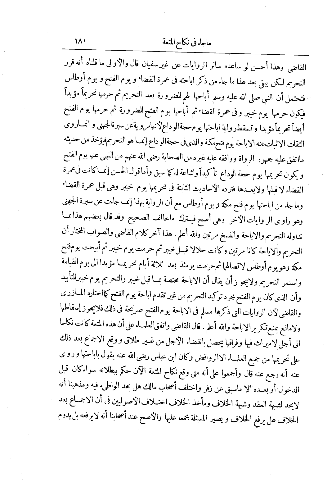 الْقَاضِي وَهَذَا أَحْسَنُ لَوْ سَاعَدَهُ سَائِرُ الرِّوَايَاتِ عَنْ غَيْرِ سُفْيَانَ قَالَ وَالْأَوْلَى مَا قُلْنَاهُ أَنَّهُ قَرَّرَ التَّحْرِيمَ لَكِنْ يَبْقَى بَعْدَ هَذَا مَا جَاءَ مِنْ ذِكْرِ إِبَاحَتِهِ فِي عُمْرَةِ الْقَضَاءِ وَيَوْمِ الْفَتْحِ وَيَوْمِ أَوْطَاسَ فَتَحْتَمِلُ أَنَّ النَّبِيَّ صَلَّى اللَّهُ عَلَيْهِ وَسَلَّمَ أَبَاحَهَا لَهُمْ لِلضَّرُورَةِ بَعْدَ التَّحْرِيمِ ثُمَّ حَرَّمَهَا تَحْرِيمًا مُؤَبَّدًا فَيَكُونُ حَرَّمَهَا يَوْمَ خَيْبَرَ وَفِي عُمْرَةِ الْقَضَاءِ ثُمَّ أَبَاحَهَا يَوْمَ الْفَتْحِ لِلضَّرُورَةِ ثُمَّ حَرَّمَهَا يَوْمَ الْفَتْحِ أَيْضًا تَحْرِيمًا مُؤَبَّدًا وَتَسْقُطُ رِوَايَةُ إِبَاحَتِهَا يَوْمَ حَجَّةِ الْوَدَاعِ لِأَنَّهَا مَرْوِيَّةٌ عَنْ سَبْرَةَ الْجُهَنِيِّ وَإِنَّمَا رَوَى الثِّقَاتُ الْأَثْبَاتُ عَنْهُ الْإِبَاحَةَ يَوْمَ فَتْحِ مَكَّةَ وَالَّذِي فِي حَجَّةِ الْوَدَاعِ إِنَّمَا هُوَ التَّحْرِيمُ فَيُؤْخَذُ مِنْ حَدِيثِهِ مَا اتَّفَقَ عَلَيْهِ جُمْهُورُ الرُّوَاةِ وَوَافَقَهُ عَلَيْهِ غَيْرُهُ مِنَ الصَّحَابَةِ رَضِيَ اللَّهُ عَنْهُمْ مِنَ النَّهْيِ عَنْهَا يَوْمَ الْفَتْحِ وَيَكُونُ تَحْرِيمُهَا يَوْمَ حَجَّةِ الْوَدَاعِ تَأْكِيدًا وَإِشَاعَةً لَهُ كَمَا سَبَقَ وَأَمَّا قَوْلُ الْحَسَنِ إِنَّمَا كَانَتْ فِي عُمْرَةِ الْقَضَاءِ لَا قَبْلَهَا وَلَا بَعْدَهَا فَتَرُدُّهُ الْأَحَادِيثُ الثَّابِتَةُ فِي تَحْرِيمِهَا يَوْمَ خَيْبَرَ وَهِيَ قَبْلَ عُمْرَةِ الْقَضَاءِ وَمَا جَاءَ مِنْ إِبَاحَتِهَا يَوْمَ فَتْحِ مَكَّةَ وَيَوْمَ أَوْطَاسَ مَعَ أَنَّ الرِّوَايَةَ بِهَذَا إِنَّمَا جَاءَتْ عَنْ سَبْرَةَ الْجُهَنِيِّ وَهُوَ رَاوِي الرِّوَايَاتِ الْأُخَرِ وَهِيَ أَصَحُّ فَيُتْرَكُ مَا خَالَفَ الصَّحِيحَ وَقَدْ قَالَ بَعْضُهُمْ هَذَا مِمَّا تَدَاوَلَهُ التَّحْرِيمُ وَالْإِبَاحَةُ وَالنَّسْخُ مَرَّتَيْنِ وَاللَّهُ أَعْلَمُ هَذَا آخِرُ كَلَامِ الْقَاضِي وَالصَّوَابُ الْمُخْتَارُ أَنَّ التَّحْرِيمَ وَالْإِبَاحَةَ كَانَا مَرَّتَيْنِ وَكَانَتْ حَلَالًا قَبْلَ خَيْبَرَ ثُمَّ حُرِّمَتْ يَوْمَ خَيْبَرَ ثُمَّ أُبِيحَتْ يوم فتح مكة وهو يوم أوطاس لا تصالهما ثُمَّ حُرِّمَتْ يَوْمَئِذٍ بَعْدَ ثَلَاثَةِ أَيَّامٍ تَحْرِيمًا مُؤَبَّدًا إِلَى يَوْمِ الْقِيَامَةِ وَاسْتَمَرَّ التَّحْرِيمُ وَلَا يَجُوزُ أَنْ يُقَالَ إِنَّ الْإِبَاحَةَ مُخْتَصَّةُ بِمَا قَبْلَ خَيْبَرَ وَالتَّحْرِيمُ يَوْمَ خَيْبَرَ لِلتَّأْبِيدِ وَأَنَّ الَّذِي كَانَ يَوْمَ الْفَتْحِ مُجَرَّدَ تَوْكِيدِ التَّحْرِيمِ مِنْ غَيْرِ تَقَدُّمِ إِبَاحَةٍ يَوْمَ الْفَتْحِ كَمَا اختاره المازرى والقاضي لِأَنَّ الرِّوَايَاتِ الَّتِي ذَكَرَهَا مُسْلِمٌ فِي الْإِبَاحَةِ يَوْمَ الْفَتْحِ صَرِيحَةٌ فِي ذَلِكَ فَلَا يَجُوزُ إِسْقَاطُهَا وَلَا مَانِعَ يَمْنَعُ تَكْرِيرَ الْإِبَاحَةِ وَاللَّهُ أَعْلَمُ قَالَ الْقَاضِي وَاتَّفَقَ الْعُلَمَاءُ عَلَى أَنَّ هَذِهِ الْمُتْعَةَ كَانَتْ نِكَاحًا إِلَى أَجَلٍ لَا مِيرَاثَ فِيهَا وَفِرَاقُهَا يَحْصُلُ بِانْقِضَاءِ الْأَجَلِ مِنْ غَيْرِ طَلَاقٍ وَوَقَعَ الْإِجْمَاعُ بَعْدَ ذَلِكَ عَلَى تَحْرِيمِهَا مِنْ جَمِيعِ الْعُلَمَاءِ إِلَّا الرَّوَافِضَ وَكَانَ بن عَبَّاسٍ رَضِيَ اللَّهُ عَنْهُ يَقُولُ بِإِبَاحَتِهَا وَرُوِيَ عَنْهُ أَنَّهُ رَجَعَ عَنْهُ قَالَ وَأَجْمَعُوا عَلَى أَنَّهُ مَتَى وَقَعَ نِكَاحُ الْمُتْعَةِ الْآنَ حُكِمَ بِبُطْلَانِهِ سَوَاءٌ كَانَ قَبْلَ الدُّخُولِ أَوْ بَعْدَهُ إِلَّا مَا سَبَقَ عَنْ زُفَرَ وَاخْتَلَفَ أَصْحَابُ مَالِكٍ هَلْ يُحَدُّ الْوَاطِئُ فِيهِ وَمَذْهَبُنَا أَنَّهُ لَا يُحَدُّ لِشُبْهَةِ الْعَقْ