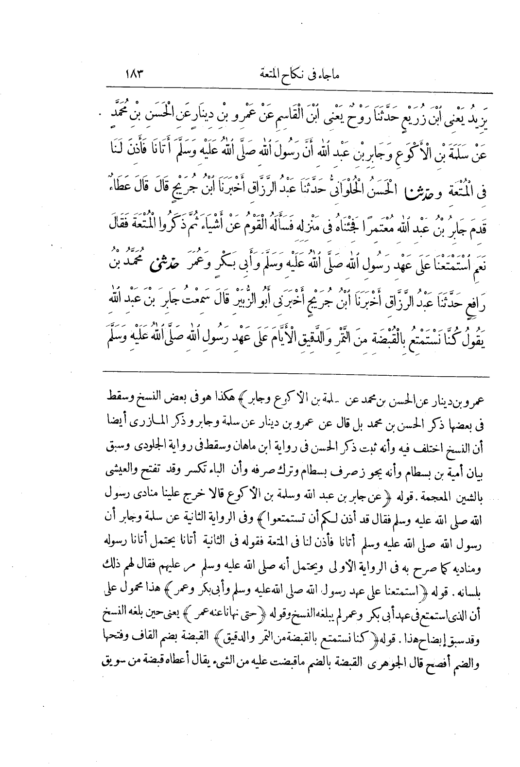 [1405] قَوْلُهُ (عَنْ جَابِرِ بْنِ عَبْدِ اللَّهِ وَسَلَمَةَ بْنِ الْأَكْوَعِ قَالَا خَرَجَ عَلَيْنَا مُنَادِي رَسُولِ اللَّهِ صَلَّى اللَّهُ عَلَيْهِ وَسَلَّمَ فَقَالَ قَدْ أَذِنَ لَكُمْ أَنْ تَسْتَمْتِعُوا) وَفِي الرِّوَايَةِ الثَّانِيَةِ عَنْ سَلَمَةَ وَجَابِرٍ أَنَّ رَسُولَ اللَّهِ صَلَّى اللَّهُ عَلَيْهِ وَسَلَّمَ أَتَانَا فَأَذِنَ لَنَا فِي الْمُتْعَةِ فَقَوْلُهُ فِي الثَّانِيَةِ أَتَانَا يَحْتَمِلُ أَتَانَا رَسُولُهُ وَمُنَادِيهِ كَمَا صَرَّحَ بِهِ فِي الرِّوَايَةِ الْأُولَى وَيَحْتَمِلُ أَنَّهُ صَلَّى اللَّهُ عَلَيْهِ وَسَلَّمَ مَرَّ عَلَيْهِمْ فَقَالَ لَهُمْ ذَلِكَ بِلِسَانِهِ قَوْلُهُ (اسْتَمْتَعْنَا عَلَى عَهْدِ رَسُولِ اللَّهِ صَلَّى اللَّهُ عَلَيْهِ وَسَلَّمَ وَأَبِي بَكْرٍ وَعُمَرَ) هَذَا مَحْمُولٌ عَلَى أَنَّ الَّذِي اسْتَمْتَعَ فِي عَهْدِ أَبِي بكر وعمر لم يبلغه النسخ وقوله (حتى نَهَانَا عَنْهُ عُمَرُ) يَعْنِي حِينَ بَلَغَهُ النَّسْخُ وَقَدْ سَبَقَ إِيضَاحُ هَذَا قَوْلُهُ (كُنَّا نَسْتَمْتِعُ بِالْقُبْضَةِ مِنَ التَّمْرِ وَالدَّقِيقِ) الْقُبْضَةُ بِضَمِّ الْقَافِ وَفَتْحِهَا وَالضَّمُّ أَفْصَحُ قَالَ الْجَوْهَرِيُّ الْقُبْضَةُ بِالضَّمِّ مَا قَبَضْتَ عَلَيْهِ مِنَ الشَّيْءِ يُقَالُ أَعْطَاهُ قُبْضَةً مِنْ سَوِيقٍ