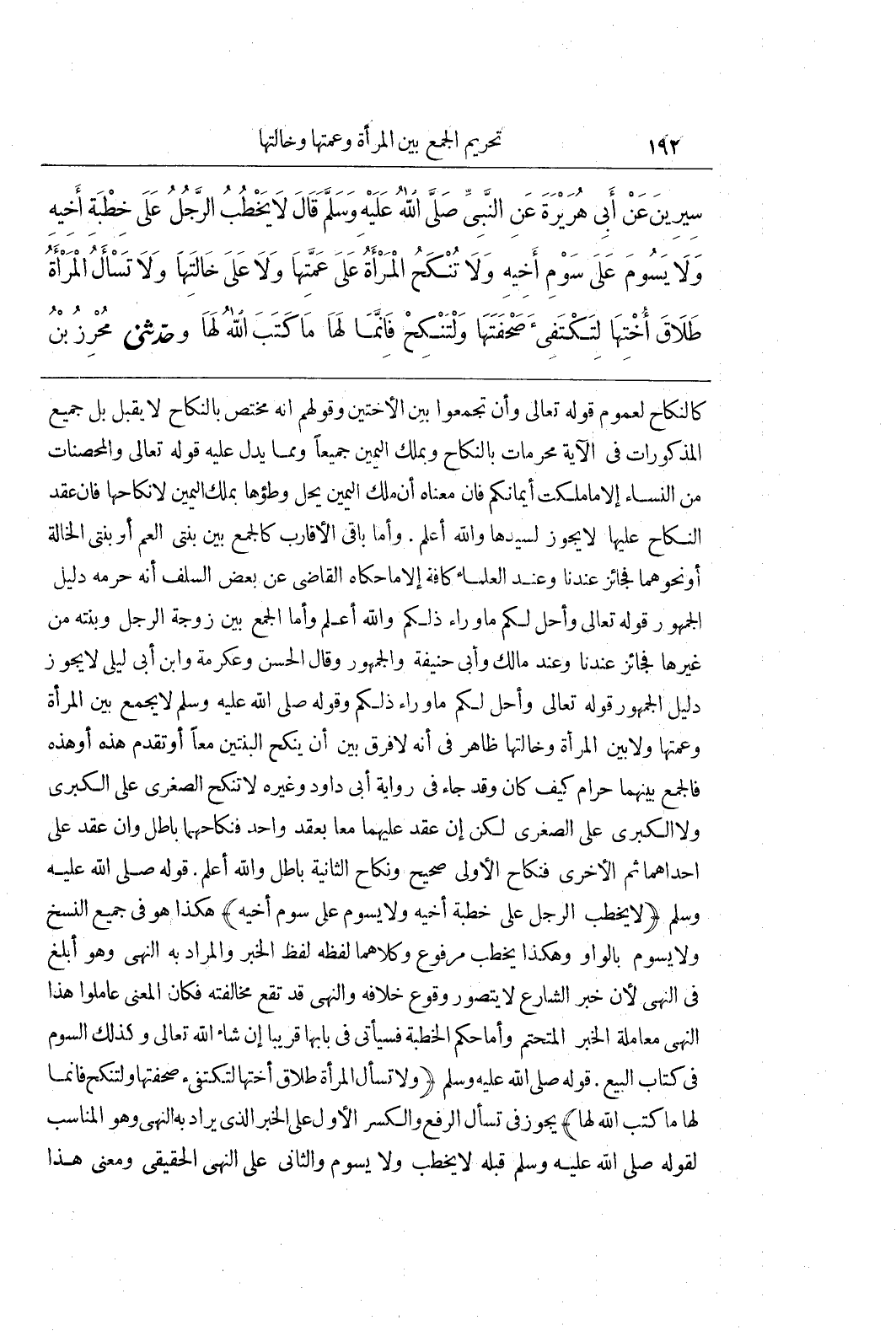 كَالنِّكَاحِ لِعُمُومِ قَوْلِهِ تَعَالَى وَأَنْ تَجْمَعُوا بَيْنَ الأختين وَقَوْلُهُمْ إِنَّهُ مُخْتَصٌّ بِالنِّكَاحِ لَا يُقْبَلُ بَلْ جَمِيعُ الْمَذْكُورَاتِ فِي الْآيَةِ مُحَرَّمَاتٌ بِالنِّكَاحِ وَبِمِلْكِ الْيَمِينِ جَمِيعًا وَمِمَّا يَدُلُّ عَلَيْهِ قَوْلُهُ تَعَالَى وَالْمُحْصَنَاتُ مِنَ النِّسَاءِ إِلَّا مَا مَلَكَتْ أَيْمَانُكُمْ فَإِنَّ مَعْنَاهُ أَنَّ مِلْكَ الْيَمِينِ يَحِلُّ وَطْؤُهَا بملك اليمين لإنكاحها فَإِنَّ عَقْدَ النِّكَاحِ عَلَيْهَا لَا يَجُوزُ لِسَيِّدِهَا وَاللَّهُ أَعْلَمُ وَأَمَّا بَاقِي الْأَقَارِبِ كَالْجَمْعِ بَيْنَ بِنْتَيِ الْعَمِّ أَوْ بِنْتَيِ الْخَالَةِ أَوْ نَحْوِهِمَا فَجَائِزٌ عِنْدَنَا وَعِنْدَ الْعُلَمَاءِ كَافَّةً إِلَّا مَا حَكَاهُ الْقَاضِي عَنْ بَعْضِ السَّلَفِ أَنَّهُ حَرَّمَهُ دَلِيلُ الْجُمْهُورِ قَوْلُهُ تَعَالَى وَأُحِلَّ لَكُمْ مَا وراء ذلكم وَاللَّهُ أَعْلَمُ وَأَمَّا الْجَمْعُ بَيْنَ زَوْجَةِ الرَّجُلِ وَبِنْتِهِ مِنْ غَيْرِهَا فَجَائِزٌ عِنْدَنَا وَعِنْدَ مَالِكٍ وأبي حنيفة والجمهور وقال الحسن وعكرمة وبن أَبِي لَيْلَى لَا يَجُوزُ دَلِيلُ الْجُمْهُورِ قَوْلُهُ تعالى وأحل لكم ما وراء ذلكم وَقَوْلُهُ صَلَّى اللَّهُ عَلَيْهِ وَسَلَّمَ لَا يُجْمَعُ بَيْنَ الْمَرْأَةِ وَعَمَّتِهَا وَلَا بَيْنَ الْمَرْأَةِ وَخَالَتِهَا ظَاهِرٌ فِي أَنَّهُ لَا فَرْقَ بَيْنَ أَنْ يَنْكِحَ الْبِنْتَيْنِ مَعًا أَوْ تُقَدَّمَ هَذِهِ أَوْ هَذِهِ فَالْجَمْعُ بَيْنَهُمَا حَرَامٌ كَيْفَ كَانَ وَقَدْ جَاءَ فِي رِوَايَةِ أَبِي دَاوُدَ وَغَيْرِهِ لَا تُنْكَحُ الصُّغْرَى عَلَى الْكُبْرَى وَلَا الْكُبْرَى عَلَى الصُّغْرَى لَكِنْ إِنْ عَقَدَ عَلَيْهِمَا مَعًا بِعَقْدٍ وَاحِدٍ فَنِكَاحُهُمَا بَاطِلٌ وَإِنْ عَقَدَ عَلَى إِحْدَاهُمَا ثُمَّ الْأُخْرَى فَنِكَاحُ الْأُولَى صَحِيحٌ وَنِكَاحُ الثَّانِيَةِ بَاطِلٌ وَاللَّهُ أَعْلَمُ قَوْلُهُ صَلَّى اللَّهُ عَلَيْهِ وَسَلَّمَ (لَا يَخْطُبُ الرَّجُلُ عَلَى خِطْبَةِ أَخِيهِ وَلَا يَسُومُ عَلَى سَوْمِ أَخِيهِ) هَكَذَا هُوَ فِي جَمِيعِ النُّسَخِ وَلَا يَسُومُ بِالْوَاوِ وَهَكَذَا يَخْطُبُ مَرْفُوعٌ وَكِلَاهُمَا لَفْظُهُ لَفْظُ الْخَبَرِ وَالْمُرَادُ به النهى وهو أبلغ في النهى لِأَنَّ خَبَرَ الشَّارِعِ لَا يُتَصَوَّرُ وُقُوعُ خِلَافِهِ وَالنَّهْيُ قَدْ تَقَعُ مُخَالَفَتُهُ فَكَانَ الْمَعْنَى عَامِلُوا هَذَا النَّهْيَ مُعَامَلَةَ الْخَبَرِ الْمُتَحَتِّمِ وَأَمَّا حُكْمُ الْخِطْبَةِ فَسَيَأْتِي فِي بَابِهَا قَرِيبًا إِنْ شَاءَ اللَّهُ تَعَالَى وَكَذَلِكَ السَّوْمُ فِي كِتَابِ الْبَيْعِ قَوْلُهُ صَلَّى اللَّهُ عَلَيْهِ وَسَلَّمَ (وَلَا تَسْأَلُ المرأة طلاق أختها لتكتفيء صَحْفَتَهَا وَلْتَنْكِحْ فَإِنَّمَا لَهَا مَا كَتَبَ اللَّهُ لَهَا) يَجُوزُ فِي تَسْأَلُ الرَّفْعُ وَالْكَسْرُ الْأَوَّلُ عَلَى الْخَبَرِ الَّذِي يُرَادُ بِهِ النَّهْيُ وَهُوَ الْمُنَاسِبُ لِقَوْلِهِ صَلَّى اللَّهُ عَلَيْهِ وَسَلَّمَ قَبْلَهُ لَا يَخْطُبُ وَلَا يَسُومُ وَالثَّانِي عَلَى النَّهْيِ الْحَقِيقِيِّ وَمَعْنَى هَذَا