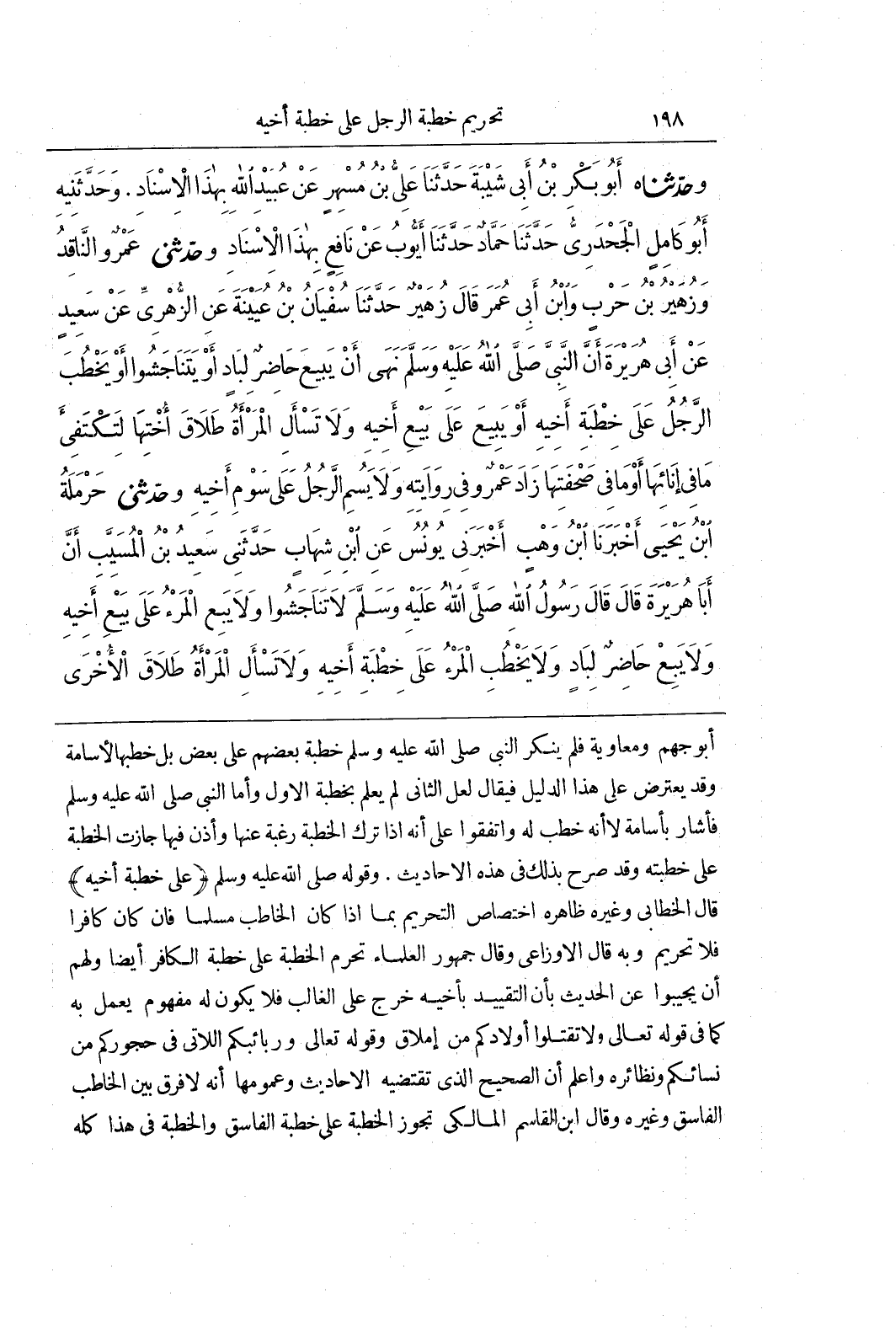 أَبُو جَهْمٍ وَمُعَاوِيَةُ فَلَمْ يُنْكِرِ النَّبِيُّ صَلَّى اللَّهُ عَلَيْهِ وَسَلَّمَ خِطْبَةَ بَعْضِهِمْ عَلَى بَعْضٍ بَلْ خَطَبَهَا لِأُسَامَةَ وَقَدْ يُعْتَرَضُ عَلَى هَذَا الدَّلِيلِ فَيُقَالُ لَعَلَّ الثَّانِي لَمْ يَعْلَمْ بِخِطْبَةِ الْأَوَّلِ وَأَمَّا النَّبِيُّ صَلَّى اللَّهُ عَلَيْهِ وَسَلَّمَ فَأَشَارَ بِأُسَامَةَ لَا أَنَّهُ خَطَبَ لَهُ وَاتَّفَقُوا عَلَى أَنَّهُ إِذَا تَرَكَ الْخِطْبَةَ رَغْبَةً عَنْهَا وَأَذِنَ فِيهَا جَازَتِ الْخِطْبَةُ عَلَى خِطْبَتِهِ وَقَدْ صُرِّحَ بِذَلِكَ فِي هَذِهِ الْأَحَادِيثِ