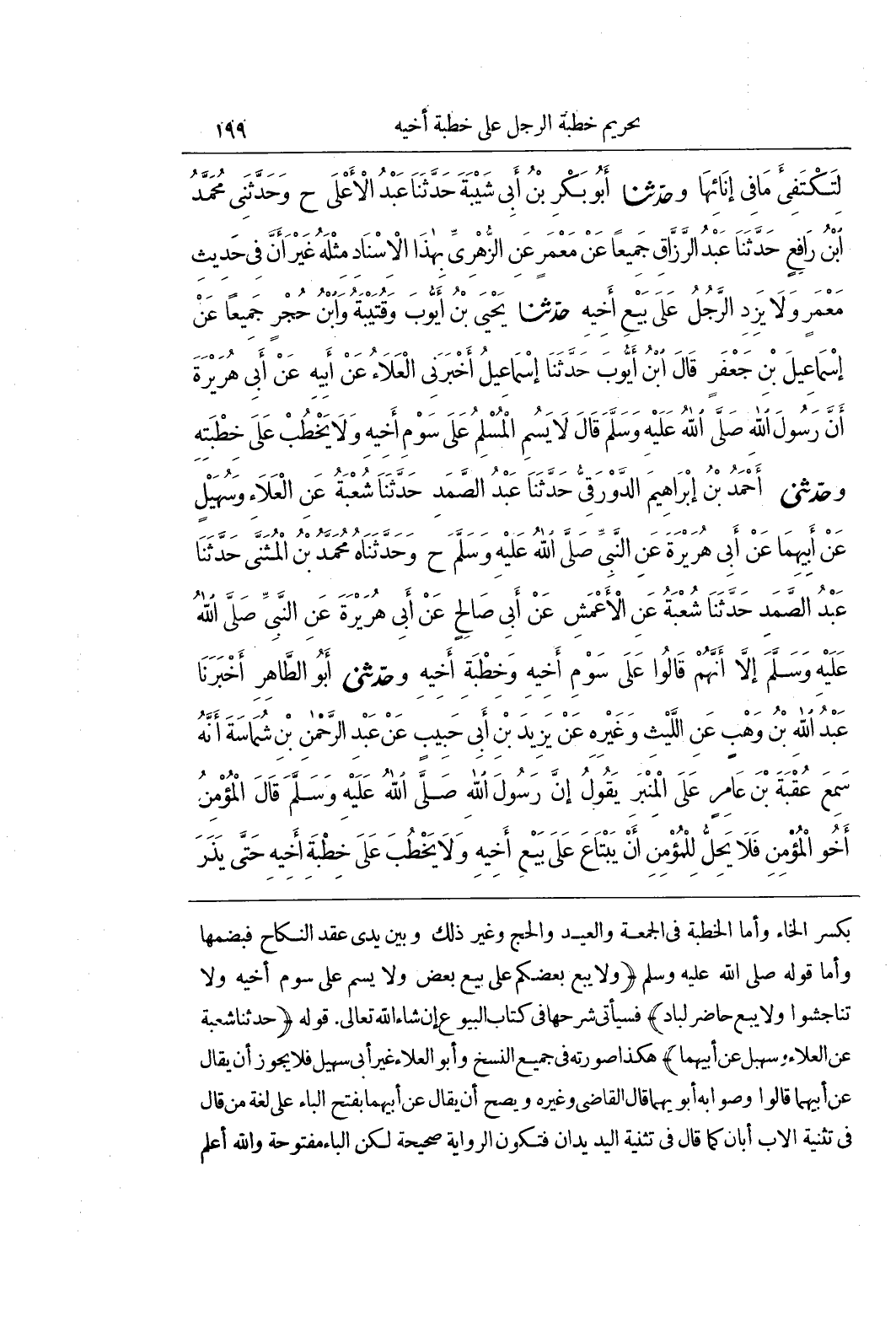 بِكَسْرِ الْخَاءِ وَأَمَّا الْخُطْبَةُ فِي الْجُمُعَةِ وَالْعِيدِ وَالْحَجِّ وَغَيْرِ ذَلِكَ وَبَيْنَ يَدَيْ عَقْدِ النِّكَاحِ فَبِضَمِّهَا وَأَمَّا قَوْلُهُ صَلَّى اللَّهُ عَلَيْهِ وَسَلَّمَ (وَلَا يَبِعْ بَعْضُكُمْ عَلَى بَيْعِ بَعْضٍ وَلَا يَسُمْ عَلَى سَوْمِ أَخِيهِ وَلَا تَنَاجَشُوا وَلَا يَبِعْ حَاضِرٌ لِبَادٍ) فَسَيَأْتِي شَرْحُهَا فِي كِتَابِ الْبُيُوعِ إِنْ شَاءَ اللَّهُ تَعَالَى قَوْلُهُ (حَدَّثَنَا شُعْبَةُ عَنِ الْعَلَاءِ وَسُهَيْلٍ عَنْ أَبِيهِمَا) هَكَذَا صورته في جميع النسخ وأبو الْعَلَاءِ غَيْرُ أَبِي سُهَيْلٍ فَلَا يَجُوزُ أَنْ يُقَالَ عَنْ أَبِيهِمَا قَالُوا وَصَوَابُهُ أَبَوَيْهِمَا قَالَ الْقَاضِي وَغَيْرُهُ وَيَصِحُّ أَنْ يُقَالَ عَنْ أَبَيْهِمَا بِفَتْحِ الْبَاءِ عَلَى لُغَةِ مَنْ قَالَ فِي تَثْنِيَةِ الْأَبِ أَبَانِ كَمَا قَالَ فِي تَثْنِيَةِ الْيَدِ يَدَانِ فَتَكُونُ الرِّوَايَةُ صَحِيحَةً لَكِنَّ الْبَاءَ مفتوحة والله أعلم