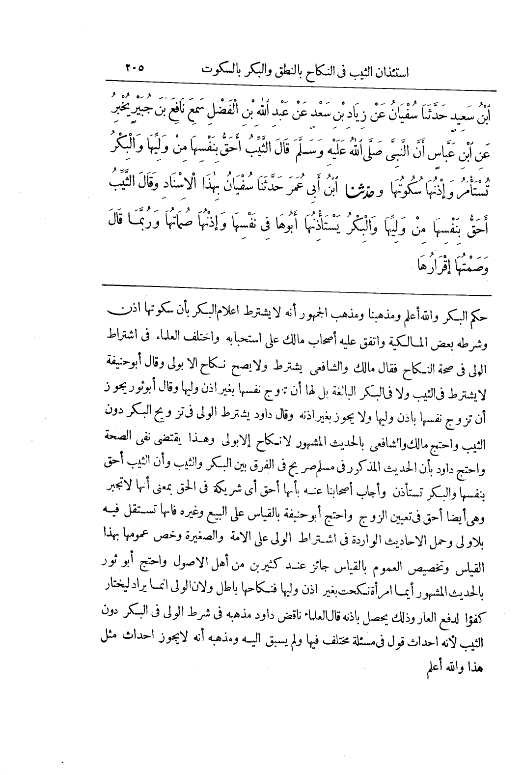 حُكْمُ الْبِكْرِ وَاللَّهُ أَعْلَمُ وَمَذْهَبُنَا وَمَذْهَبُ الْجُمْهُورِ أَنَّهُ لَا يُشْتَرَطُ إِعْلَامُ الْبِكْرِ بِأَنَّ سُكُوتَهَا إِذْنٌ وَشَرَطَهُ بَعْضُ الْمَالِكِيَّةِ وَاتَّفَقَ عَلَيْهِ أَصْحَابُ مَالِكٍ عَلَى اسْتِحْبَابِهِ وَاخْتَلَفَ الْعُلَمَاءُ فِي اشْتِرَاطِ الْوَلِيِّ فِي صِحَّةِ النِّكَاحِ فَقَالَ مَالِكٌ وَالشَّافِعِيُّ يُشْتَرَطُ وَلَا يَصِحُّ نِكَاحٌ إِلَّا بِوَلِيٍّ وَقَالَ أَبُو حَنِيفَةَ لَا يُشْتَرَطُ فِي الثَّيِّبِ وَلَا فِي الْبِكْرِ الْبَالِغَةِ بَلْ لَهَا أَنْ تُزَوِّجَ نَفْسَهَا بِغَيْرِ إِذْنِ وَلِيِّهَا وَقَالَ أَبُو ثَوْرٍ يَجُوزُ أَنْ تُزَوِّجَ نَفْسَهَا بِإِذْنِ وَلِيِّهَا وَلَا يَجُوزُ بِغَيْرِ إِذْنِهِ وَقَالَ دَاوُدُ يُشْتَرَطُ الْوَلِيُّ فِي تَزْوِيجِ الْبِكْرِ دُونَ الثَّيِّبِ وَاحْتَجَّ مَالِكٌ وَالشَّافِعِيُّ بِالْحَدِيثِ الْمَشْهُورِ لَا نِكَاحَ إِلَّا بِوَلِيٍّ وَهَذَا يَقْتَضِي نَفْيَ الصِّحَّةِ وَاحْتَجَّ دَاوُدُ بِأَنَّ الْحَدِيثَ الْمَذْكُورَ فِي مُسْلِمٍ صَرِيحٌ فِي الْفَرْقِ بَيْنَ الْبِكْرِ وَالثَّيِّبِ وَأَنَّ الثَّيِّبَ أَحَقُّ بِنَفْسِهَا وَالْبِكْرُ تُسْتَأْذَنُ وَأَجَابَ أَصْحَابُنَا عَنْهُ بِأَنَّهَا أَحَقُّ أَيْ شَرِيكَةٌ فِي الْحَقِّ بِمَعْنَى أَنَّهَا لَا تُجْبَرُ وَهِيَ أَيْضًا أَحَقُّ فِي تَعْيِينِ الزَّوْجِ وَاحْتَجَّ أَبُو حَنِيفَةَ بِالْقِيَاسِ عَلَى الْبَيْعِ وَغَيْرِهِ فَإِنَّهَا تَسْتَقِلُّ فِيهِ بِلَا وَلِيٍّ وَحَمَلَ الْأَحَادِيثَ الْوَارِدَةَ فِي اشْتِرَاطِ الْوَلِيِّ عَلَى الْأَمَةِ وَالصَّغِيرَةِ وَخَصَّ عُمُومَهَا بِهَذَا الْقِيَاسِ وَتَخْصِيصُ الْعُمُومِ بِالْقِيَاسِ جَائِزٌ عِنْدَ كَثِيرِينَ مِنْ أَهْلِ الْأُصُولِ وَاحْتَجَّ أَبُو ثَوْرٍ بِالْحَدِيثِ الْمَشْهُورِ أَيُّمَا امْرَأَةٍ نَكَحَتْ بِغَيْرِ إِذْنِ وَلِيِّهَا فَنِكَاحُهَا بَاطِلٌ وَلِأَنَّ الْوَلِيَّ إِنَّمَا يُرَادُ لِيَخْتَارَ كُفُؤًا لِدَفْعِ الْعَارِ وَذَلِكَ يَحْصُلُ بِإِذْنِهِ قَالَ الْعُلَمَاءُ نَاقَضَ دَاوُدُ مَذْهَبَهُ في شرط الولي في البكر دون الثيب لِأَنَّهُ إِحْدَاثُ قَوْلٍ فِي مَسْأَلَةٍ مُخْتَلَفٌ فِيهَا وَلَمْ يُسْبَقْ إِلَيْهِ وَمَذْهَبُهُ أَنَّهُ لَا يَجُوزُ احداث مثل هذا والله أعلم