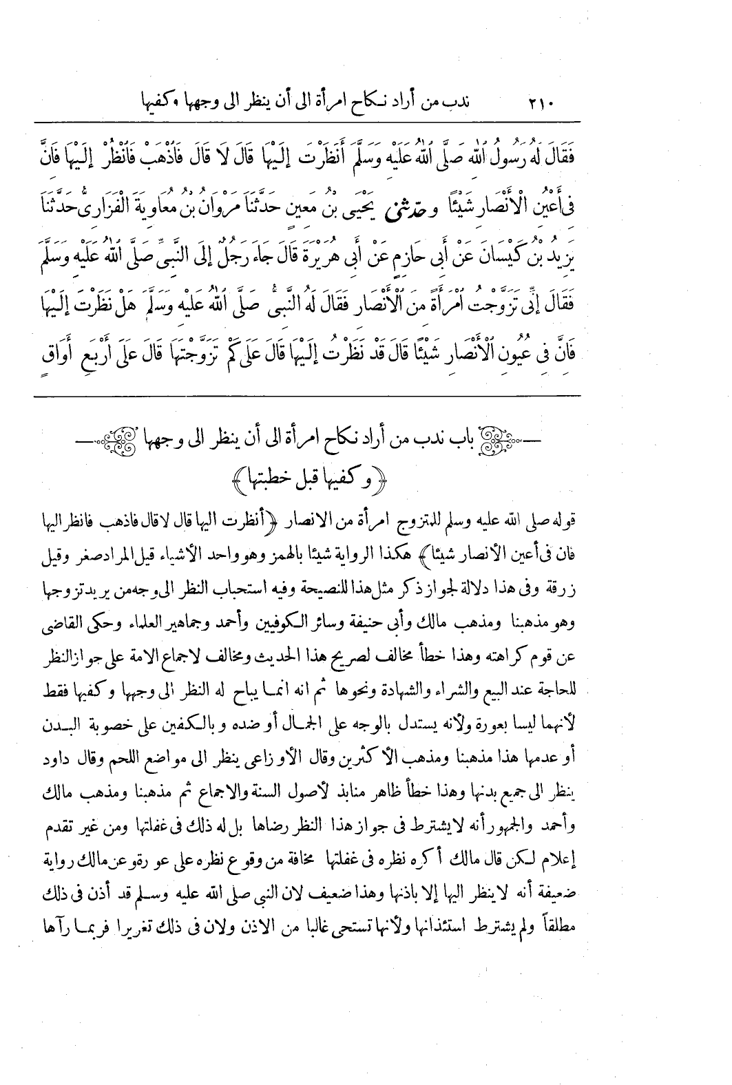 (وكفيها قبل خطبتها) قَوْلُهُ صَلَّى اللَّهُ عَلَيْهِ وَسَلَّمَ لِلْمُتَزَوِّجِ امْرَأَةً مِنَ الْأَنْصَارِ (أَنَظَرْتَ إِلَيْهَا قَالَ لَا قَالَ فَاذْهَبْ فَانْظُرْ إِلَيْهَا فَإِنَّ فِي أَعْيُنِ الْأَنْصَارِ شيئا) هكذا الرواية شيئا بالهمز وَهُوَ وَاحِدُ الْأَشْيَاءِ قِيلَ الْمُرَادُ صِغَرٌ وَقِيلَ زُرْقَةٌ وَفِي هَذَا دَلَالَةٌ لِجَوَازِ ذِكْرِ مِثْلِ هَذَا لِلنَّصِيحَةِ وَفِيهِ اسْتِحْبَابُ النَّظَرِ إِلَى وَجْهِ مَنْ يُرِيدُ تَزَوُّجَهَا وَهُوَ مَذْهَبُنَا وَمَذْهَبُ مَالِكٍ وَأَبِي حَنِيفَةَ وَسَائِرِ الْكُوفِيِّينَ وَأَحْمَدَ وَجَمَاهِيرِ الْعُلَمَاءِ وَحَكَى الْقَاضِي عَنْ قَوْمٍ كَرَاهَتَهُ وَهَذَا خَطَأٌ مُخَالِفٌ لِصَرِيحِ هَذَا الْحَدِيثِ وَمُخَالِفٌ لِإِجْمَاعِ الْأُمَّةِ عَلَى جَوَازِ النَّظَرِ لِلْحَاجَةِ عِنْدَ الْبَيْعِ وَالشِّرَاءِ وَالشَّهَادَةِ وَنَحْوِهَا ثُمَّ إِنَّهُ إِنَّمَا يُبَاحُ لَهُ النظر إلى وجهها وكفيها فقط لأنهما ليسا بعورة ولأنه يُسْتَدَلُّ بِالْوَجْهِ عَلَى الْجَمَالِ أَوْ ضِدِّهِ وَبِالْكَفَّيْنِ عَلَى خُصُوبَةِ الْبَدَنِ أَوْ عَدَمِهَا هَذَا مَذْهَبُنَا وَمَذْهَبُ الْأَكْثَرِينَ وَقَالَ الْأَوْزَاعِيُّ يَنْظُرُ إِلَى مَوَاضِعِ اللَّحْمِ وَقَالَ دَاوُدُ يَنْظُرُ إِلَى جَمِيعِ بَدَنِهَا وَهَذَا خَطَأٌ ظَاهِرٌ مُنَابِذٌ لِأُصُولِ السُّنَّةِ وَالْإِجْمَاعِ ثُمَّ مَذْهَبُنَا وَمَذْهَبُ مَالِكٍ وَأَحْمَدَ وَالْجُمْهُورِ أَنَّهُ لَا يُشْتَرَطُ فِي جَوَازِ هَذَا النَّظَرِ رِضَاهَا بَلْ لَهُ ذَلِكَ فِي غَفْلَتِهَا وَمِنْ غَيْرِ تَقَدُّمِ إِعْلَامٍ لَكِنْ قَالَ مَالِكٌ أَكْرَهُ نَظَرَهُ فِي غَفْلَتِهَا مَخَافَةً مِنْ وُقُوعِ نَظَرِهِ عَلَى عَوْرَةٍ وَعَنْ مَالِكٍ رِوَايَةٌ ضَعِيفَةٌ أَنَّهُ لَا ينظر اليها إلا بإذنها وهذا ضعيف لِأَنَّ النَّبِيَّ صَلَّى اللَّهُ عَلَيْهِ وَسَلَّمَ قَدْ أَذِنَ فِي ذَلِكَ مُطْلَقًا وَلَمْ يَشْتَرِطِ اسْتِئْذَانَهَا ولأنها تستحي غَالِبًا مِنَ الْإِذْنِ وَلِأَنَّ فِي ذَلِكَ تَغْرِيرًا فربما رآها