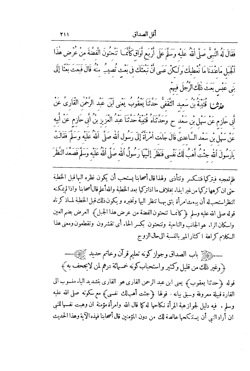(باب الصَّدَاقِ وَجَوَازِ كونه تعليم قرآن وخاتم حديد)