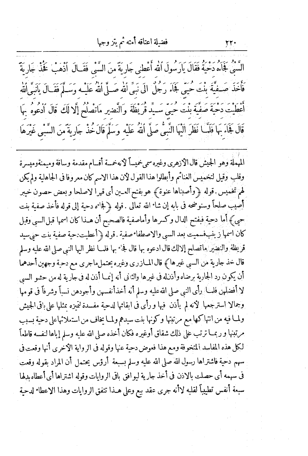 الْمُهْمَلَةِ وَهُوَ الْجَيْشُ قَالَ الْأَزْهَرِيُّ وَغَيْرُهُ سُمِّيَ خميسا لِأَنَّهُ خَمْسَةُ أَقْسَامٍ مُقَدِّمَةٌ وَسَاقَةٌ وَمَيْمَنَةٌ وَمَيْسَرَةٌ وقلب وقيل لتخميس الغنائم وأبطلوا هذا القول لِأَنَّ هَذَا الِاسْمَ كَانَ مَعْرُوفًا فِي الْجَاهِلِيَّةِ وَلَمْ يَكُنْ لَهُمْ تَخْمِيسٌ قَوْلُهُ (وَأَصَبْنَاهَا عَنْوَةً) هُوَ بِفَتْحِ الْعَيْنِ أَيْ قَهْرًا لَا صُلْحًا وَبَعْضُ حُصُونِ خَيْبَرَ أُصِيبَ صُلْحًا وَسَنُوَضِّحُهُ فِي بَابِهِ إِنْ شَاءَ اللَّهُ تَعَالَى قَوْلُهُ (فَجَاءَهُ دِحْيَةُ إِلَى قَوْلِهِ فَأَخَذَ صَفِيَّةَ بِنْتَ حُيَيٍّ) أَمَّا دِحْيَةُ فَبِفَتْحِ الدَّالِ وَكَسْرِهَا وَأَمَّا صَفِيَّةُ فَالصَّحِيحُ أَنَّ هَذَا كَانَ اسْمَهَا قَبْلَ السَّبْيِ وَقِيلَ كَانَ اسْمَهَا زَيْنَبُ فَسُمِّيَتْ بَعْدَ السَّبْيِ وَالِاصْطِفَاءِ صَفِيَّةَ قَوْلُهُ (أَعْطَيْتَ دِحْيَةَ صَفِيَّةَ بِنْتَ حُيَيٍّ سَيِّدِ قُرَيْظَةَ وَالنَّضِيرِ مَا تَصْلُحُ إِلَّا لَكَ قَالَ ادْعُوهُ بِهَا قَالَ فَجَاءَ بِهَا فَلَمَّا نَظَرَ إِلَيْهَا النَّبِيُّ صَلَّى اللَّهُ عَلَيْهِ وَسَلَّمَ قَالَ خُذْ جَارِيَةً مِنَ السَّبْيِ غَيْرَهَا) قَالَ الْمَازِرِيُّ وَغَيْرُهُ يَحْتَمِلُ مَا جَرَى مَعَ دِحْيَةَ وَجْهَيْنِ أَحَدُهُمَا أَنْ يَكُونَ رَدَّ الْجَارِيَةَ بِرِضَاهُ وَأَذِنَ لَهُ فِي غَيْرِهَا وَالثَّانِي أَنَّهُ إِنَّمَا أَذِنَ لَهُ فِي جَارِيَةٍ لَهُ مِنْ حَشْوِ السَّبْيِ لَا أَفْضَلَهُنَّ فَلَمَّا رَأَى النَّبِيُّ صَلَّى اللَّهُ عَلَيْهِ وَسَلَّمَ أَنَّهُ أَخَذَ أَنْفَسَهُنَّ وأجودهن نسبا وشرفا في قومها وجمالا استرجعها لِأَنَّهُ لَمْ يَأْذَنْ فِيهَا وَرَأَى فِي إِبْقَائِهَا لِدِحْيَةَ مَفْسَدَةً لِتَمَيُّزِهِ بِمِثْلِهَا عَلَى بَاقِي الْجَيْشِ وَلِمَا فِيهِ مِنَ انْتِهَاكِهَا مَعَ مَرْتَبَتِهَا وَكَوْنِهَا بِنْتَ سَيِّدِهِمْ وَلِمَا يَخَافُ مِنَ اسْتِعْلَائِهَا عَلَى دِحْيَةَ بِسَبَبِ مَرْتَبَتِهَا وَرُبَّمَا تَرَتَّبَ عَلَى ذَلِكَ شِقَاقٌ أَوْ غَيْرُهُ فَكَانَ أَخْذُهُ صَلَّى اللَّهُ عَلَيْهِ وَسَلَّمَ إِيَّاهَا لِنَفْسِهِ قَاطِعًا لِكُلِّ هَذِهِ الْمَفَاسِدِ الْمُتَخَوَّفَةِ وَمَعَ هَذَا فَعَوَّضَ دِحْيَةَ عَنْهَا وَقَوْلُهُ فِي الرِّوَايَةِ الْأُخْرَى إِنَّهَا وَقَعَتْ فِي سَهْمِ دِحْيَةَ فَاشْتَرَاهَا رَسُولُ اللَّهِ صَلَّى اللَّهُ عَلَيْهِ وَسَلَّمَ بِسَبْعَةِ أَرْؤُسٍ يَحْتَمِلُ أَنَّ الْمُرَادَ بِقَوْلِهِ وَقَعَتْ فِي سَهْمِهِ أَيْ حَصَلَتْ بِالْإِذْنِ فِي أَخْذِ جَارِيَةٍ لِيُوَافِقَ بَاقِي الرِّوَايَاتِ وَقَوْلُهُ اشْتَرَاهَا أَيْ أَعْطَاهُ بَدَلَهَا سَبْعَةَ أَنْفُسٍ تَطْيِيبًا لِقَلْبِهِ لَا أَنَّهُ جَرَى عَقْدَ بَيْعٍ وَعَلَى هَذَا تَتَّفِقُ الرِّوَايَاتُ وَهَذَا الْإِعْطَاءُ لِدِحْيَةَ