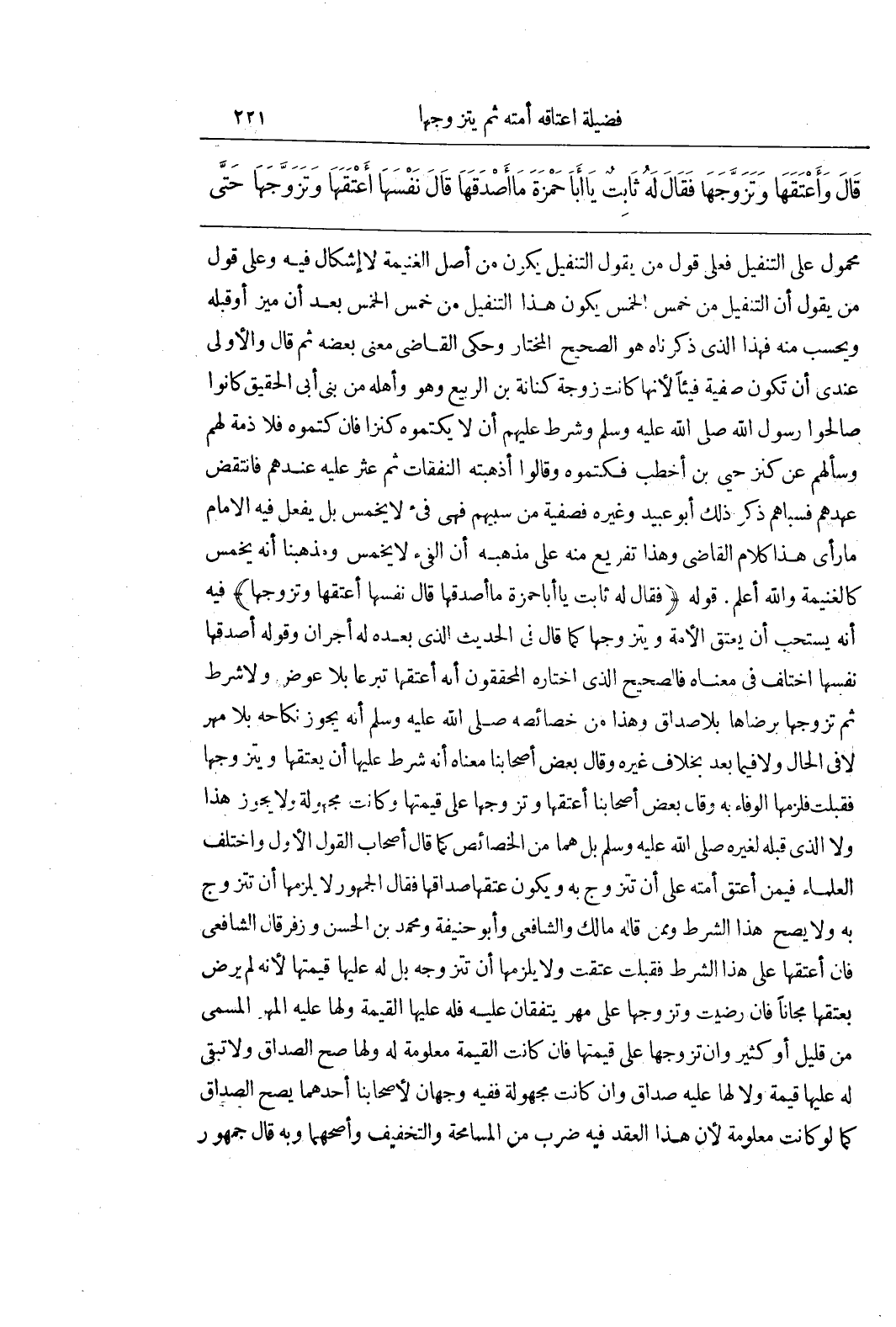 مَحْمُولٌ عَلَى التَّنْفِيلِ فَعَلَى قَوْلِ مَنْ يَقُولُ التَّنْفِيلُ يَكُونُ مِنْ أَصْلِ الْغَنِيمَةِ لَا إِشْكَالَ فِيهِ وَعَلَى قَوْلِ مَنْ يَقُولُ إِنَّ التَّنْفِيلَ مِنْ خُمُسِ الْخُمُسِ يَكُونُ هَذَا التَّنْفِيلُ مِنْ خُمُسِ الْخُمُسِ بَعْدَ أَنْ مُيِّزَ أَوْ قَبْلَهُ وَيُحْسَبُ مِنْهُ فَهَذَا الَّذِي ذَكَرْنَاهُ هُوَ الصَّحِيحُ الْمُخْتَارُ وَحَكَى الْقَاضِي مَعْنَى بَعْضِهِ ثُمَّ قَالَ وَالْأَوْلَى عِنْدِي أَنْ تَكُونَ صَفِيَّةُ فَيْئًا لِأَنَّهَا كَانَتْ زَوْجَةَ كِنَانَةَ بْنِ الرَّبِيعِ وَهُوَ وَأَهْلُهُ مِنْ بَنِي أَبِي الْحَقِيقِ كَانُوا صَالَحُوا رَسُولَ اللَّهِ صَلَّى اللَّهُ عَلَيْهِ وَسَلَّمَ وَشَرَطَ عَلَيْهِمْ أنْ لَا يَكْتُمُوهُ كَنْزًا فَإِنْ كَتَمُوهُ فَلَا ذِمَّةَ لَهُمْ وَسَأَلَهُمْ عَنْ كَنْزِ حُيَيِّ بْنِ أَخْطَبَ فَكَتَمُوهُ وَقَالُوا أَذْهَبَتْهُ النَّفَقَاتُ ثُمَّ عَثَرَ عَلَيْهِ عِنْدَهُمْ فَانْتَقَضَ عَهْدَهُمْ فَسَبَاهُمْ ذَكَرَ ذَلِكَ أَبُو عُبَيْدٍ وَغَيْرُهُ فَصَفِيَّةُ مِنْ سَبْيِهِمْ فَهِيَ فَيْءٌ لَا يُخَمَّسُ بَلْ يَفْعَلُ فِيهِ الْإِمَامُ مَا رَأَى هَذَا كَلَامُ الْقَاضِي وَهَذَا تَفْرِيعٌ مِنْهُ عَلَى مَذْهَبِهِ أَنَّ الْفَيْءَ لَا يُخَمَّسُ وَمَذْهَبُنَا أَنَّهُ يُخَمَّسُ كَالْغَنِيمَةِ وَاللَّهُ أَعْلَمُ قَوْلُهُ (فَقَالَ لَهُ ثَابِتٌ يَا أَبَا حَمْزَةَ مَا أَصْدَقَهَا قَالَ نَفْسَهَا أَعْتَقَهَا وَتَزَوَّجَهَا) فِيهِ أَنَّهُ يُسْتَحَبُّ أَنْ يُعْتِقَ الْأَمَةَ وَيَتَزَوَّجَهَا كَمَا قَالَ فِي الْحَدِيثِ الَّذِي بَعْدَهُ لَهُ أَجْرَانِ وَقَوْلُهُ أَصْدَقَهَا نَفْسَهَا اخْتُلِفَ فِي مَعْنَاهُ فَالصَّحِيحُ الَّذِي اخْتَارَهُ الْمُحَقِّقُونَ أَنَّهُ أَعْتَقَهَا تَبَرُّعًا بِلَا عِوَضٍ وَلَا شَرْطٍ ثُمَّ تَزَوَّجَهَا بِرِضَاهَا بِلَا صَدَاقٍ وَهَذَا مِنْ خَصَائِصِهِ صَلَّى اللَّهُ عَلَيْهِ وَسَلَّمَ أَنَّهُ يَجُوزُ نِكَاحُهُ بِلَا مَهْرٍ لَا فِي الْحَالِ وَلَا فِيمَا بَعْدُ بِخِلَافِ غَيْرِهِ وَقَالَ بَعْضُ أَصْحَابِنَا مَعْنَاهُ أَنَّهُ شَرَطَ عَلَيْهَا أَنْ يُعْتِقَهَا وَيَتَزَوَّجَهَا فَقَبِلَتْ فَلَزِمَهَا الْوَفَاءُ بِهِ وَقَالَ بَعْضُ أَصْحَابِنَا أَعْتَقَهَا وَتَزَوَّجَهَا عَلَى قِيمَتِهَا وَكَانَتْ مَجْهُولَةٌ وَلَا يَجُوزُ هَذَا وَلَا الَّذِي قَبْلَهُ لِغَيْرِهِ صَلَّى اللَّهُ عَلَيْهِ وَسَلَّمَ بَلْ هُمَا مِنَ الْخَصَائِصِ كَمَا قَالَ أَصْحَابُ الْقَوْلِ الْأَوَّلِ وَاخْتَلَفَ الْعُلَمَاءُ فِيمَنْ أَعْتَقَ أَمَتَهُ عَلَى أَنْ تَتَزَوَّجَ بِهِ وَيَكُونَ عِتْقُهَا صَدَاقَهَا فَقَالَ الْجُمْهُورُ لَا يَلْزَمُهَا أَنْ تَتَزَوَّجَ بِهِ وَلَا يَصِحُّ هَذَا الشَّرْطُ وَمِمَّنْ قَالَهُ مَالِكٌ وَالشَّافِعِيُّ وَأَبُو حَنِيفَةَ وَمُحَمَّدُ بْنُ الْحَسَنِ وَزُفَرُ قَالَ الشَّافِعِيُّ فَإِنْ أَعْتَقَهَا عَلَى هَذَا الشَّرْطِ فَقَبِلَتْ عَتَقَتْ وَلَا يَلْزَمُهَا أَنْ تَتَزَوَّجَهُ بَلْ لَهُ عَلَيْهَا قيمتها لِأَنَّهُ لَمْ يَرْضَ بِعِتْقِهَا مَجَّانًا فَإِنْ رَضِيَتْ وَتَزَوَّجَهَا عَلَى مَهْرٍ يَتَّفِقَانِ عَلَيْهِ فَلَهُ عَلَيْهَا الْقِيمَةُ وَلَهَا عَلَيْهِ الْمَهْرُ الْمُسَمَّى مِنْ قَلِيلٍ أَوْ كَثِيرٍ وَإِنْ تَزَوَّجَهَا عَلَى قِيمَتِهَا فَإِنْ كَانَتِ الْقِيمَةُ مَعْلُومَةً لَهُ وَلَهَا صَحَّ الصَّدَاقُ وَلَا تَبْقَى لَهُ عَلَيْهَا قِيمَةٌ وَلَا لَهَا عَلَيْهِ صَدَاقٌ وَإِنْ كَانَتْ مَجْهُولَةً فَفِيهِ وَجْهَانِ لِأَصْحَابِنَا أَحَدُهُمَا يَصِحُّ الصَّدَاقُ كَمَا لَوْ كَانَتْ معلومة لِأَنَّ هَذَا الْعَقْدَ فِيهِ ضَرْبٌ مِنَ الْمُسَامَحَةِ وَالتَّخْفِيفِ وَأَصَحُّهُمَا وَبِهِ قَالَ جُمْ